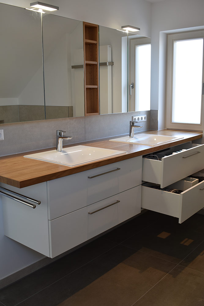 Das Bad wurde im Materialmix Eiche Leimholz und Kunststoff weiß perl ausgeführt. Die Unterschränke mit Schubkästen wurden am Sifon ausgeschnitten. Der Spiegelschrank verfügt über einen offenen Bereich und einen Doppelspiegel. Der Wandschrank ist mittig offen, ähnlich wie beim Spiegelschrank.