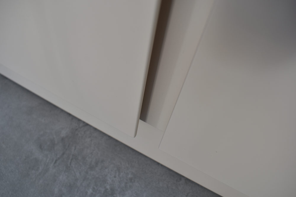 Die Flurmöbel, bestehend aus einem Einbauschrank mit Schüben innen, einem hängenden Sideboard mit Schubladen und darunterliegender eine Klappe, um diverse Kabel und technisches Equipment zu kaschieren. Die Garderobe verfügt über eine Hakenplatte und einen geschlossenen Schrank mit einer Sitzbank. Alle Fronten sind grifflos ausgeführt und lassen sich über Griffschrägen öffnen.