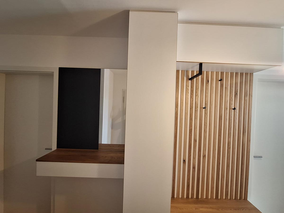 Bei der Garderobe In C-Form wurden die weißen Flächen von geölten Kanten in Eiche umrandet. Der Schwarze Garderobenbügel passt zur gegenüberliegenden Magnetwand neben dem Spiegel.