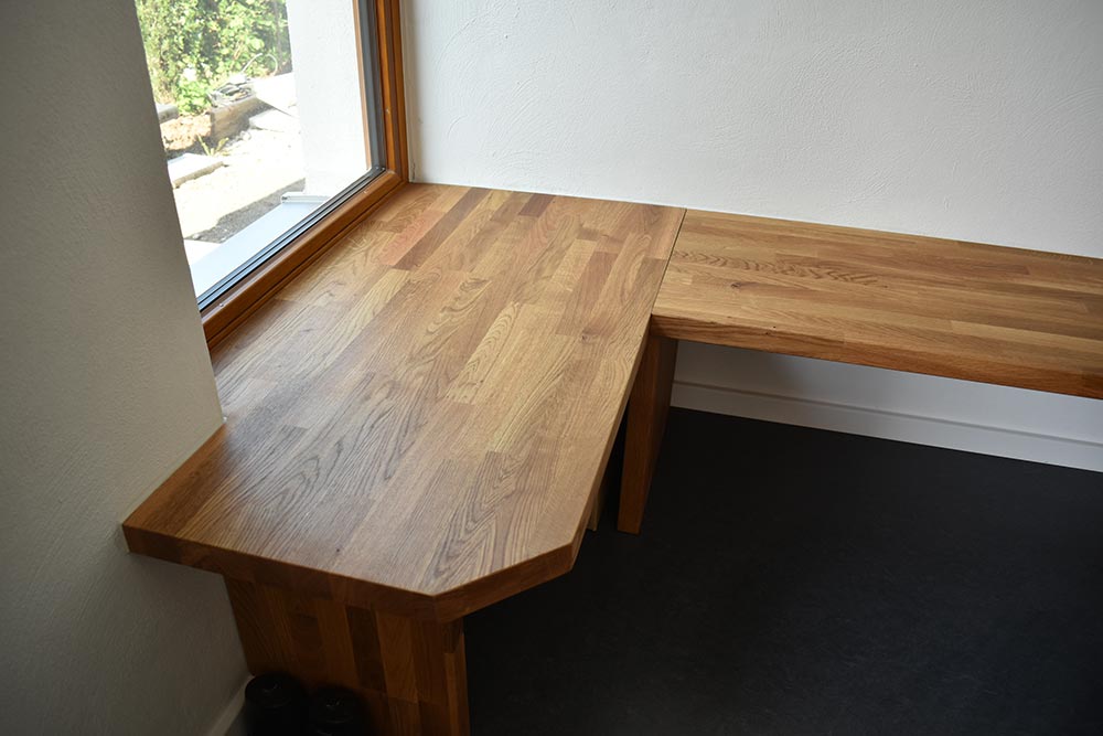 Die 3-seitige Sitzbank über Eck wurde in Eiche massiv / geölt mit mehreren Stellwangen ausgeführt. Die Sitzfläche wurde bis in Fensterlaibung laufend umgesetzt. Der Esstisch wurde mit Metallkufen aus rohstahl ausgestattet, die Tischplatte ist ebenfalls aus Eiche massiv und zusätzlich mit Wuchsrand.