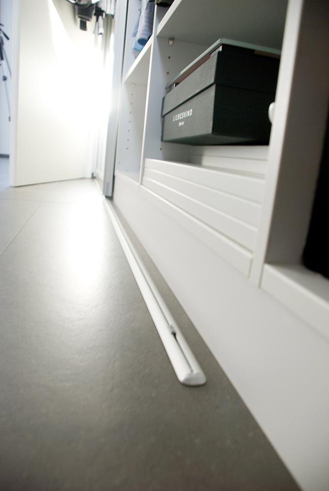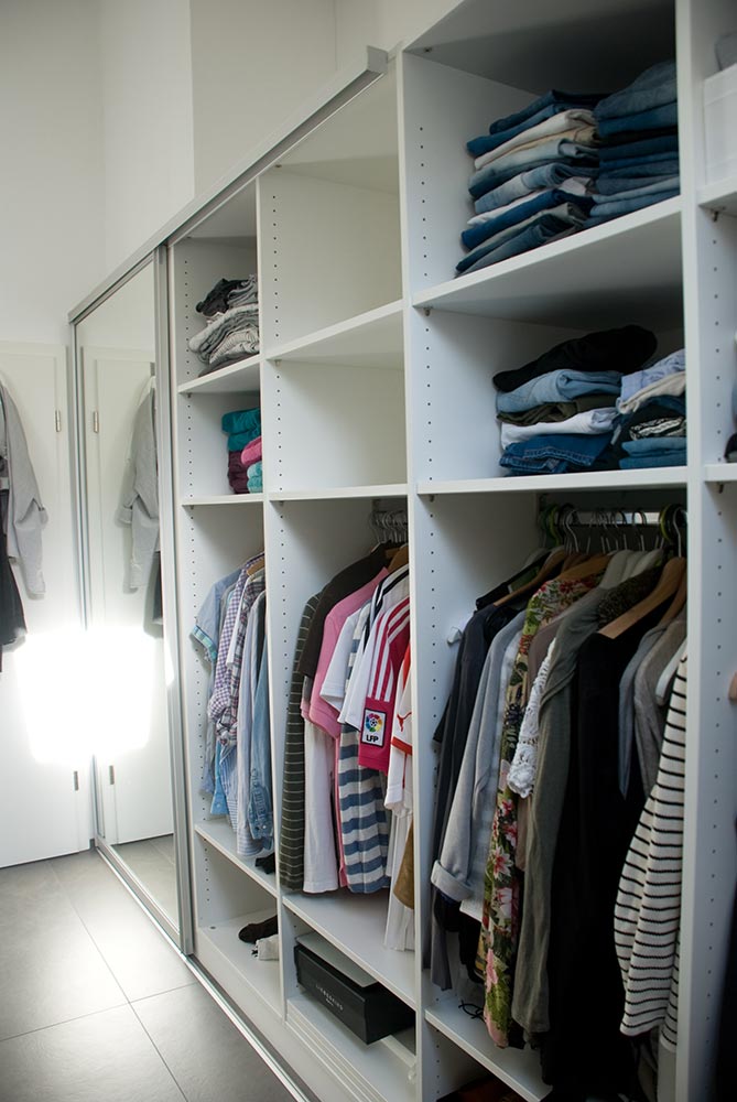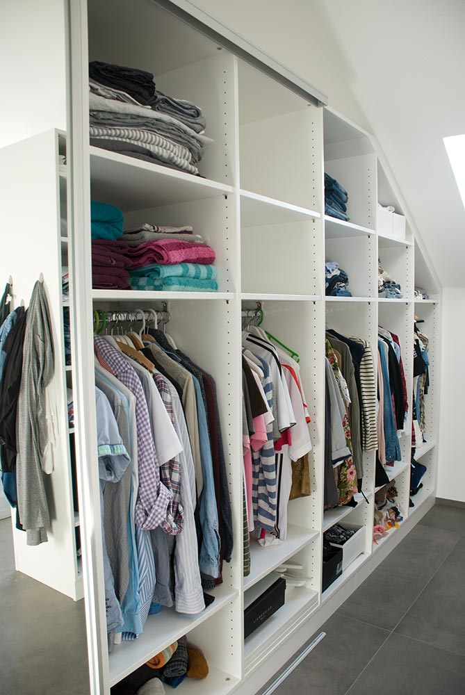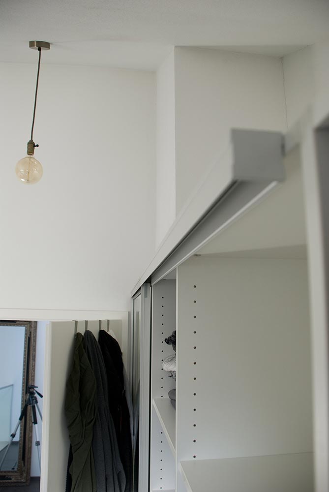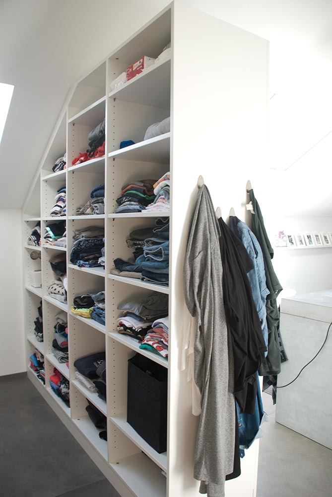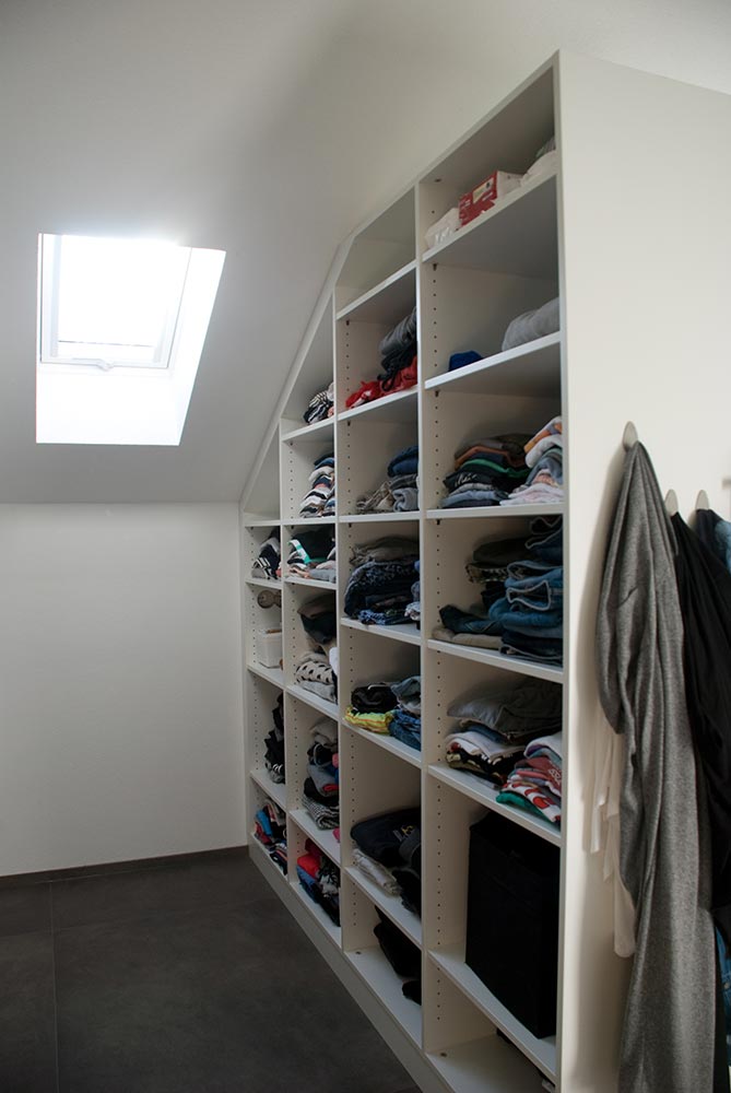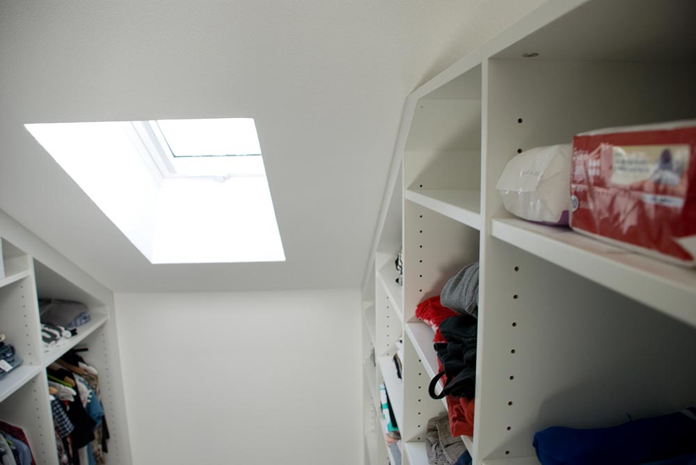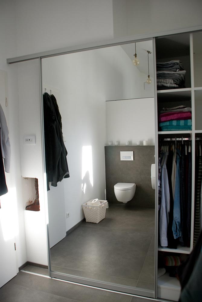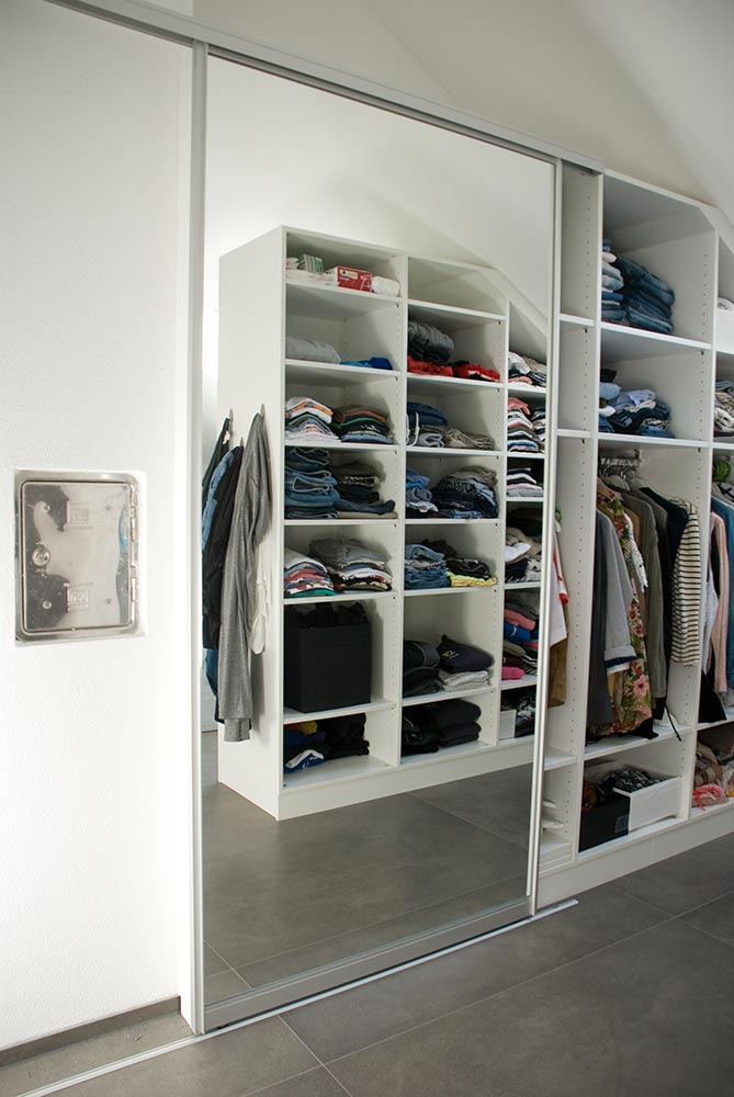 Die Ankleide wurde in die Schräge eingepasst und dient gleichzeitig als Abtrennung zum Bad- und Schlafbereich. Die Schrankelemente sind mit Fachböden und Kleiderstangen ausgestattet . Links wurde eine Gleittüre mit Spiegel integriert, um die Techniköffnungen und einen Abwurfschacht zu verstecken.
