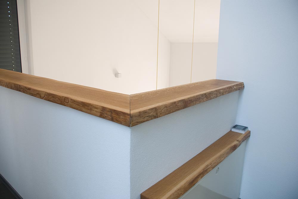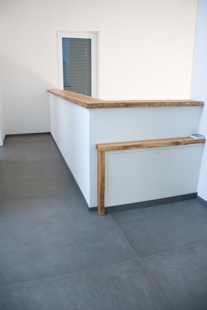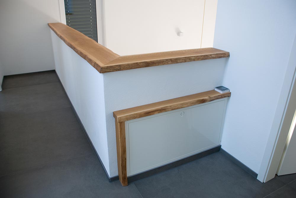 Die Ablage wurde in massiven Eichedielen mit Wuchskanten ausgeführt. Die Oberfläche wurde geölt, die Ecken der oberen Ablage sind auf Gehrung geschnitten. Darunter wurde die Abdeckung des Heizungsverteilers im gleichen Stil ergänzt.