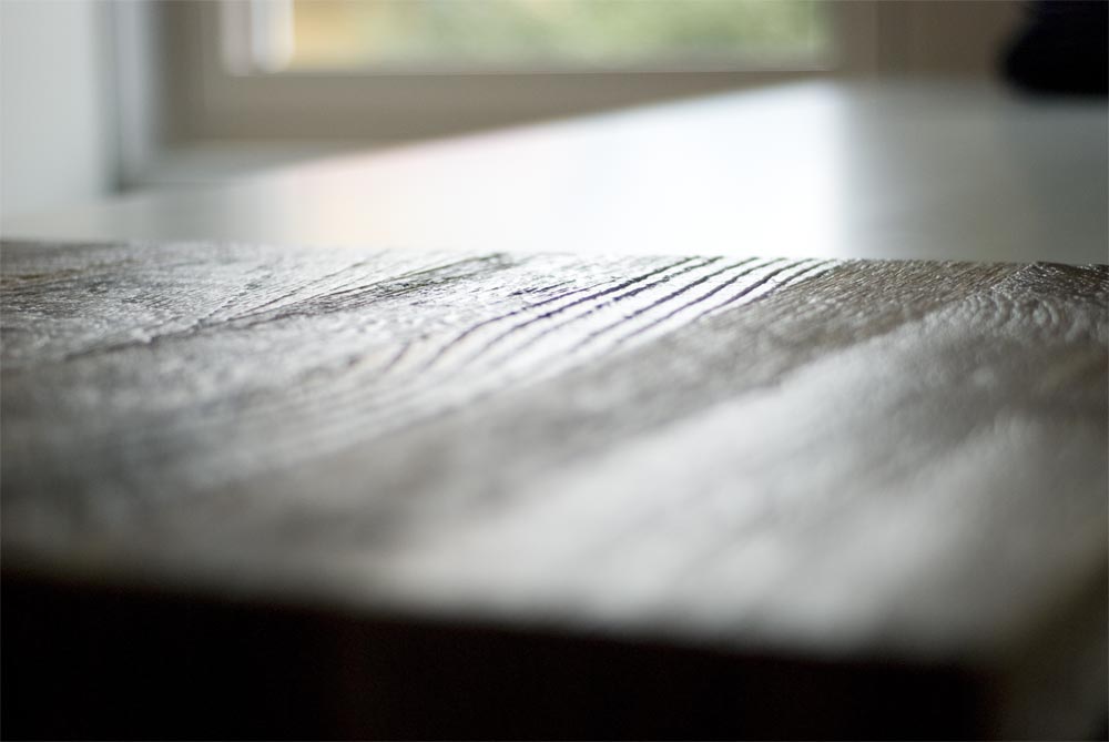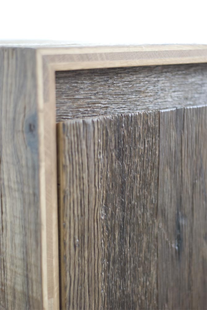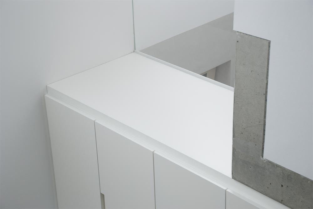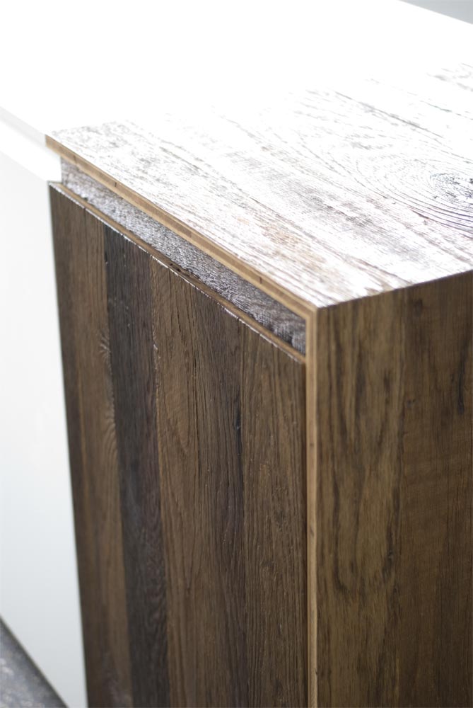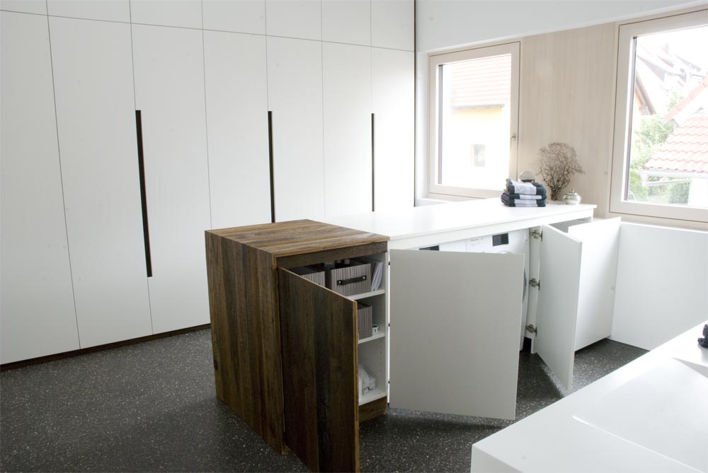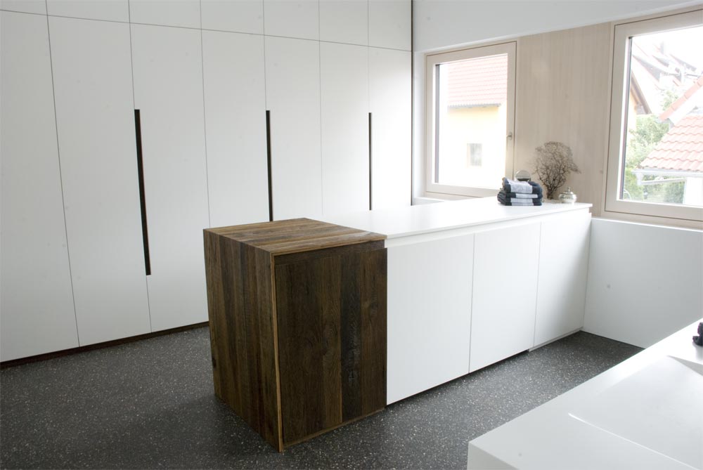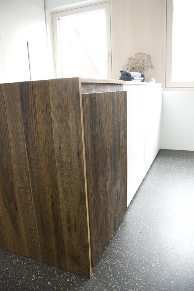 Der Bad-Unterschrank ist beidseitig bedienbar und mit einem Block aus Altholz Eiche ergänzt. Darin sind die Waschmaschine und der Trockner versteckt. Die Öffnung wurde mit einer abgeschrägter Front versehen.