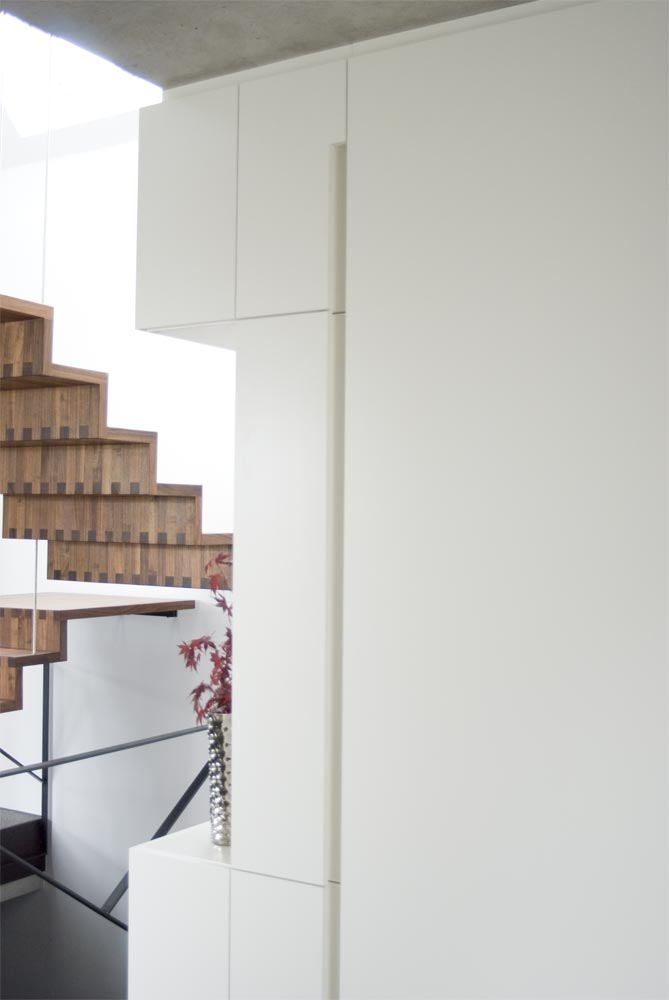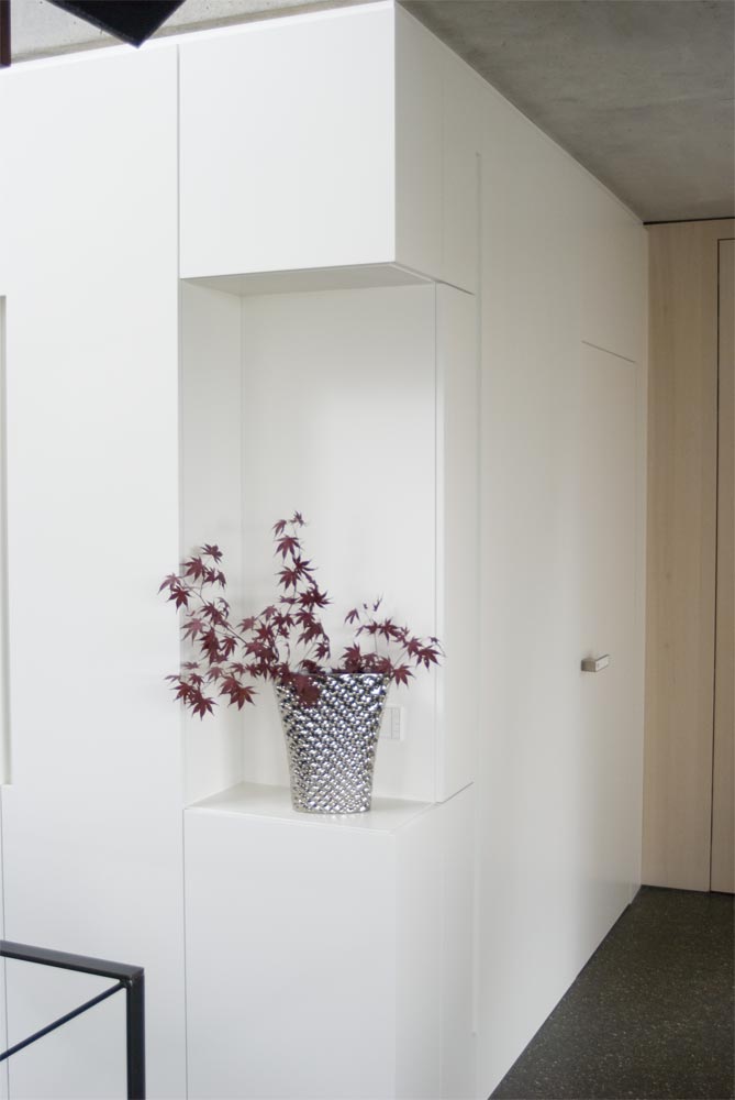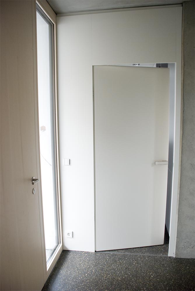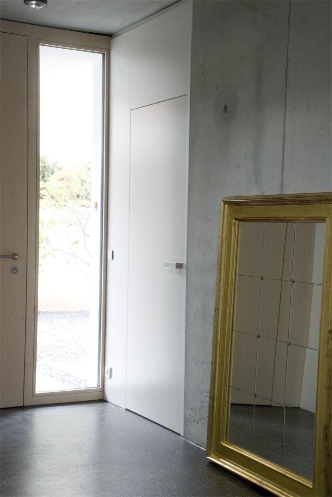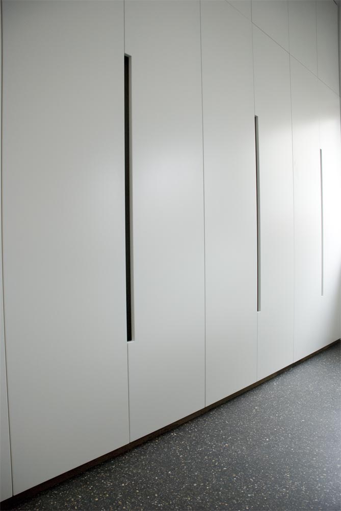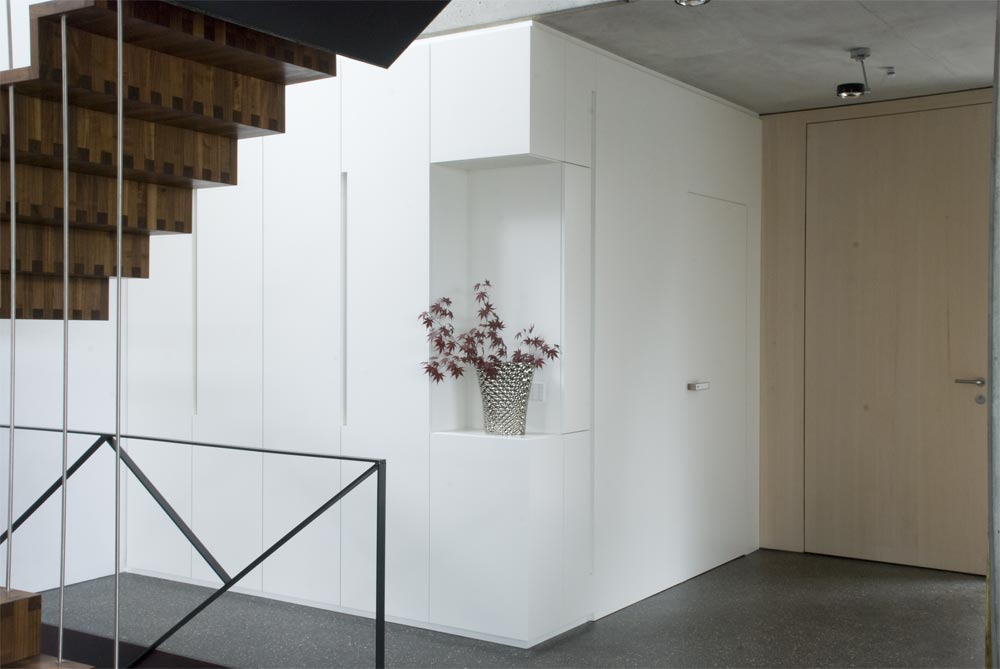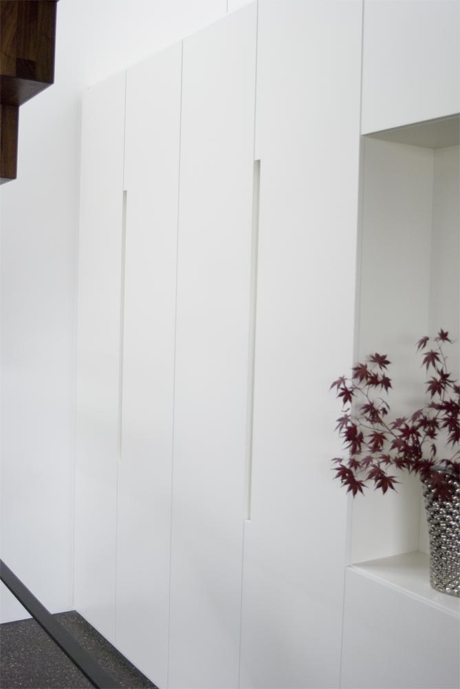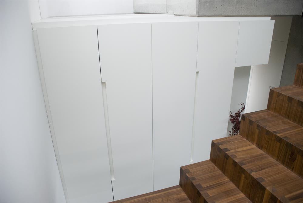 Die Garderobe läuft über Eck, mit integrierter WC Türe und gegenüberliegender Türe zum Hauswirtschaftsraum. Die Fronten sind teilweise über Eck zu Öffnen. Ein besonderes Detail sind die Griffausführungen und die Anbindung der Decke mit dem Oberlicht.