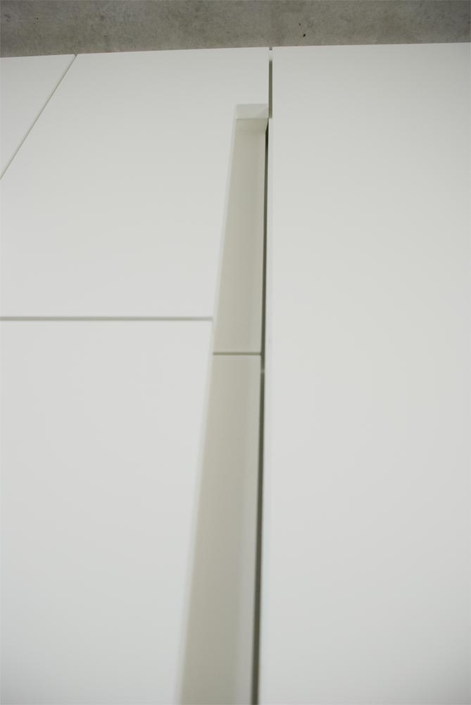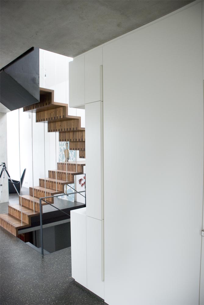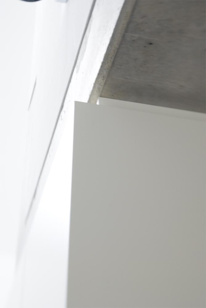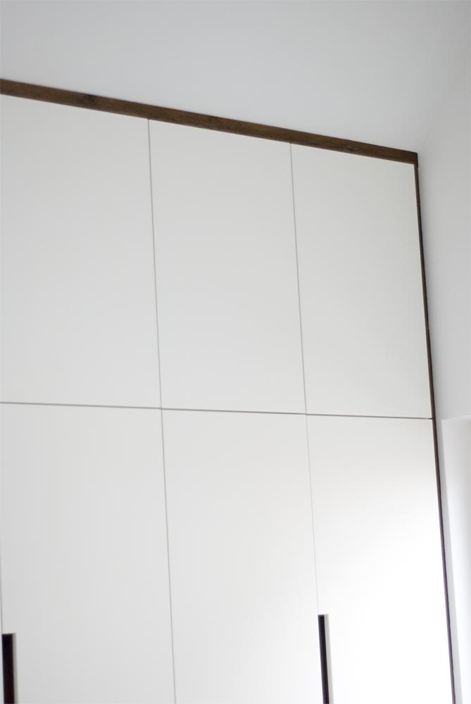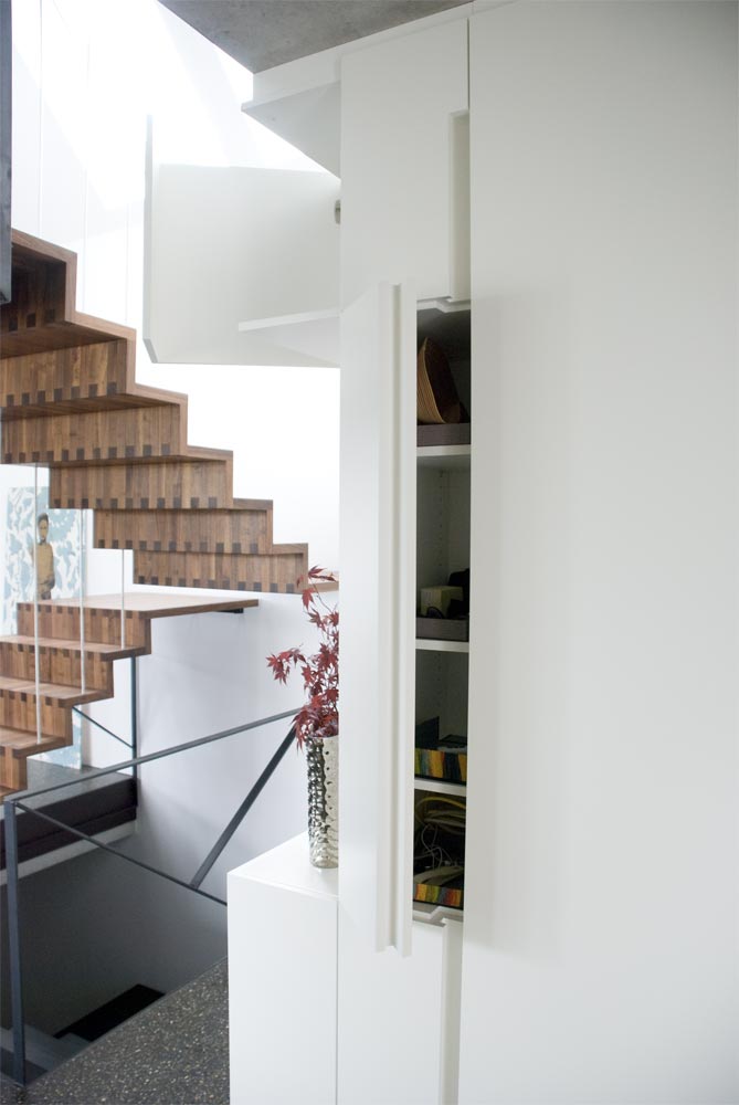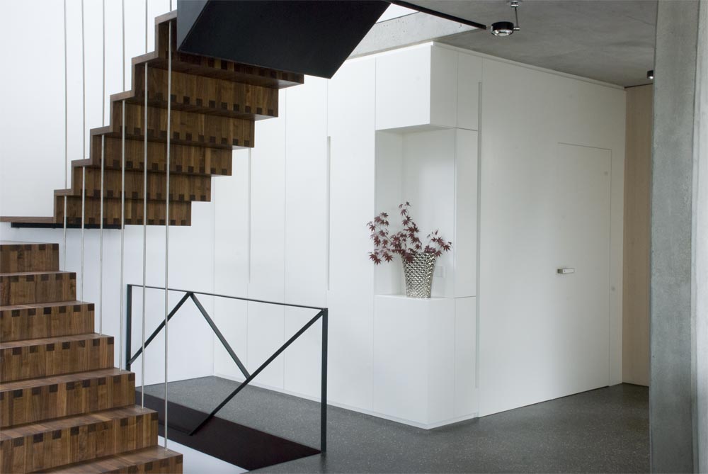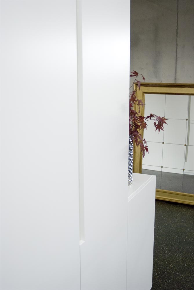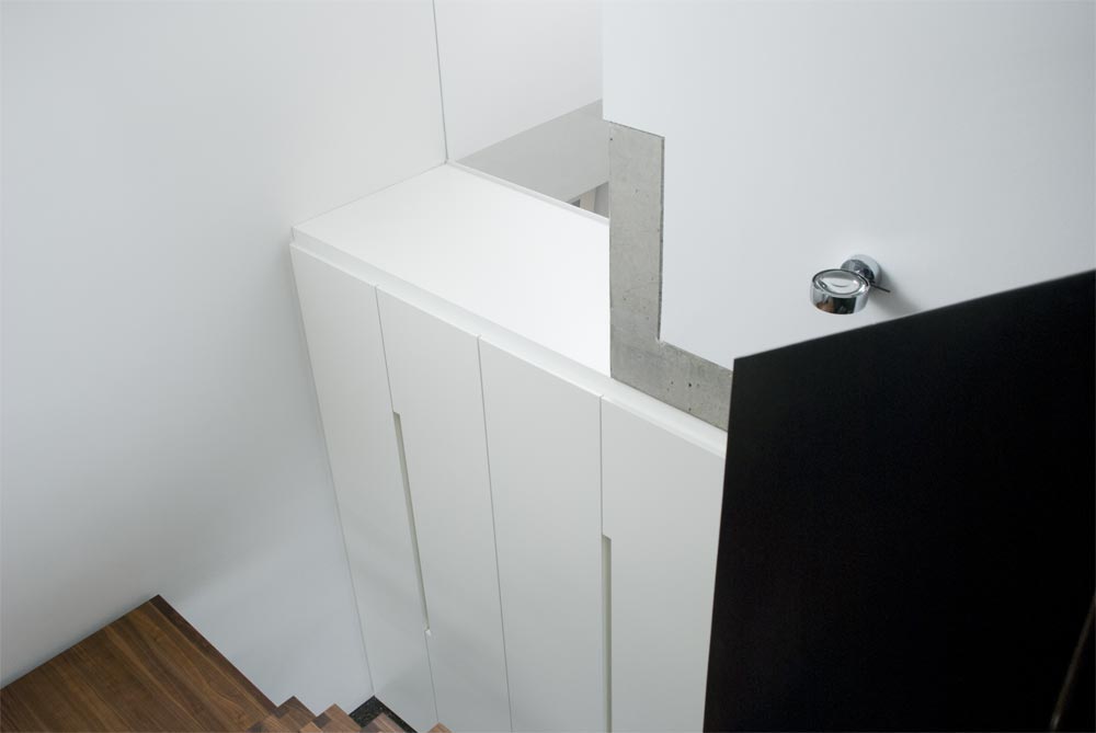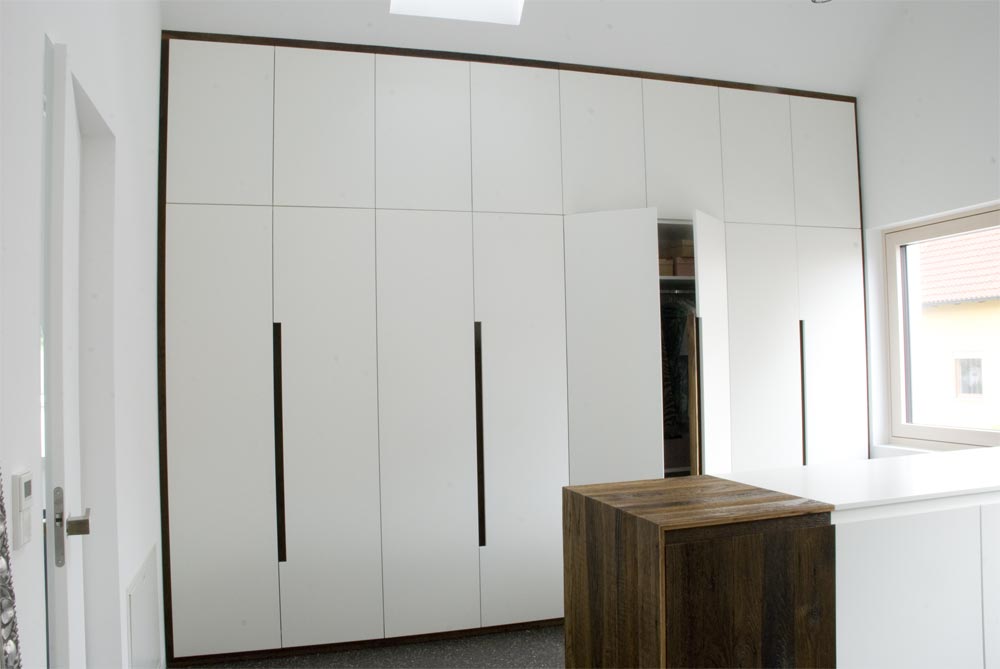 Die Garderobe läuft über Eck, mit integrierter WC Türe und gegenüberliegender Türe zum Hauswirtschaftsraum. Die Fronten sind teilweise über Eck zu Öffnen. Ein besonderes Detail sind die Griffausführungen und die Anbindung der Decke mit dem Oberlicht.