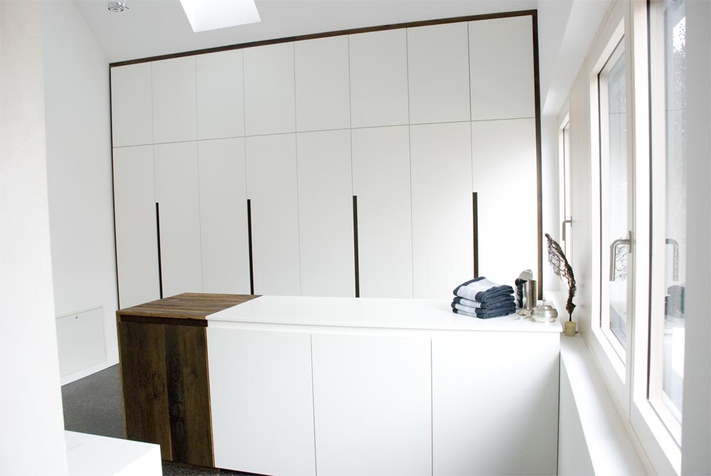 Bad-Einbauschrank unter einer Dachschräge, dei Passleisten und der Sockel wurden in Altholz Eiche hinterlegt, die Oberfläche wurde weiß/matt lackiert, die Grifföffnungen sind ebenfalls in Altholz Eiche gehalten.