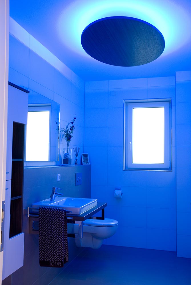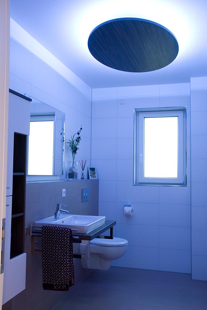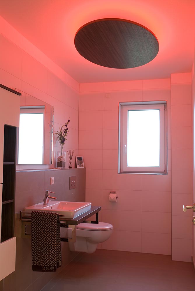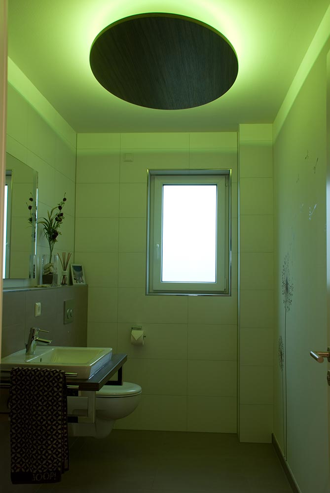 Die Deckenbeleuchtung im Gäste WC wurde mit einem RGB-LED Band ausgestattet. Die Intensität und farbliche Ausprägung der Beleuchtung kann per Fernbedienung gesteuert werden. Der Lampenschirm wurde in elyptischer Form ausgeführt und ist in definiertem Abstand von der Decke abgehängt. Das Dekor wurde passend zur gefertigten Waschtischplatte gewählt.