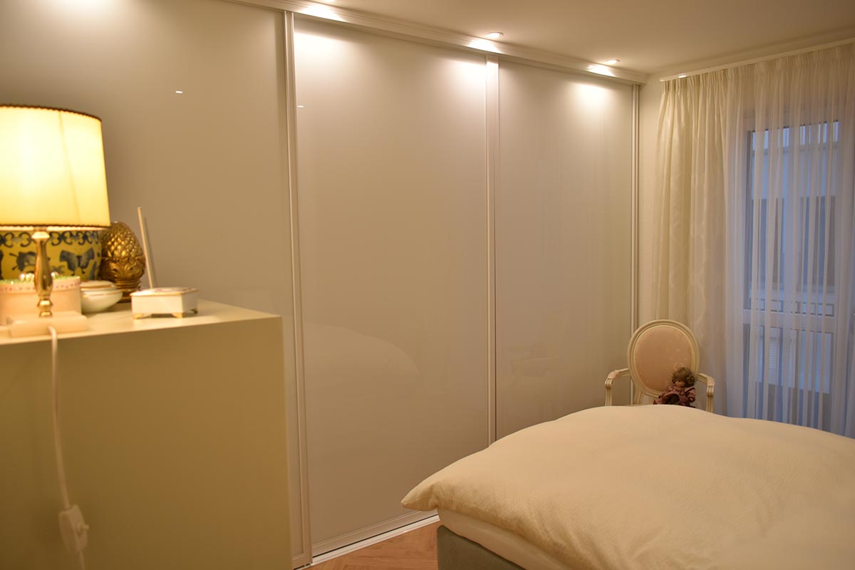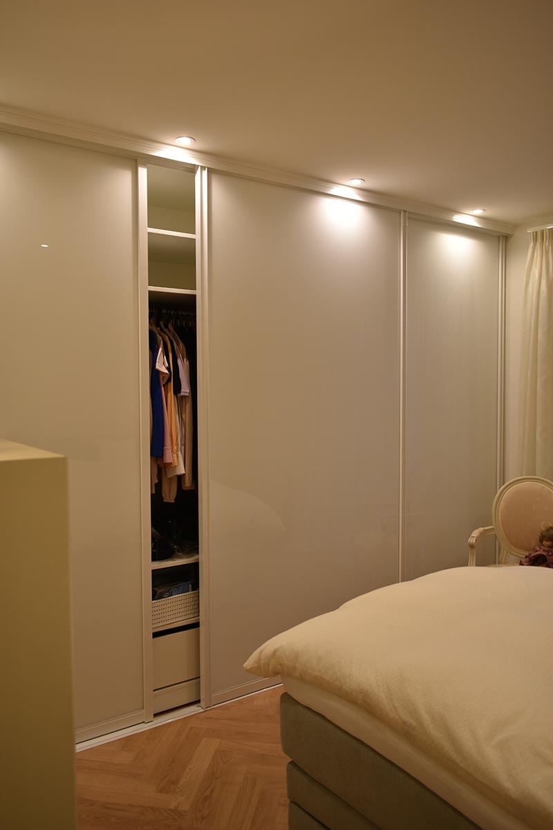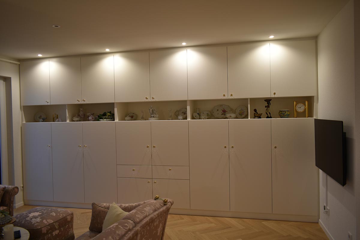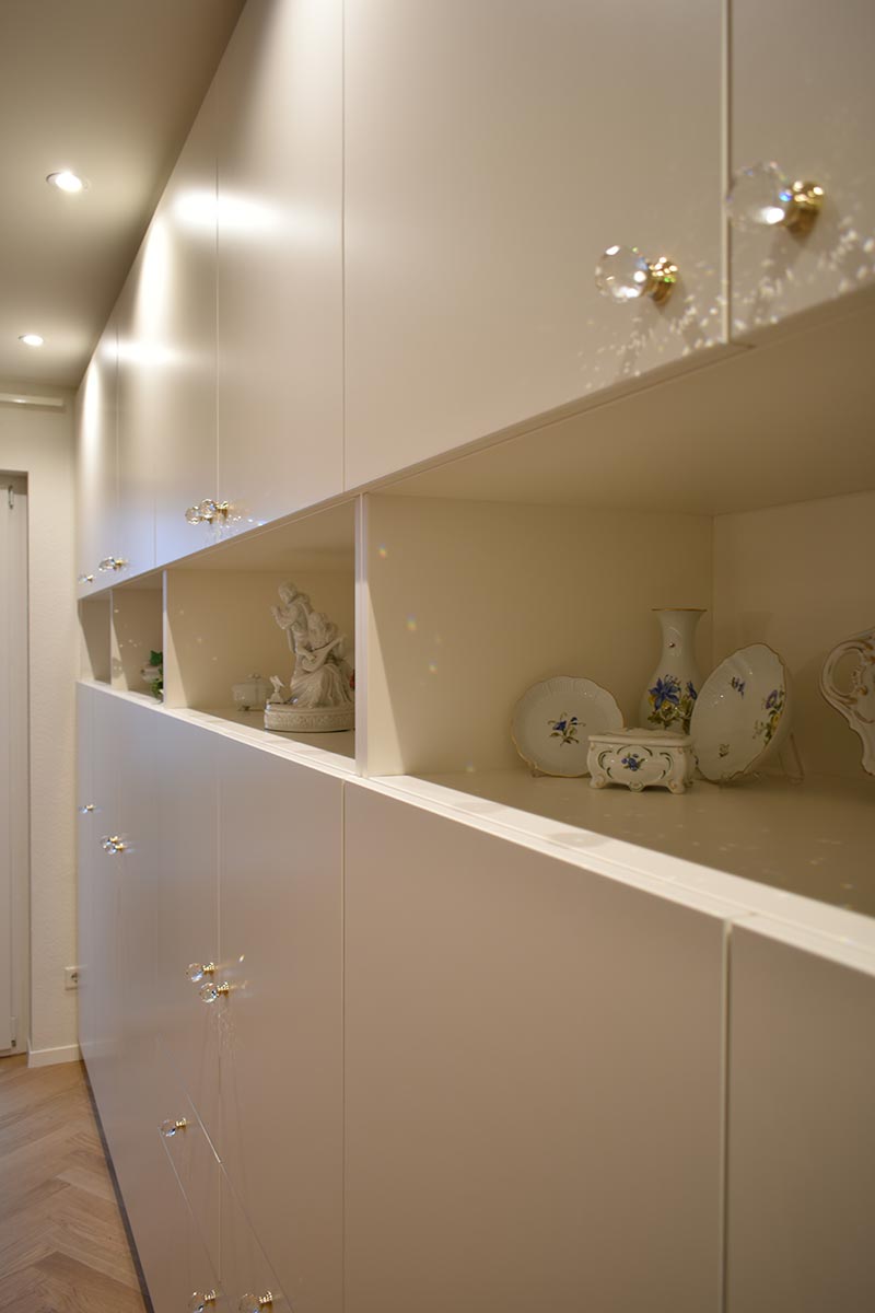 Für den Wohnbereih wurde eine Schrankwand mit einem offenem Bereich und Fronten darüber und darunter gefertigt, die Oberflächen wurden in weiß matt lackiert. Im Eingangsbereich wurden die Fronten mit drei Spiegeln versehen und die Schattenfuge hinterlegt. Die linke Seite lässt sich öffnen. Im Schlafzimmer wurde ein Einbauregal mit Gleittüren von raumplus integriert. Die Füllung wurde in Extraweiß / Glas ausgeführt, die Rahmen und Schienen weiß, und die Aufteilung im Inneren wurde angepasst an die Bedürfnisse gestaltet und umgesetzt.