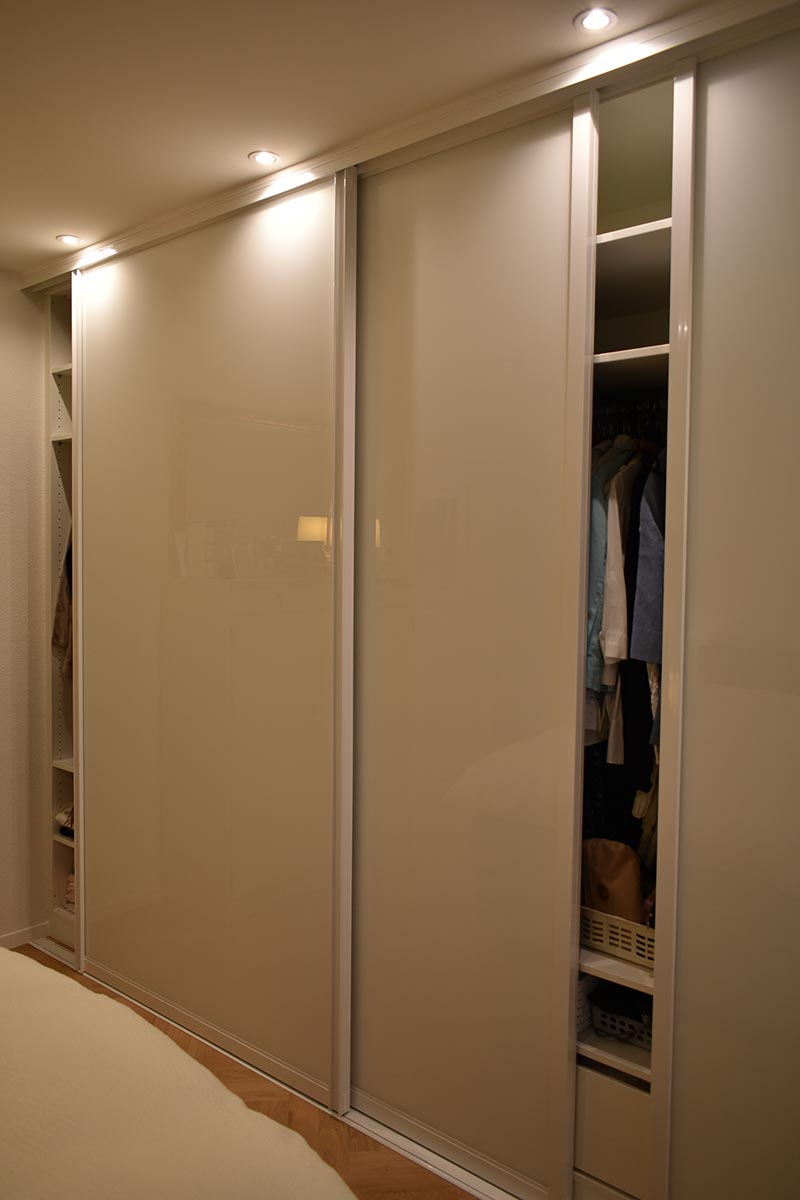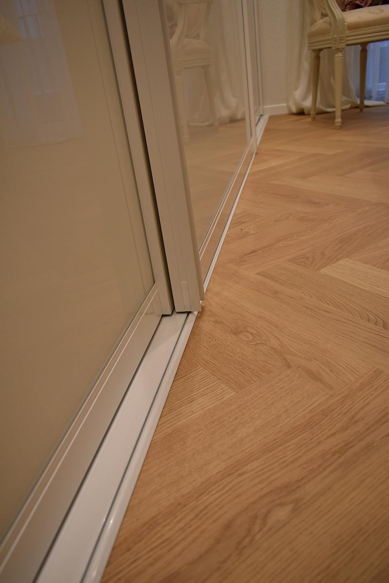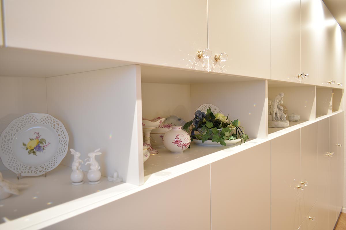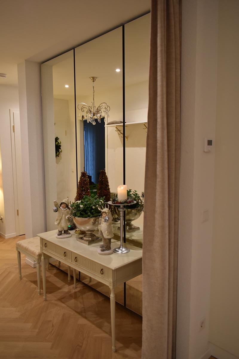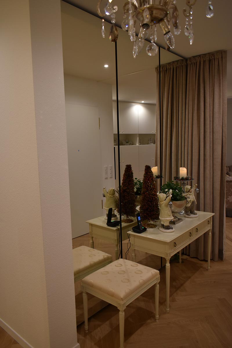 Für den Wohnbereih wurde eine Schrankwand mit einem offenem Bereich und Fronten darüber und darunter gefertigt, die Oberflächen wurden in weiß matt lackiert. Im Eingangsbereich wurden die Fronten mit drei Spiegeln versehen und die Schattenfuge hinterlegt. Die linke Seite lässt sich öffnen. Im Schlafzimmer wurde ein Einbauregal mit Gleittüren von raumplus integriert. Die Füllung wurde in Extraweiß / Glas ausgeführt, die Rahmen und Schienen weiß, und die Aufteilung im Inneren wurde angepasst an die Bedürfnisse gestaltet und umgesetzt.