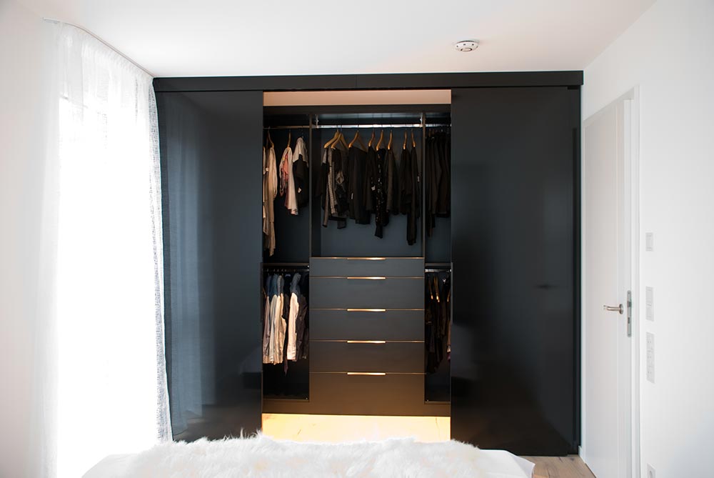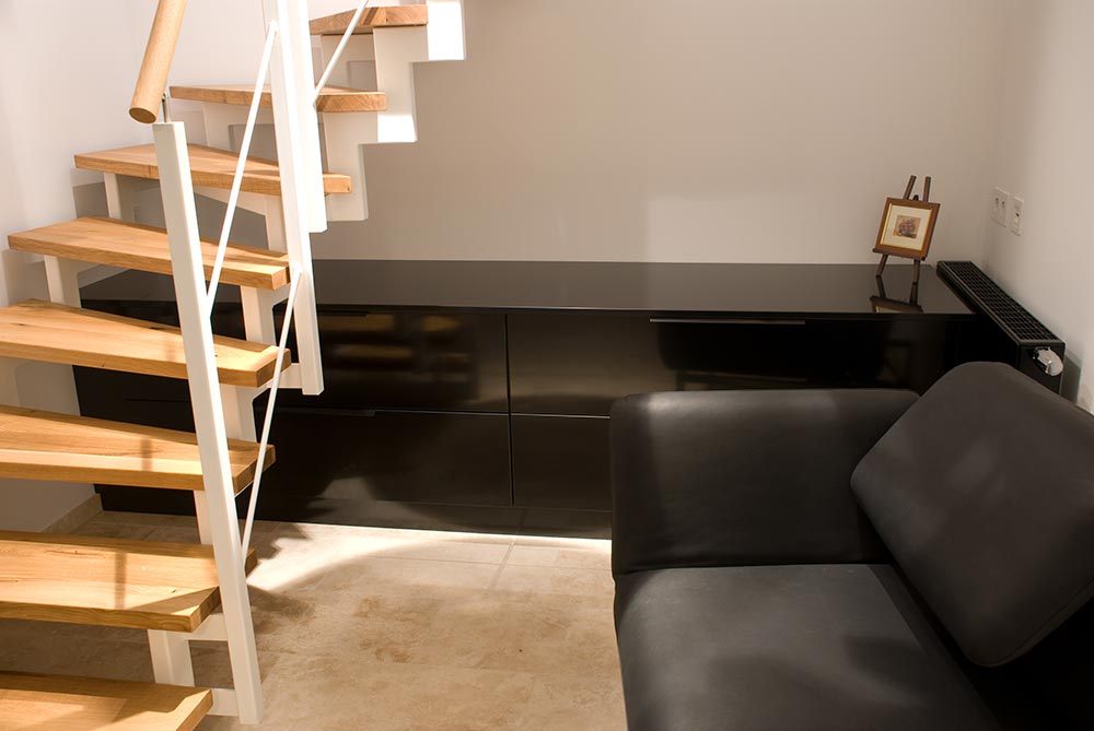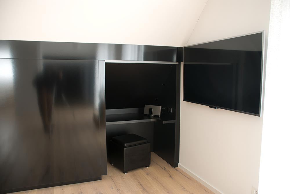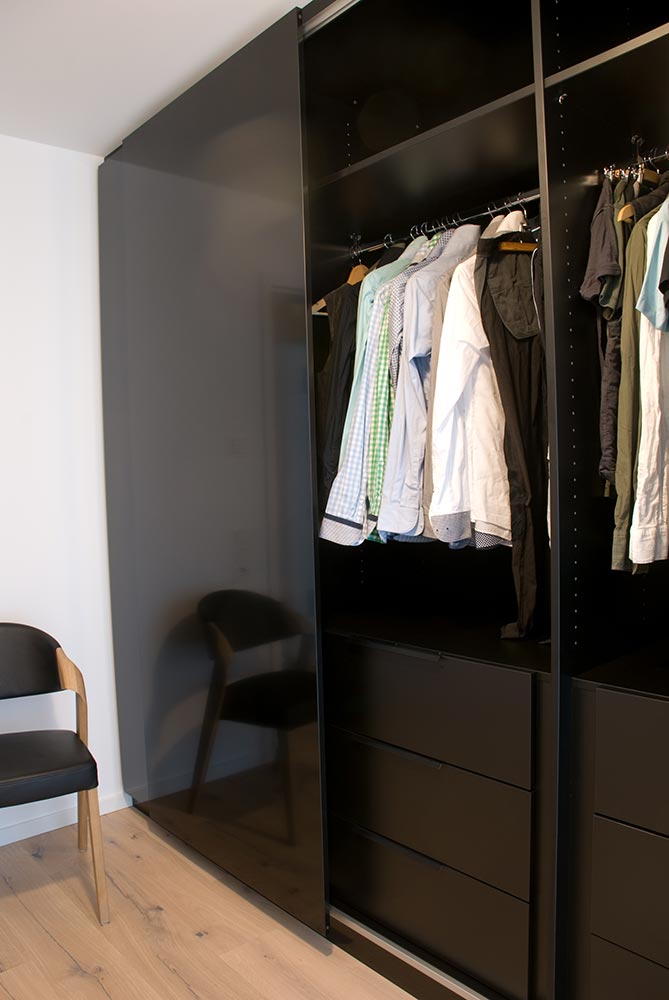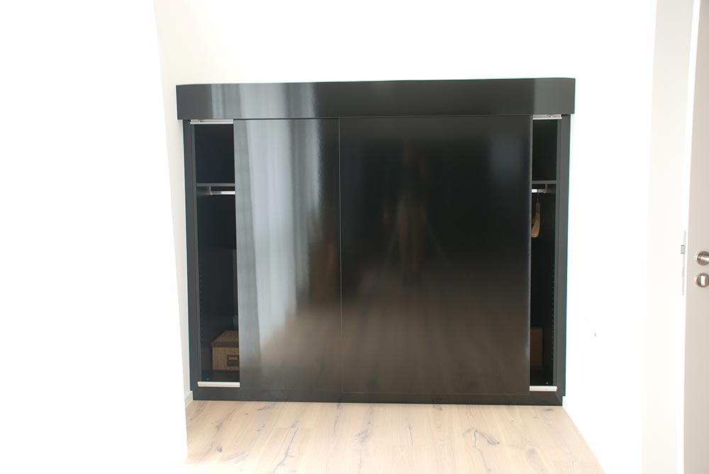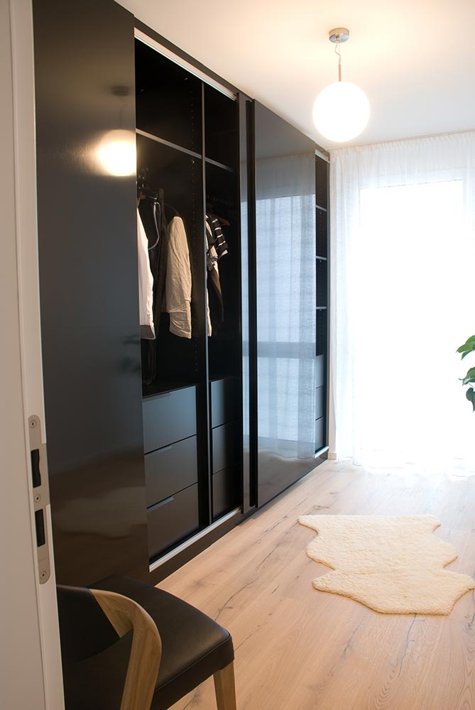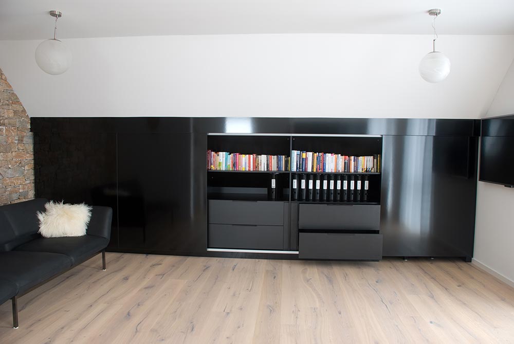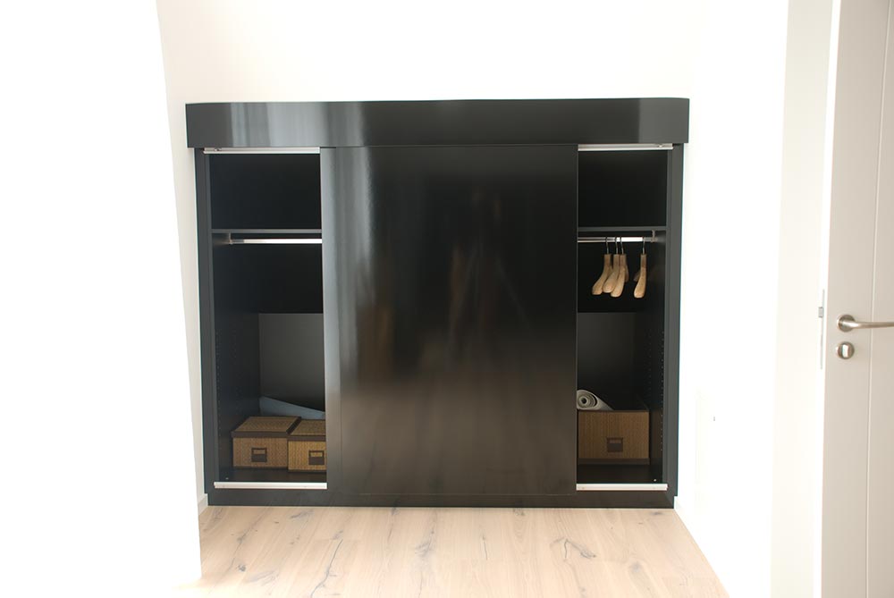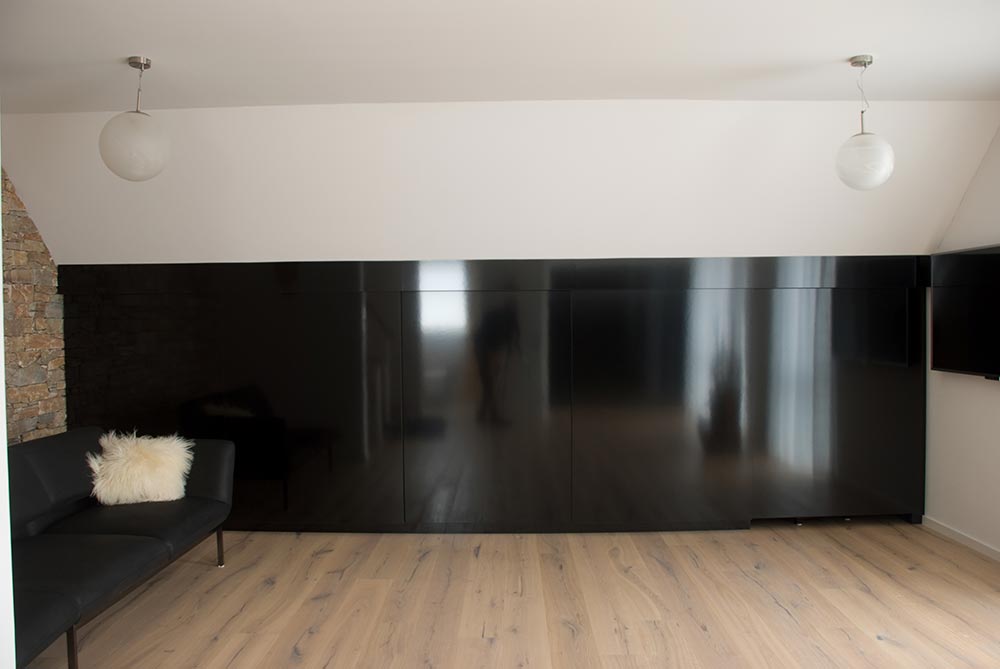 Hier wurden mehrere Einbauschränke in Kunststoffdekor schwarz / Hochglanz gefertigt und eingebaut, teilweise in die Dachschräge eingepasst. Einer der Schränke wurde mit einem Arbeitsbereich ausgestattet, der im Fussbereich für einen Stuhl / Hocker geöffnet wurde. Die Ankleide im Schlafzimmer wurde hinter einer Trennwand mit Doppelschiebetüre versteckt. Außerdem wurde unter der Treppe ein Sideboard für Schuhe eingepasst.