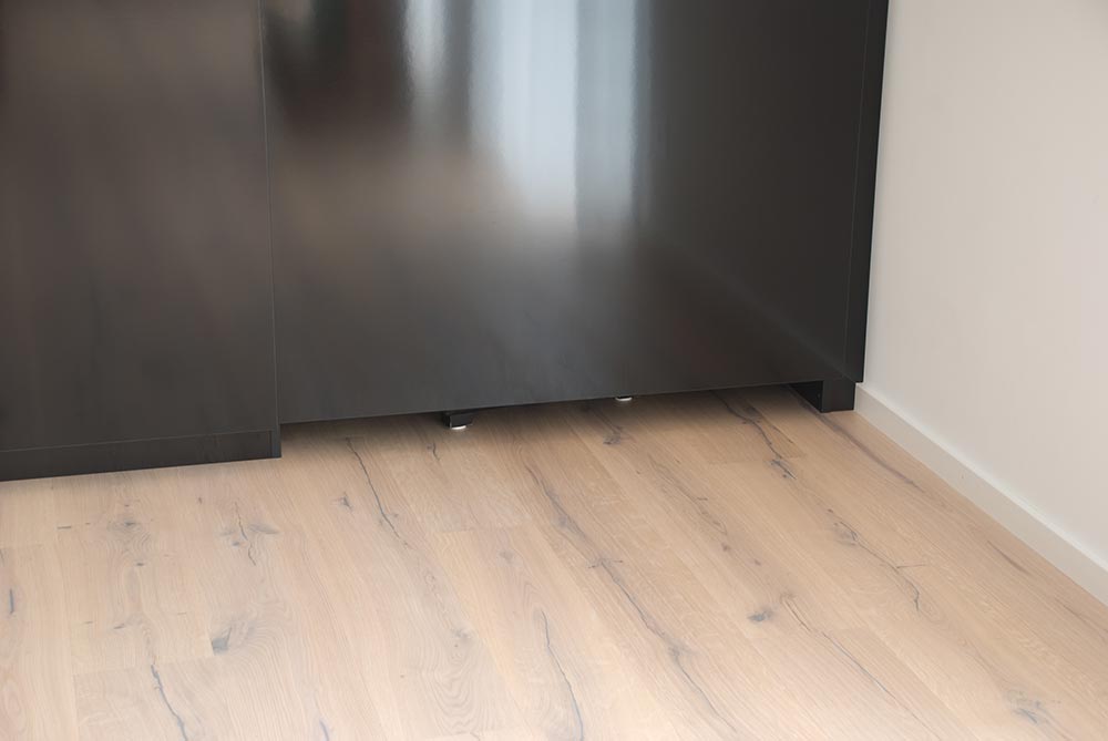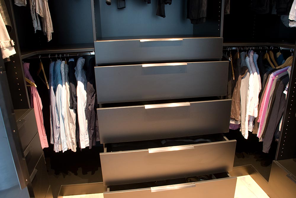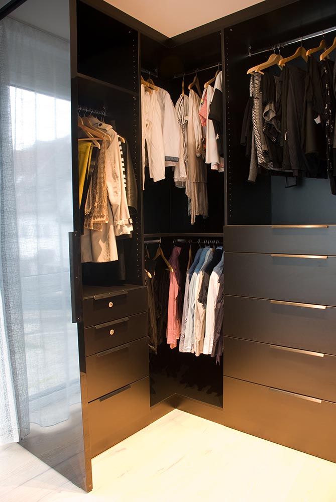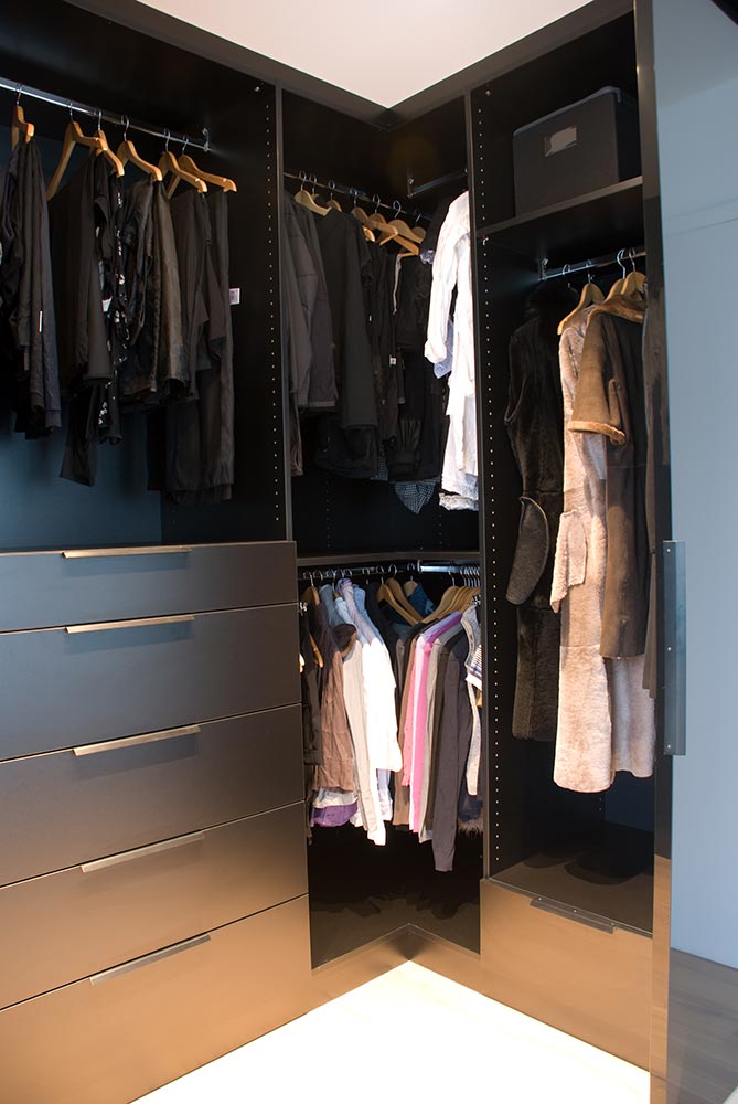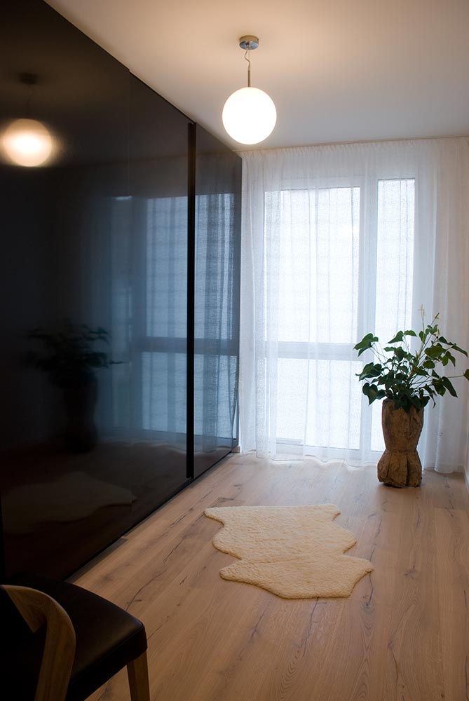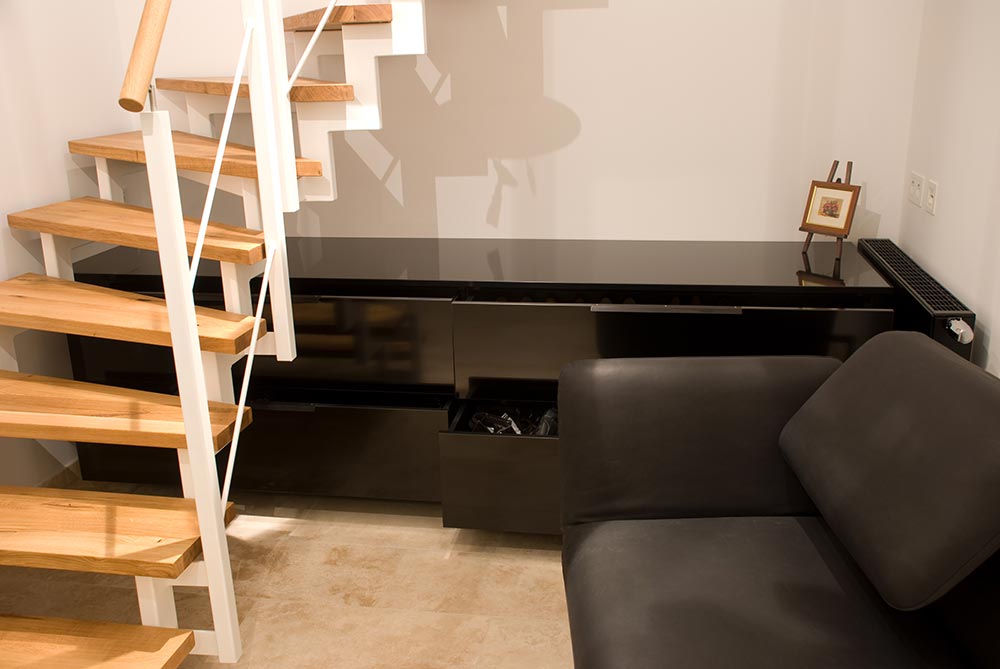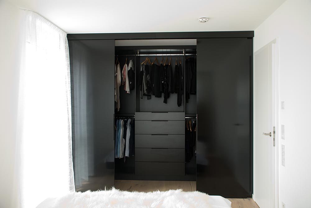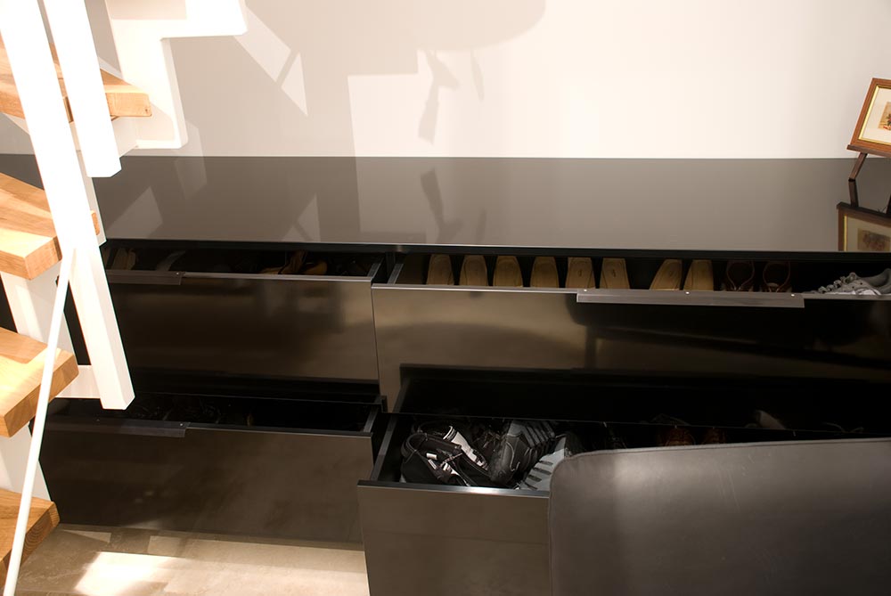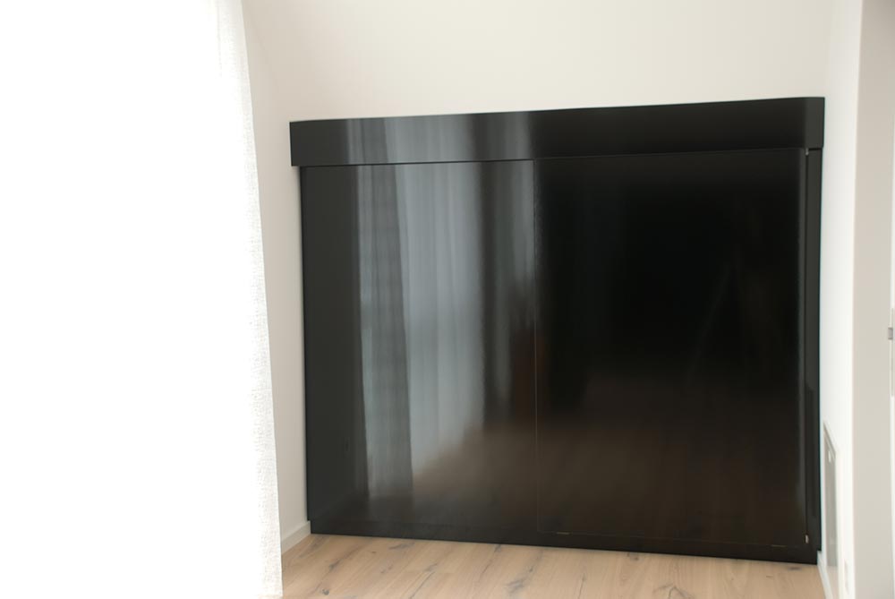 Hier wurden mehrere Einbauschränke in Kunststoffdekor schwarz / Hochglanz gefertigt und eingebaut, teilweise in die Dachschräge eingepasst. Einer der Schränke wurde mit einem Arbeitsbereich ausgestattet, der im Fussbereich für einen Stuhl / Hocker geöffnet wurde. Die Ankleide im Schlafzimmer wurde hinter einer Trennwand mit Doppelschiebetüre versteckt. Außerdem wurde unter der Treppe ein Sideboard für Schuhe eingepasst.