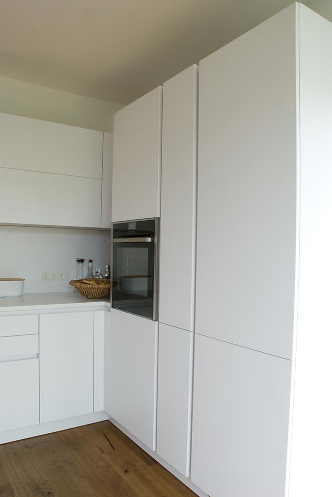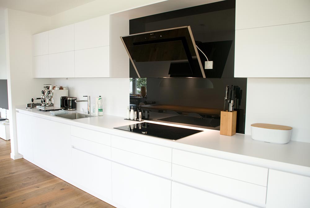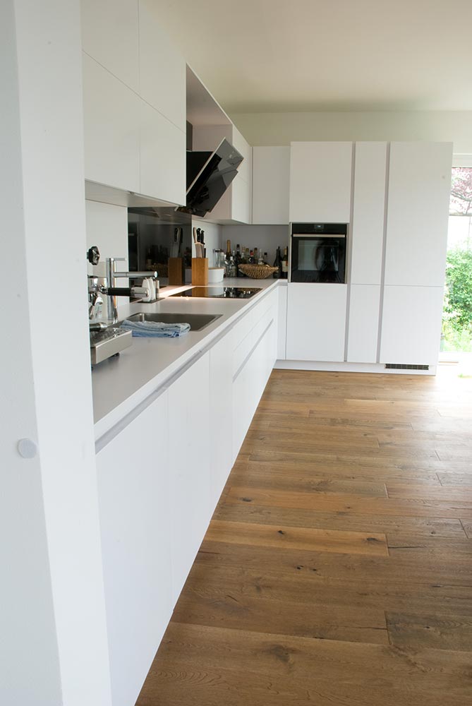 Der Esstisch und die dazugehörige Sitzbank wurden in Eiche ausgeführt. Das Material wurde gebürstet und geölt. Die Sitzbank wurde auf einem Winkel an der Wand befestigt.