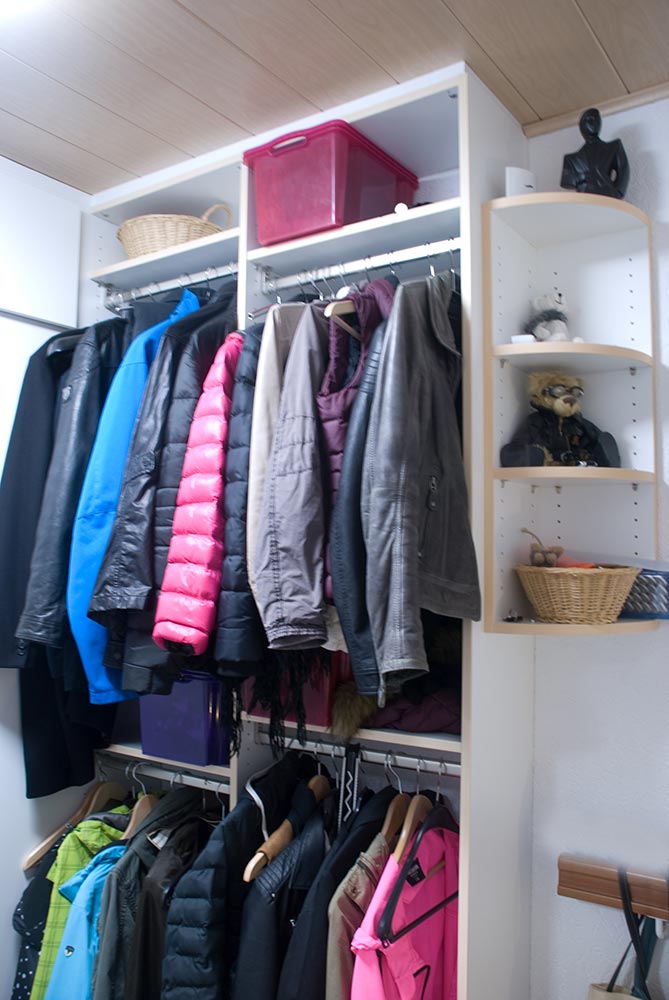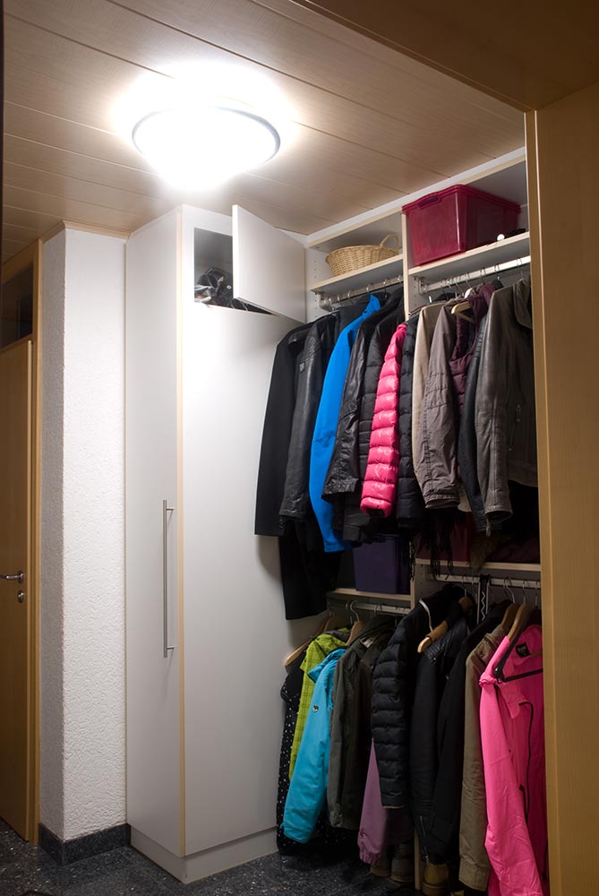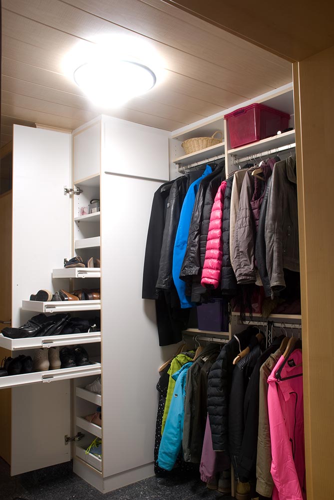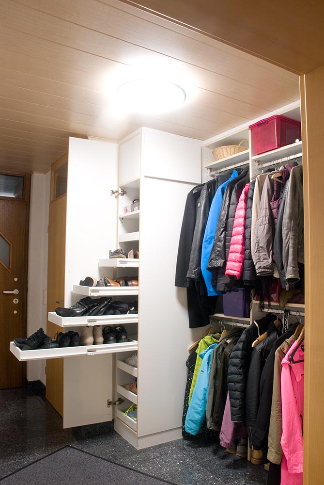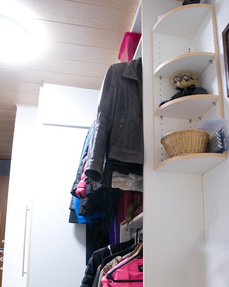 Hier wurde eine Garderobe in die vorhandene Mauernische eingepasst. Die Garderobe verfügt über einen raumhohen Schuhschrank und extra-tiefe Auszügen für Schuhe und Kleiderstangen.