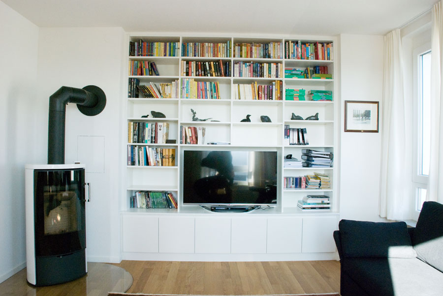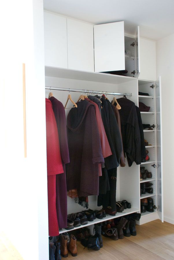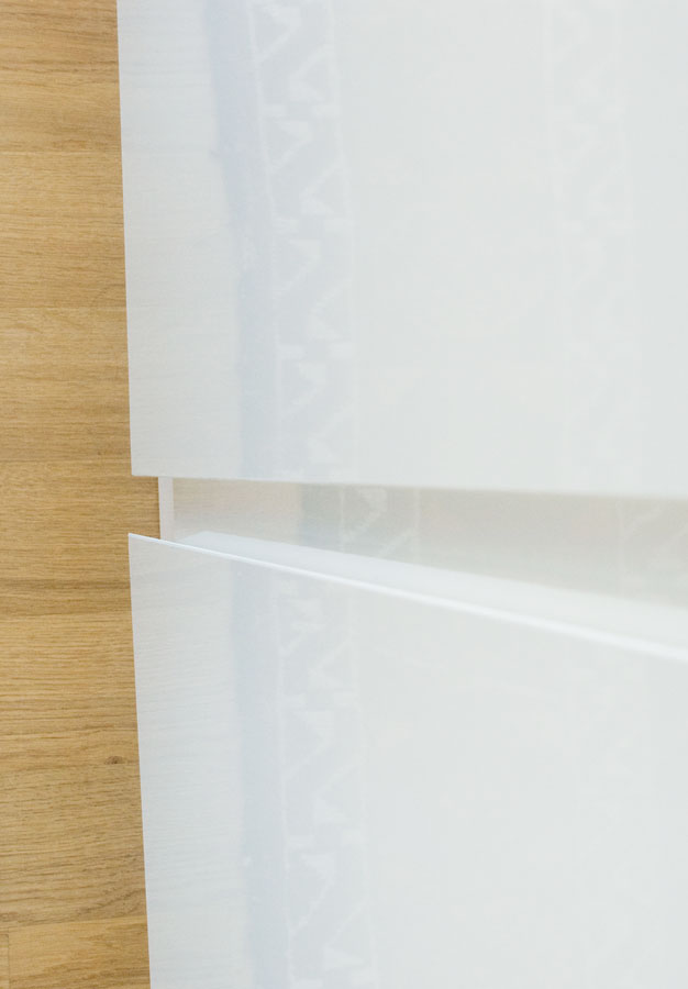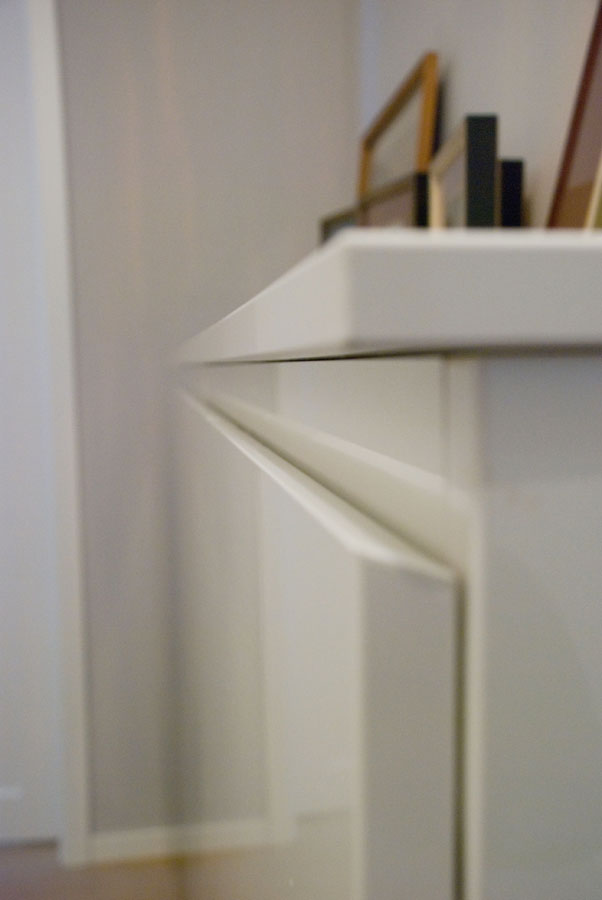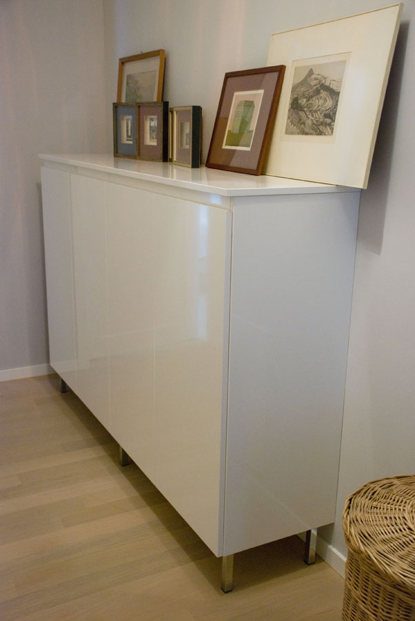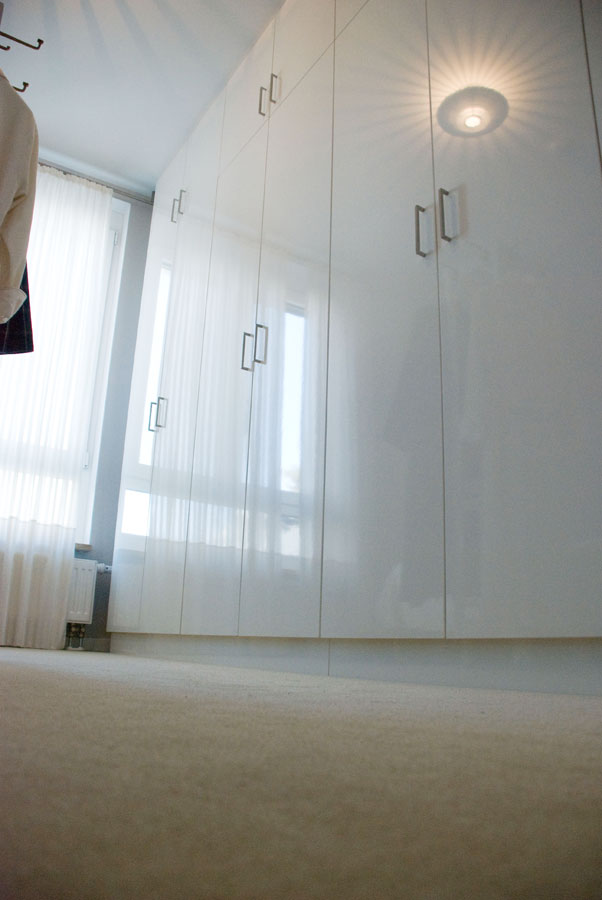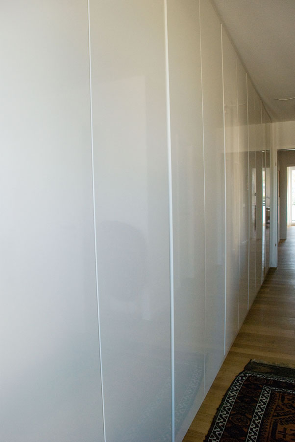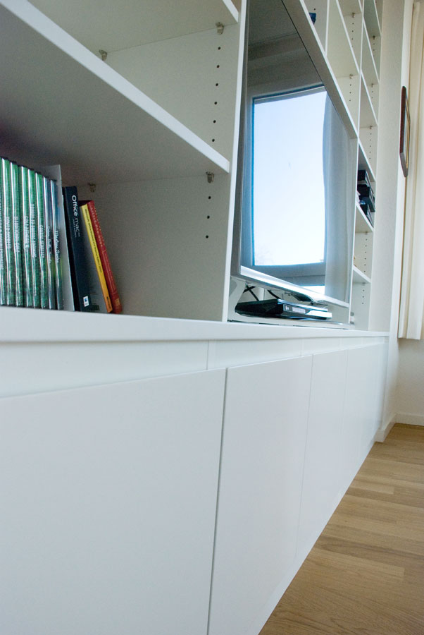 Kleiderschrank in Kunststoff weiß hochglanz, Sideboard in weiß hochglanz, abgeschrägter Grifföffnung, Garderobe in weiß hochglanz, innenliegenden Schüben, Kleiderschrank ca. 7m lang in Kunststoff weiß hochglanz, Griffschräge längs zu Öffnen, Garderobe ohne Schubkästen, Wohnzimmer in weiß hochglanz, unten Drehtüren, mit Ausschnitt für TV.