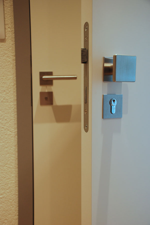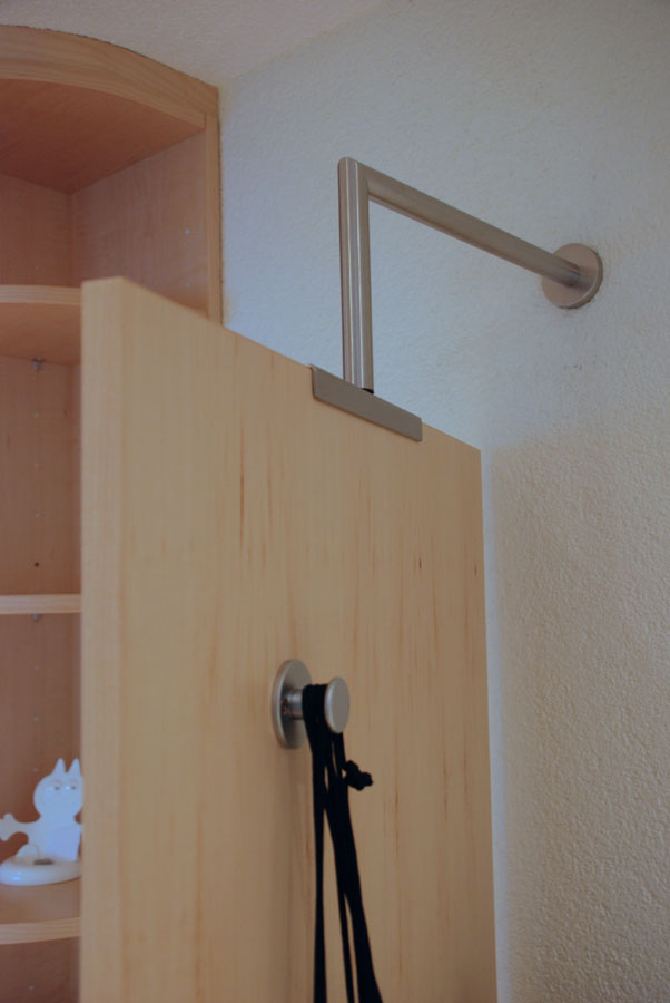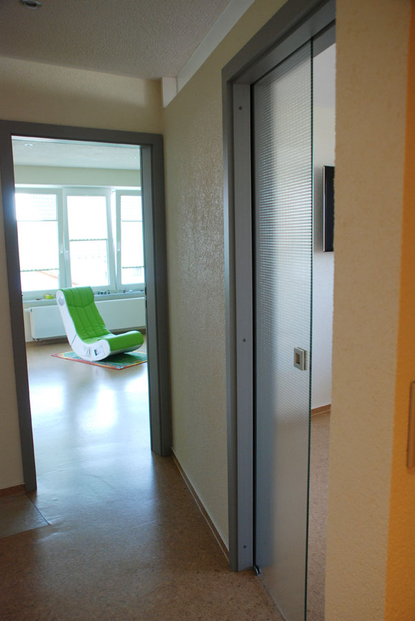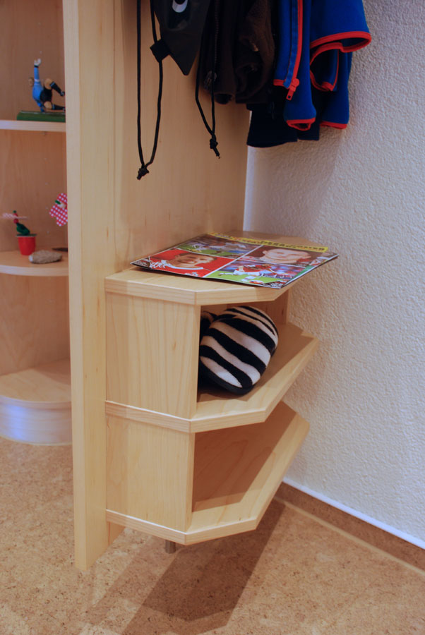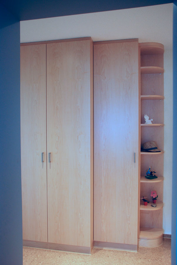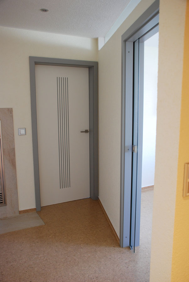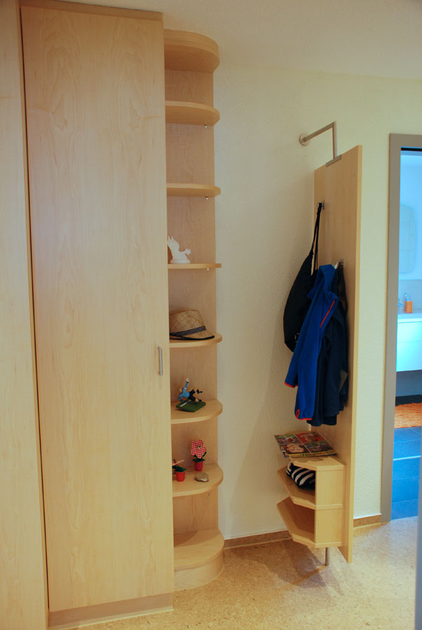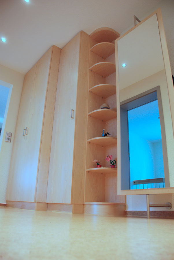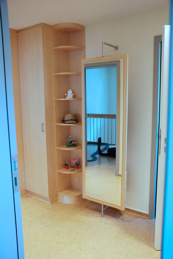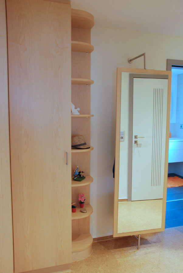 Garderobe in canadischem Ahorn, lackiert, 3-geteilt und in Tiefe mit Versatz, rechts mit offenem agerundetem Regal, Drehregal einseitig verspiegelt und Rückseite mit Kleiderhaken und Schuhablage. Zimmertüren weiß mit grauen Türfutter und eingefrästen Längsrillen, dazu passend eine Glasschiebetüre.