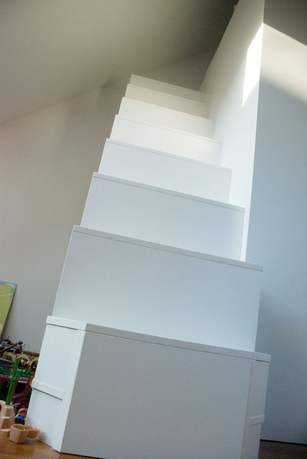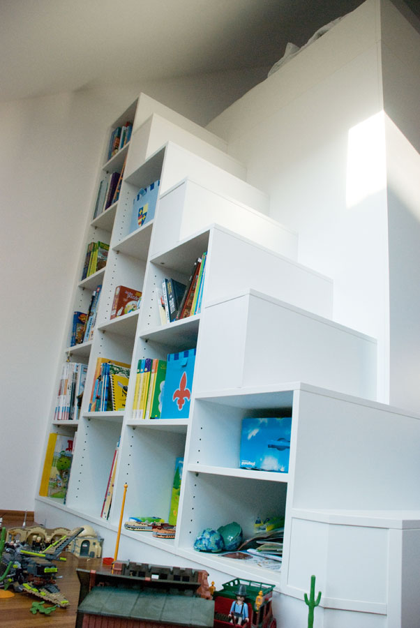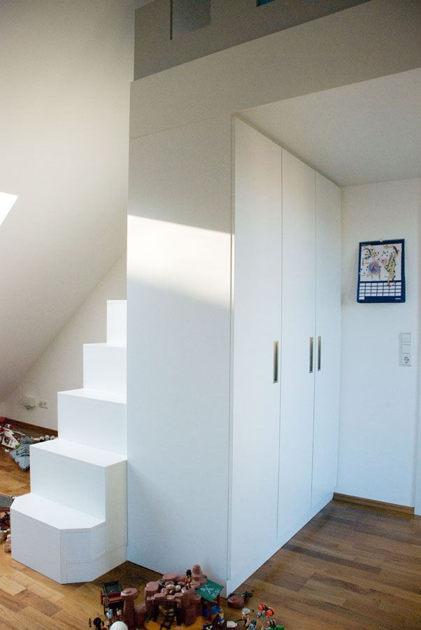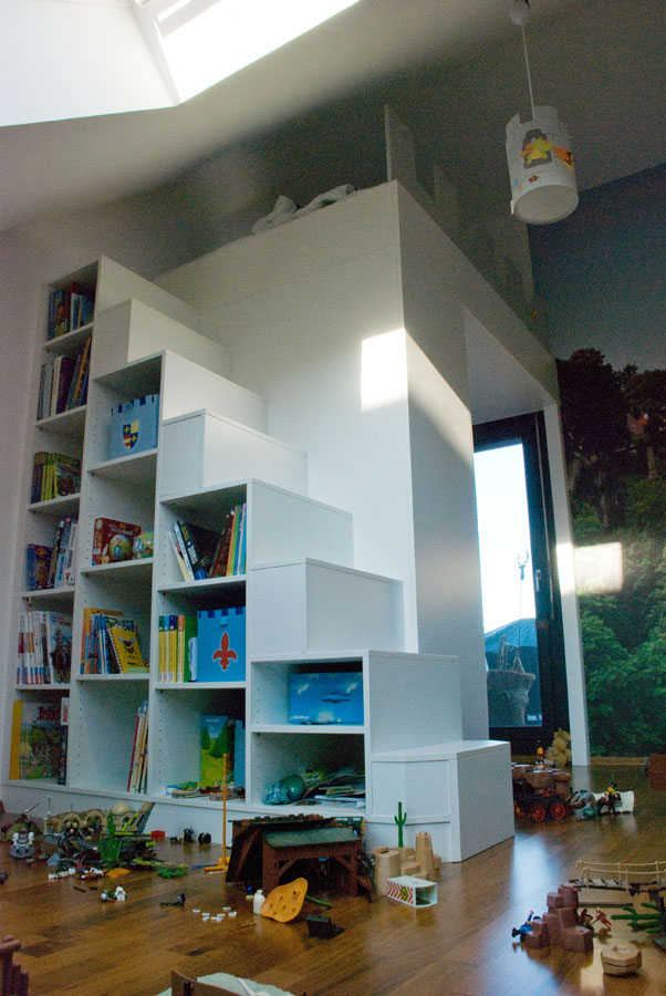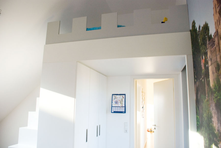 Kinderhochbett mit Regal als Treppenaufgang, Unterbau Kleiderschrank, Absturtzsicherung mit Zinnen, ähnlich einer Burg.