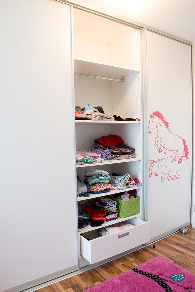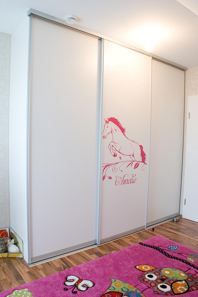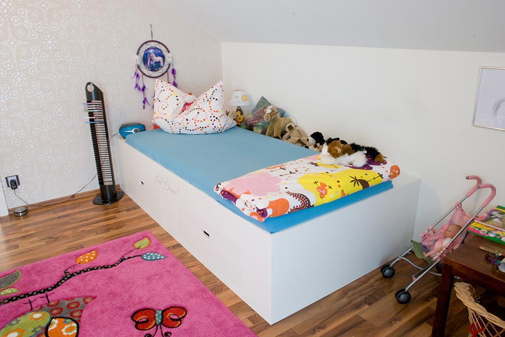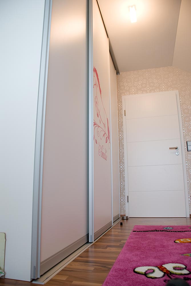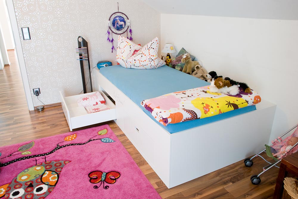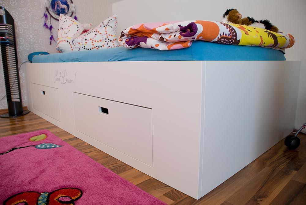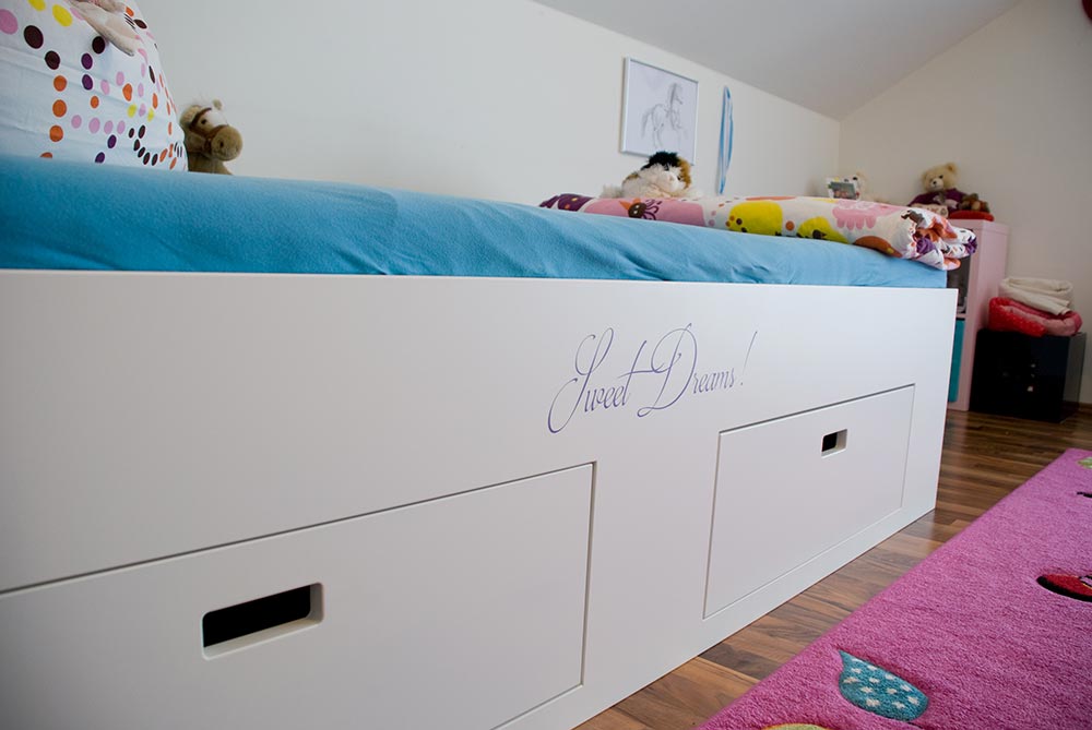 Die Einbauten im Kinderzimmer bestehen aus einem Kinderbett und einem Kleiderschrank. Das Kinderbett wurde mit einer Ablage zur Wand und zwei zusätzlichen Auszügen unter dem Bett für viel Spielzeug oder andere Geheimnisse augestattet. Die Schübe wurden mit einer Griffausfräsung versehen, damit keine Hindernisse beim Ein- und Aussteigen entstehen. Passend dazu wurde eine großer Kleiderschrank mit Schiebetüren von raumplus installiert. Die Gleittüre und das Bett wurde mit individuellen Beschriftung versehen. Alle Sichtteile wurden weiß / matt lackiert. Innen wurde Kunststoff in weiß / perl verwendet.