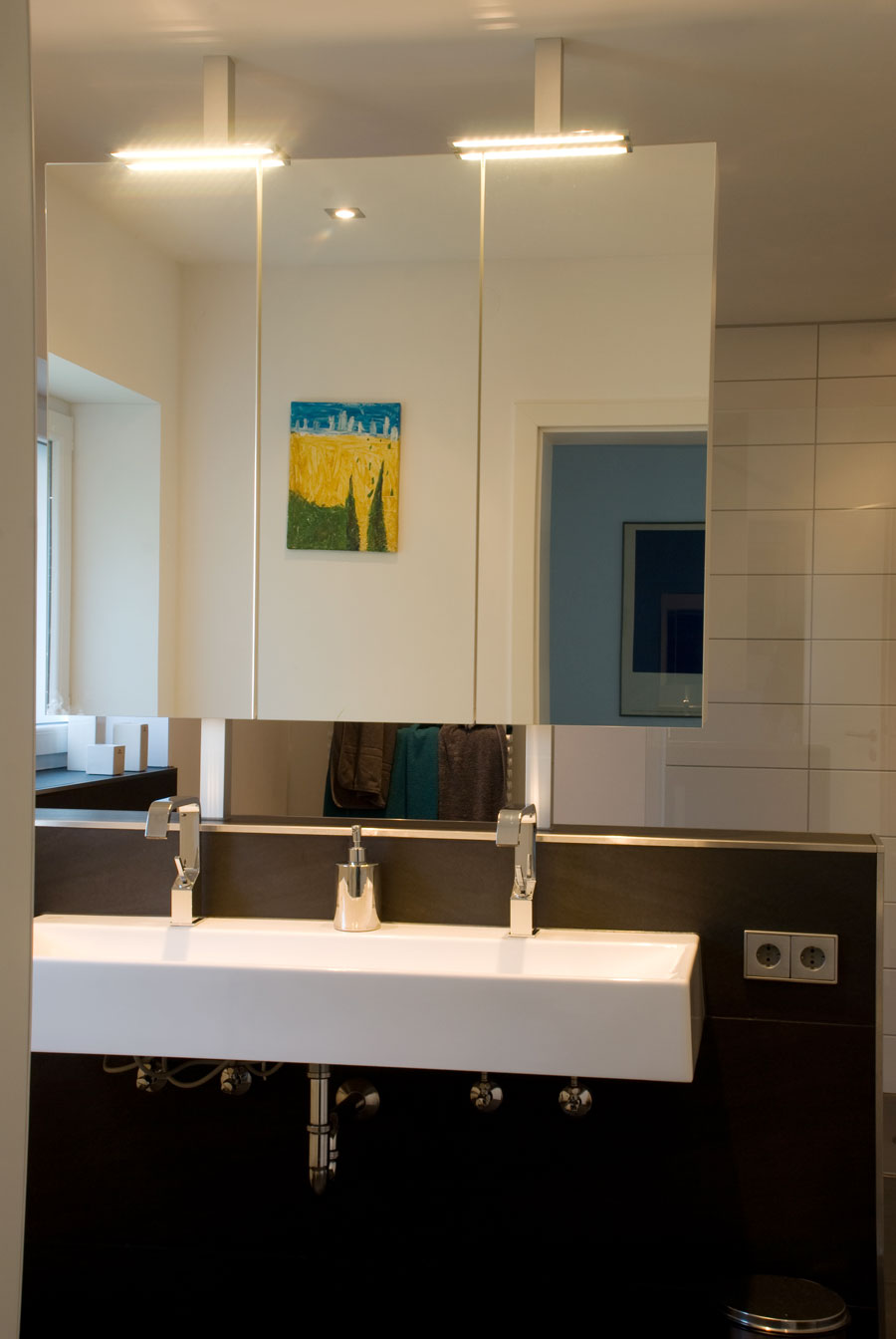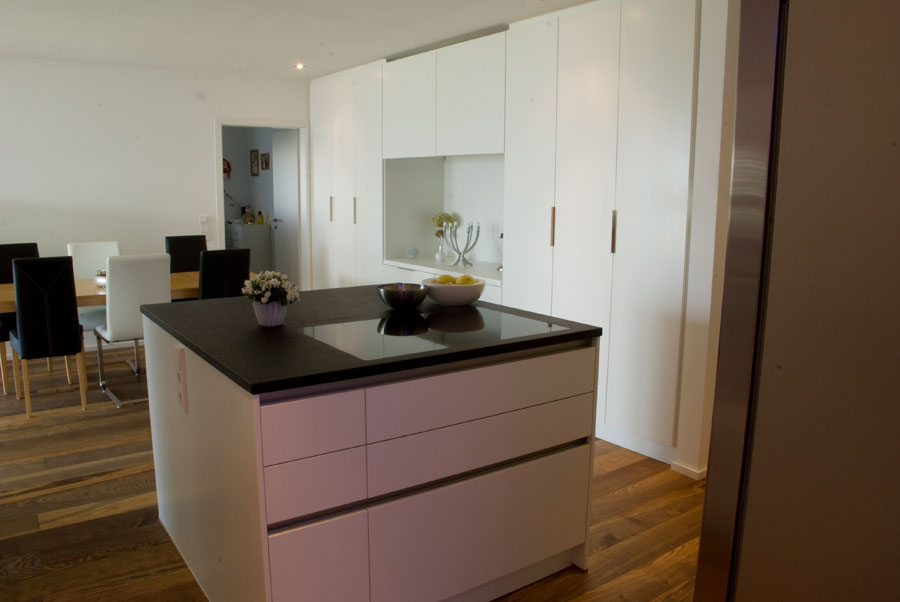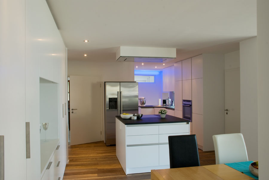 Parkett Eiche Barrique rustikal, mit V-Fuge, Oberfläche geölt auch über Stufen. Ein Einbauschrank mit Arbeitsplatz links. Badspiegelschrank auf Vormauerung gestellt und beidseitig sichtbar. Mit LED Beleuchtung darüber und von unten eingelassen. Küche mit Granit Arbeitsplatte und weiß matter Oberfläche. Grifflos zu Öffnen. Dunstabzughaube in Deckenabhängung flächenbündig eingelassen.