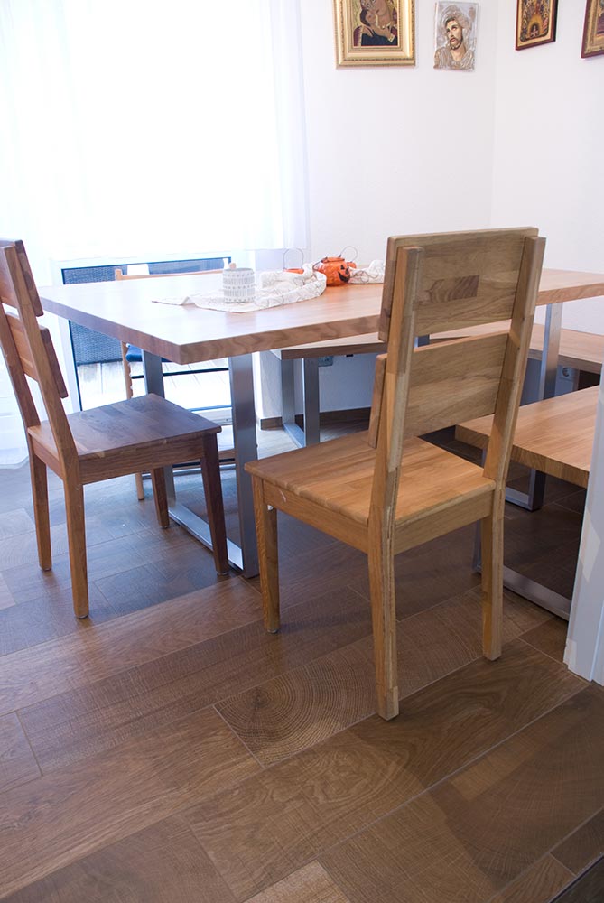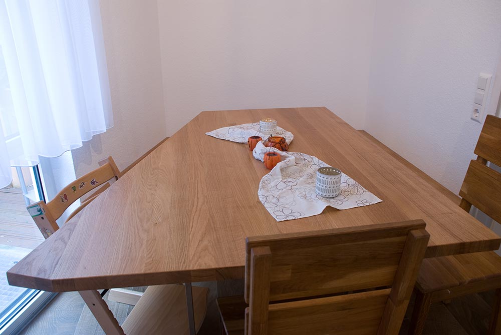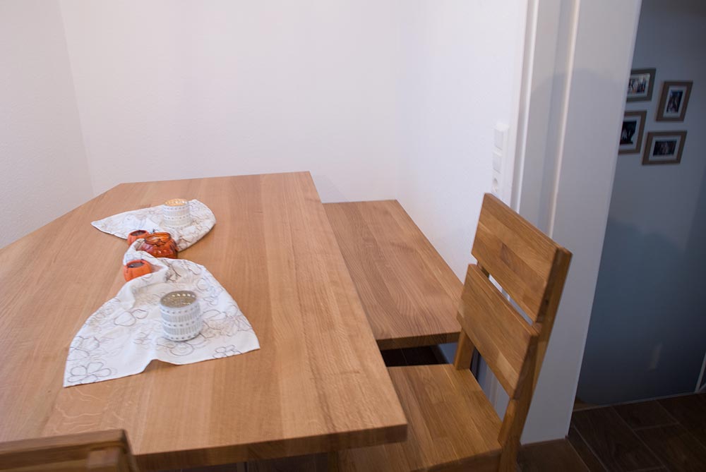 Der Esstisch und die Sitzbank wurden aus Eiche massiv gefertigt. Die Oberfläche sind leicht gebürstet und geölt. Tisch und Bank stehen auf Metallkufen aus Edelstahl. Die Kombination wurde in einer Sonderform ausgelegt und in die Mauernische eingepasst.