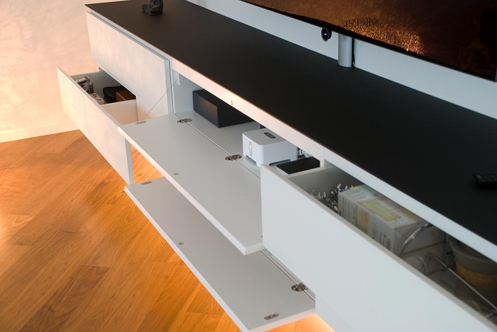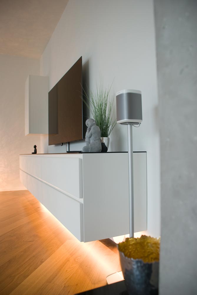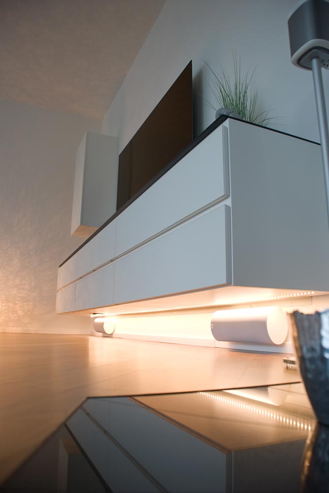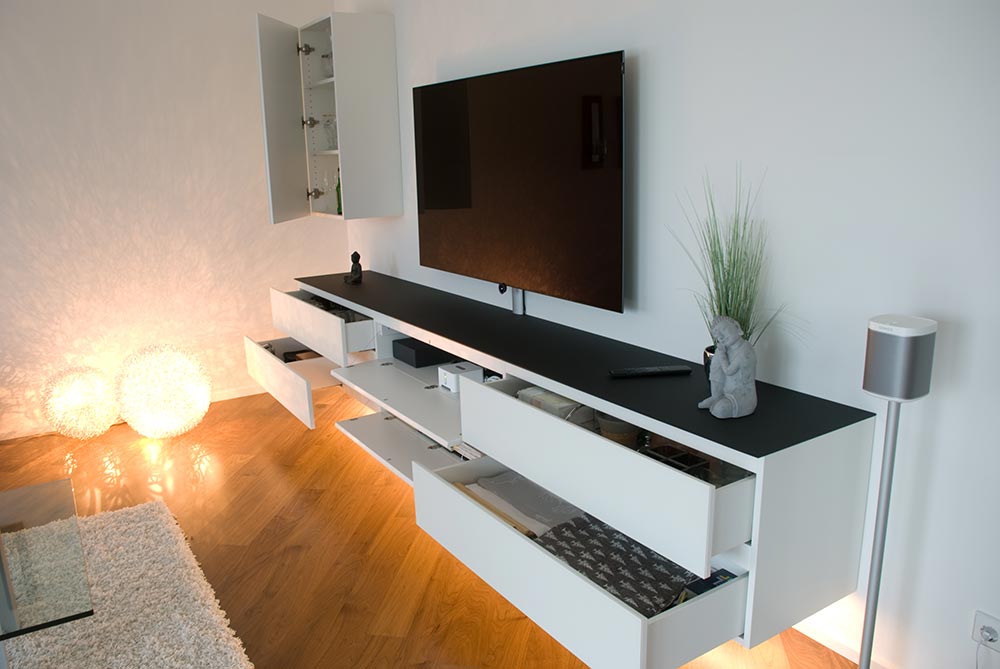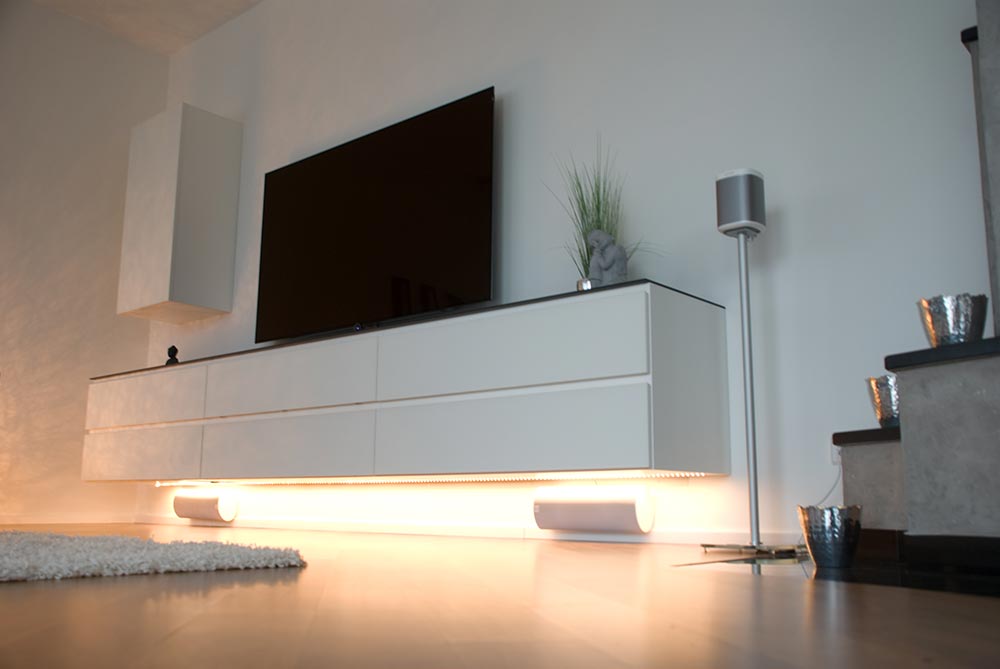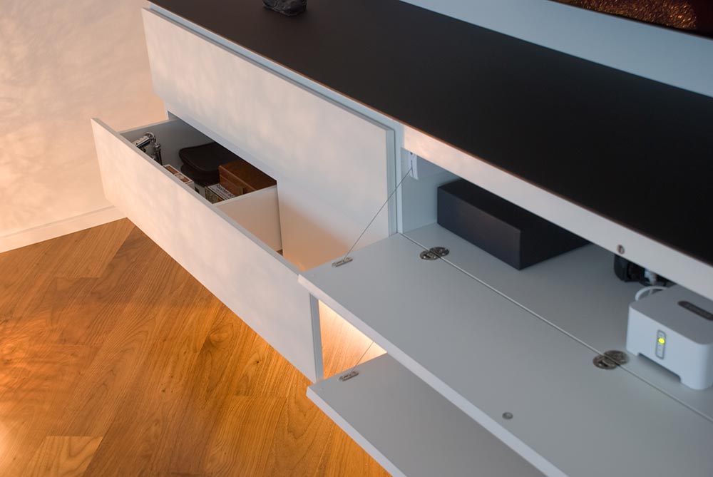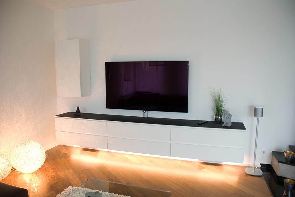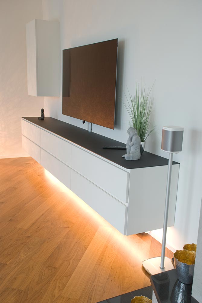 Hier wurde ein TV Lowboard mit Hängeschrank gefertigt. Die Oberflächen sind weiß matt lackiert, die Fronten sind in satiniertem Glas, rückseitig weiß lackiert ausgeführt. Die Deckplatte besteht aus satiniertem Glas, schwarz lackiert. Die Schübe und Klappen sind mit Griffschrägen zum Öffnen ausgestattet. Hinter der Blende (links) wurde ein Subwoofer mit Abstrahlung nach unten versteckt. Das Möbel wird nach unten indirekt beleuchtet.