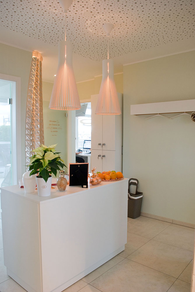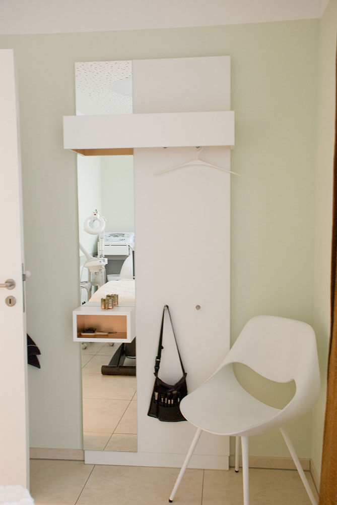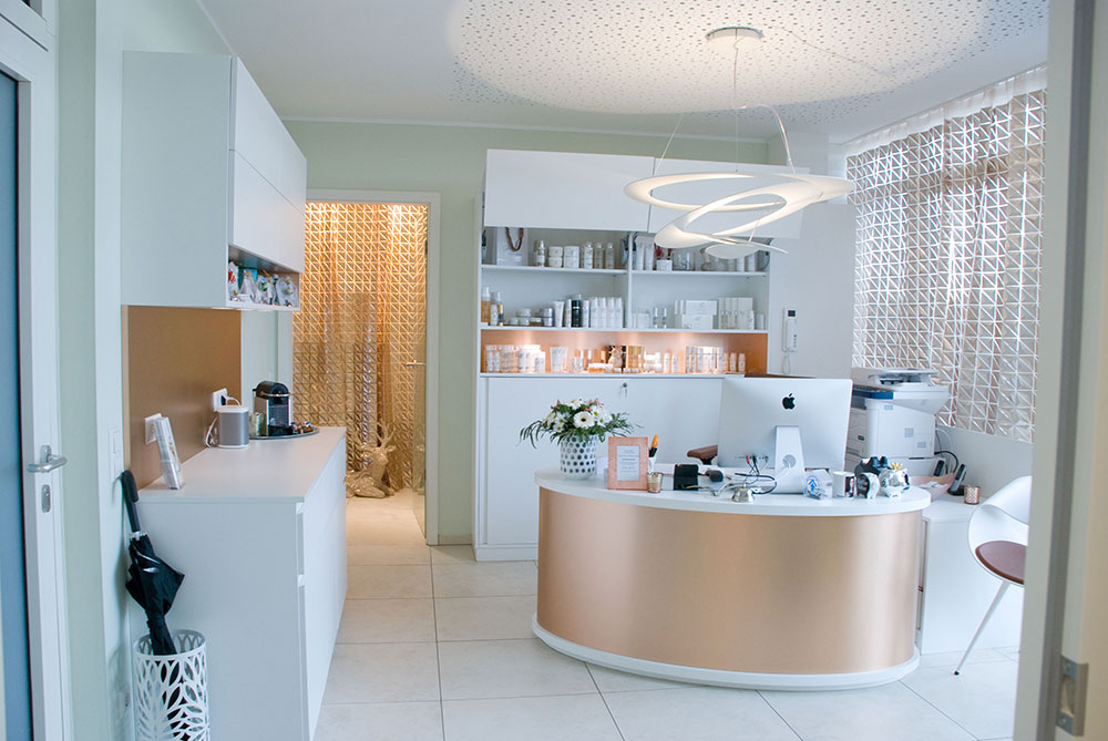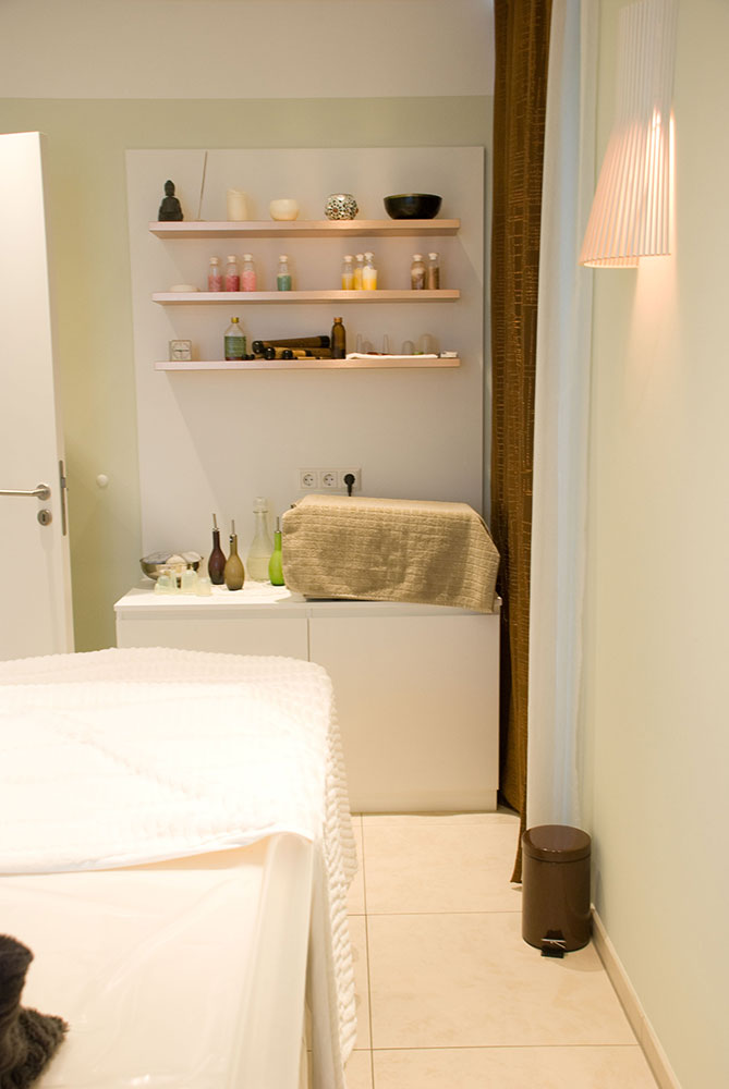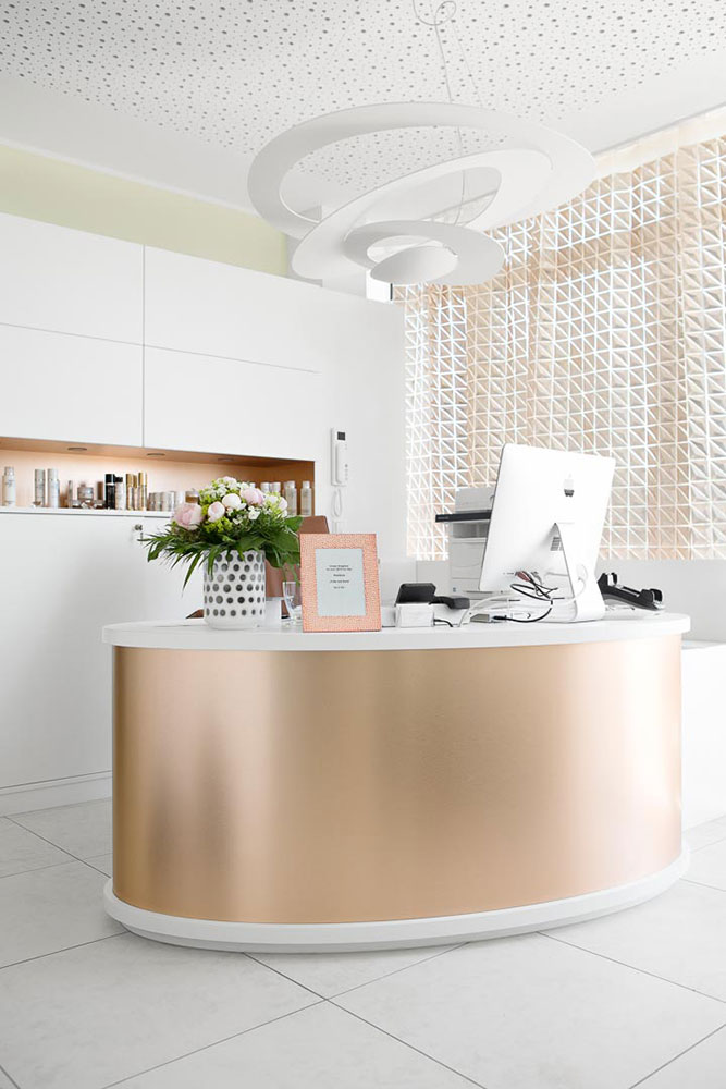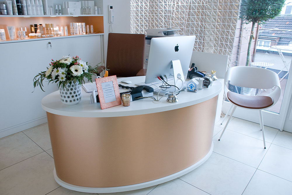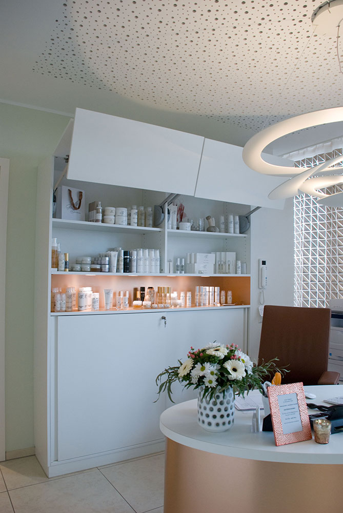 Schönheitsfarm über den Dächern von Ludwigsburg, gehobene Ausstattung für ein besonderes Erholungsgefühl. Ausstattung der Behandlungsräume, Bäder, des Empfangs- und Saunabereiches, Kombination weiß mit Kupfer, Beleuchtung bewusst auf Kupfer um einen sehr warmen Lichtton zu erhalten, viele durchdachte Details in Zusammenarbeit mit der Architektin.