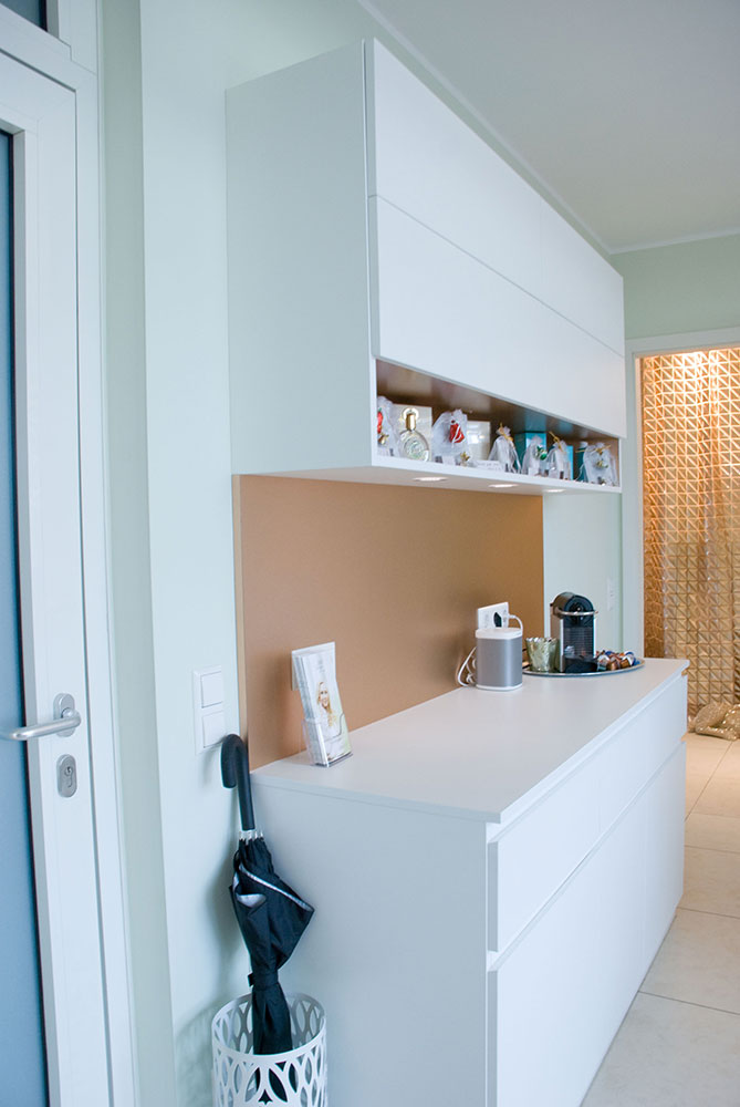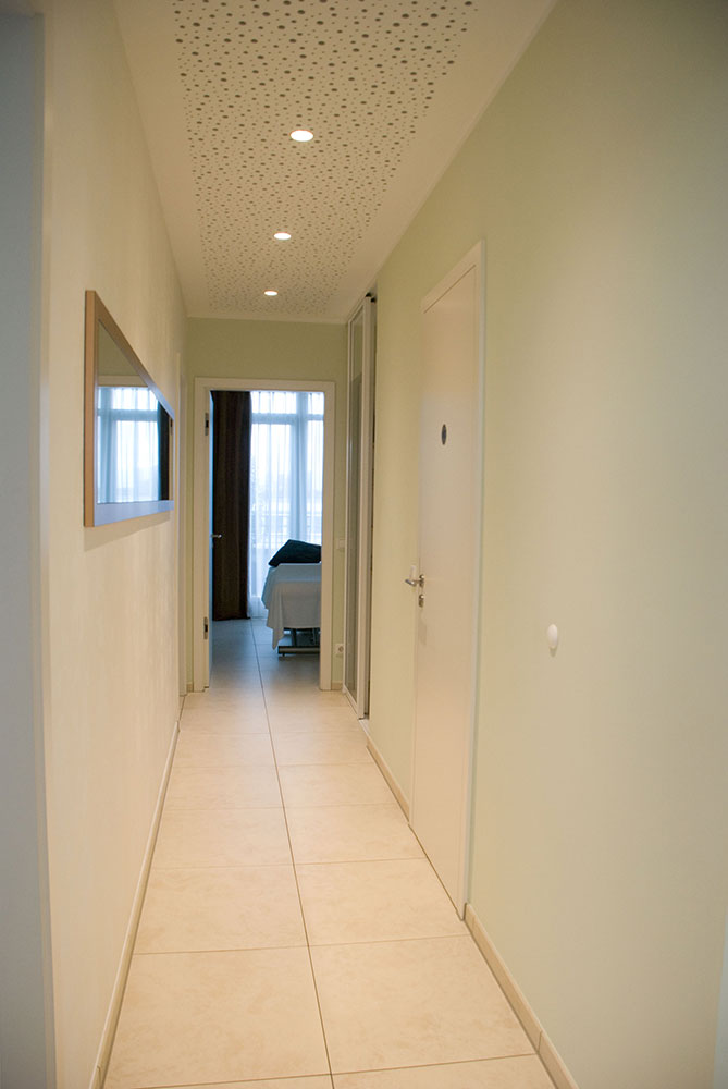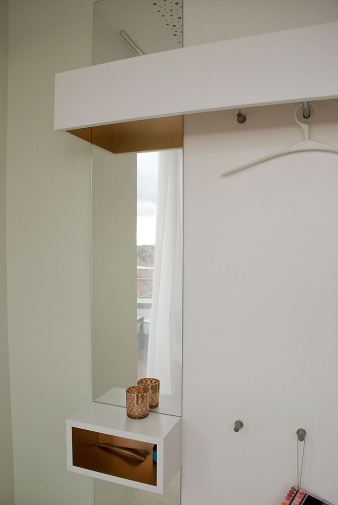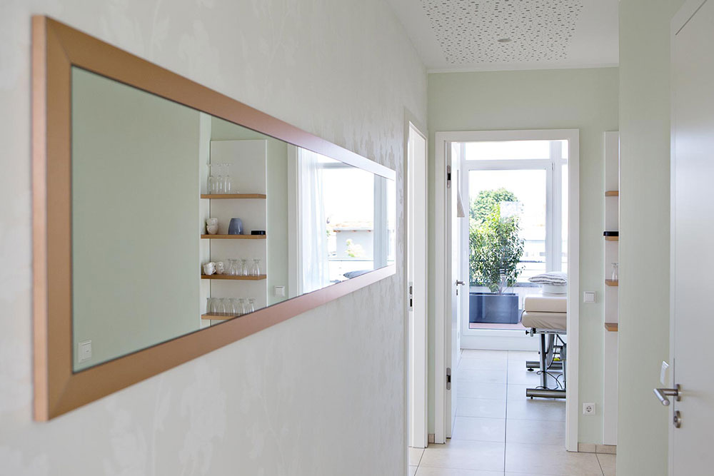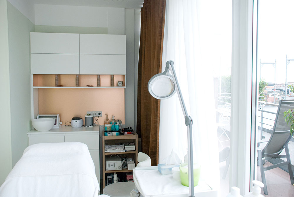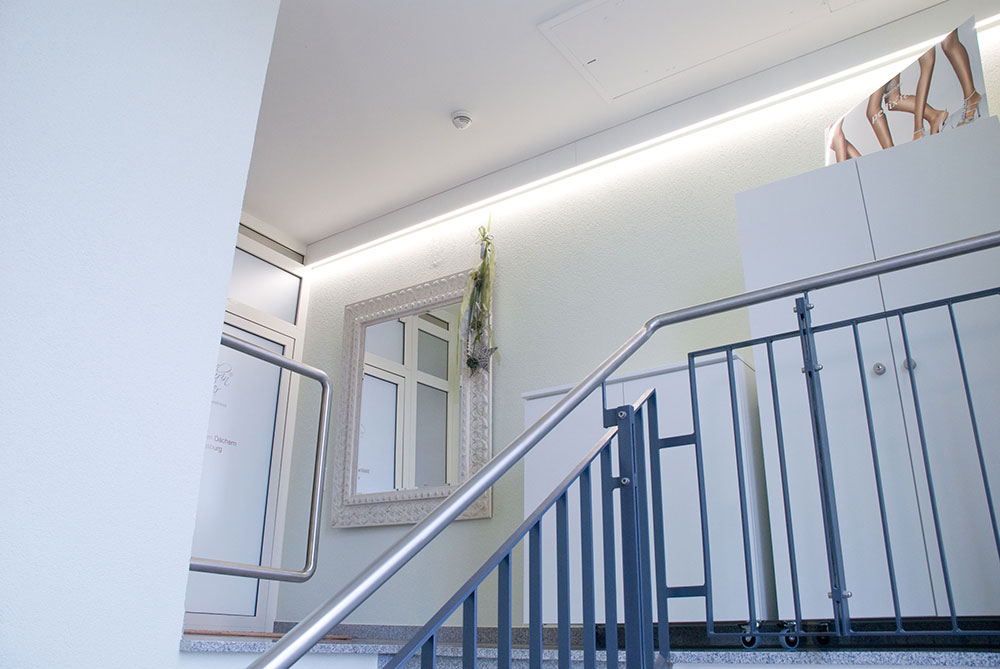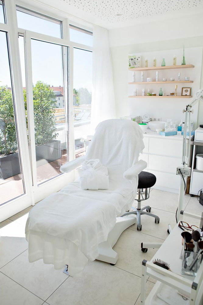 Schönheitsfarm über den Dächern von Ludwigsburg, gehobene Ausstattung für ein besonderes Erholungsgefühl. Ausstattung der Behandlungsräume, Bäder, des Empfangs- und Saunabereiches, Kombination weiß mit Kupfer, Beleuchtung bewusst auf Kupfer um einen sehr warmen Lichtton zu erhalten, viele durchdachte Details in Zusammenarbeit mit der Architektin.
