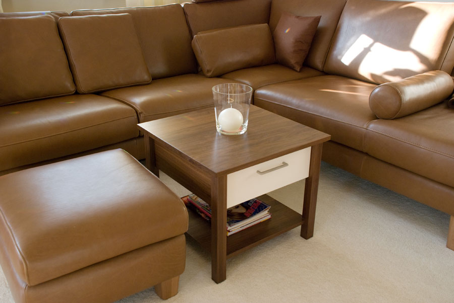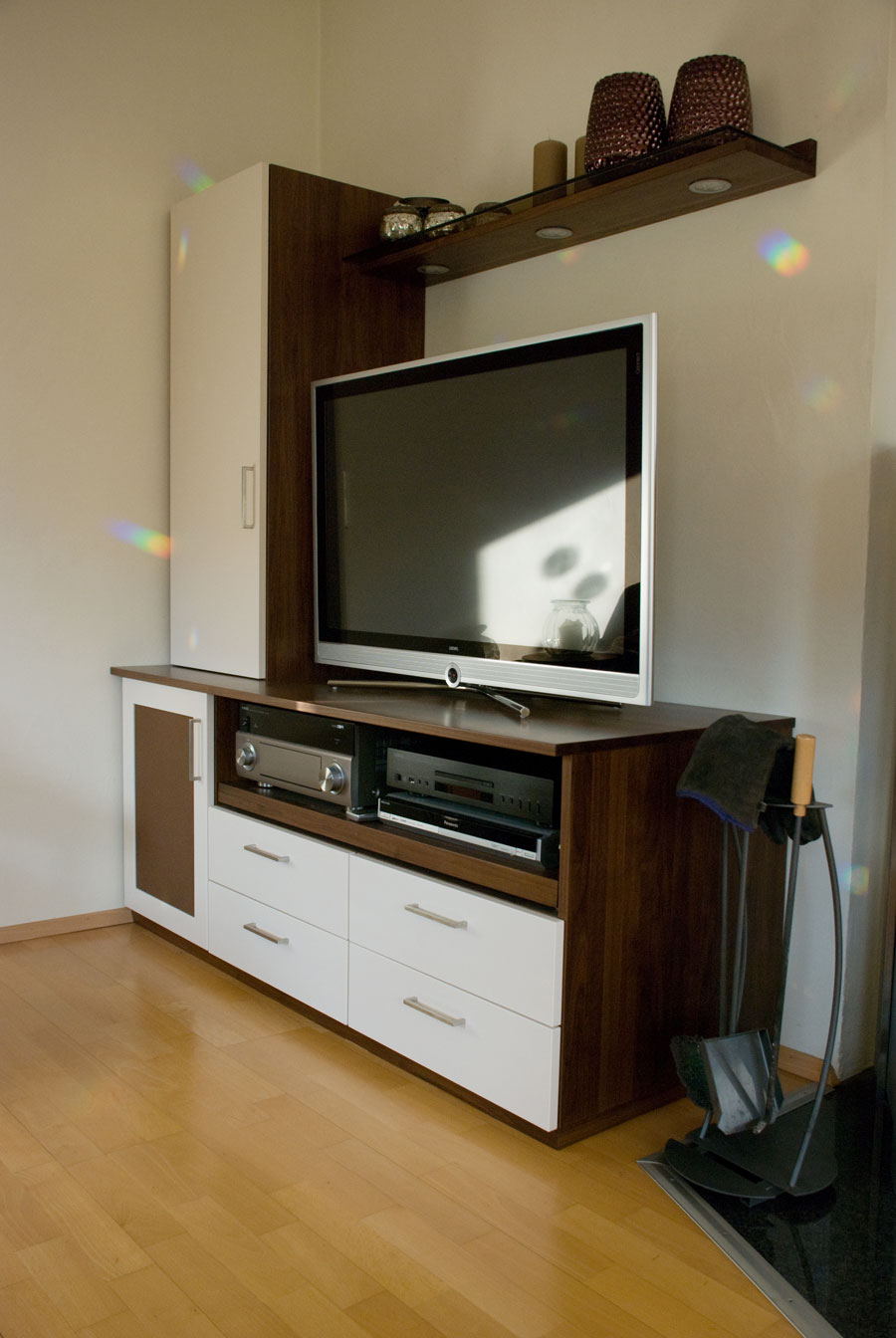 Oberfläche lackiert, Unterbau mit drei Schubladen in der Optik von vier Zügen, rechte untere Drehtüre mit Stoffbespannung für besseren Klang wegen dahinter liegenden Bassboxen, Geräteauszug über gesamte breite Unterschrank um besser an die Verkablung zu gelangen, Wandboard mit Glasplatte und unten beleuchtet mit dimmbaren LED-Strahlern, dazu passenden Stellschrank und Couchtisch in gleicher Ausführung.