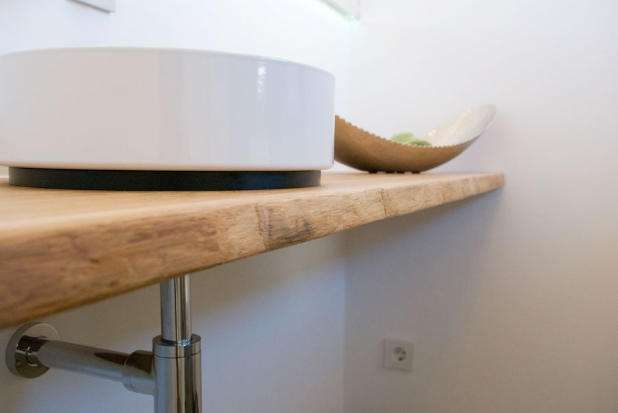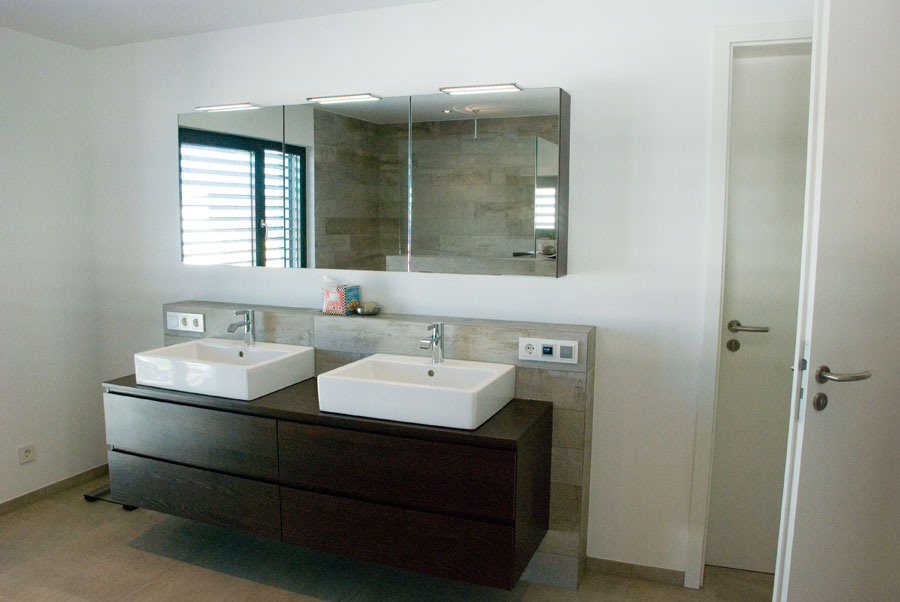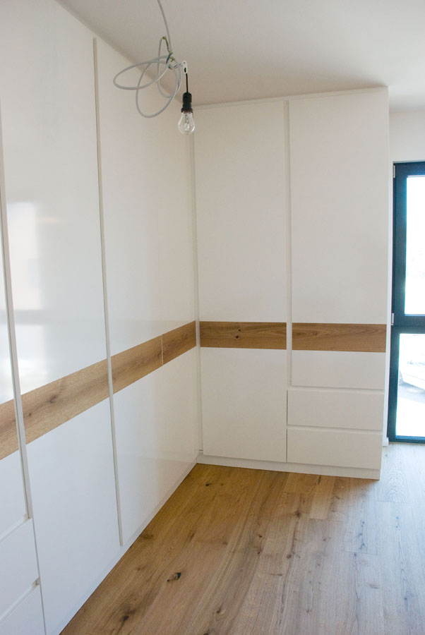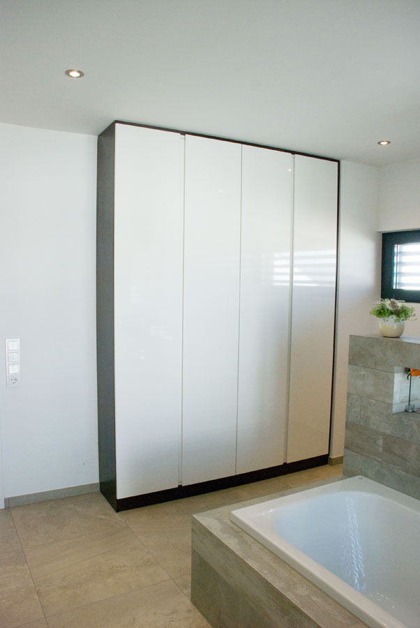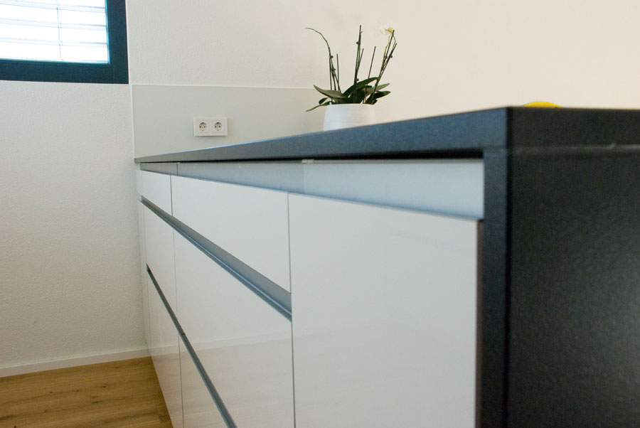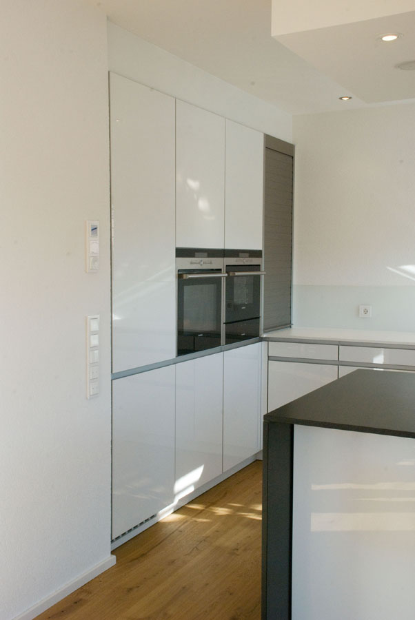 Grifflose Küche in Hochglanz Weiß mit Kücheninsel, die Arbeitsplatte besteht aus Granit, der Deckenkasten für den Dunstabzug mit Beleuchtung wurde flächenbündig eingelassen.