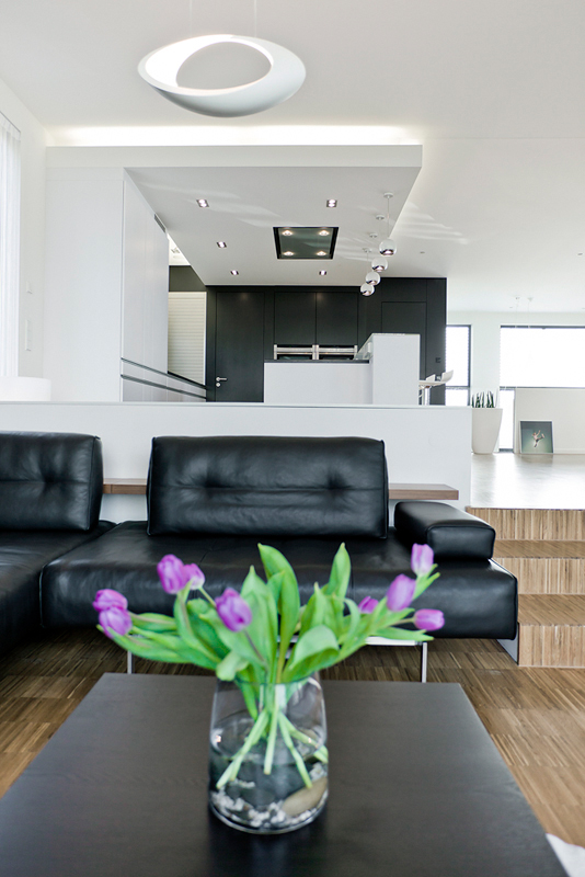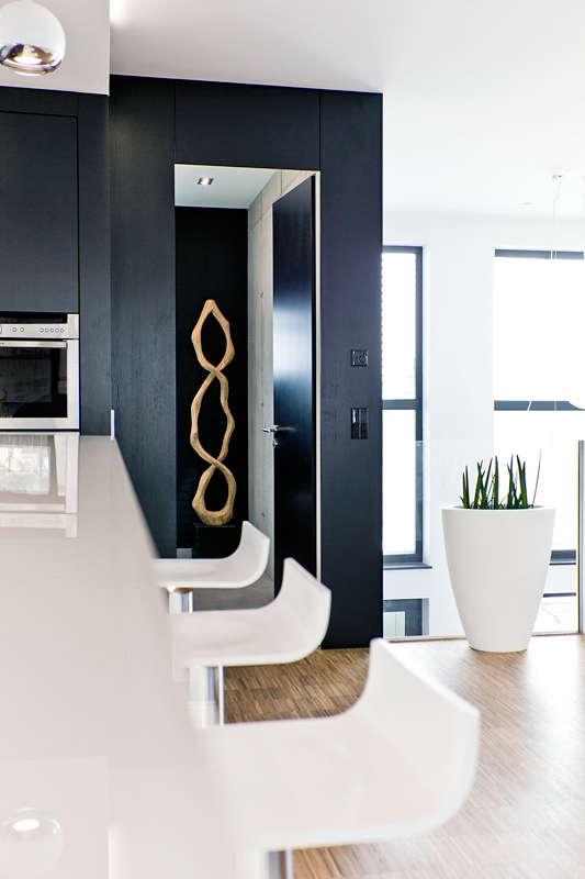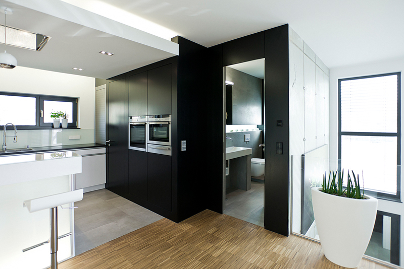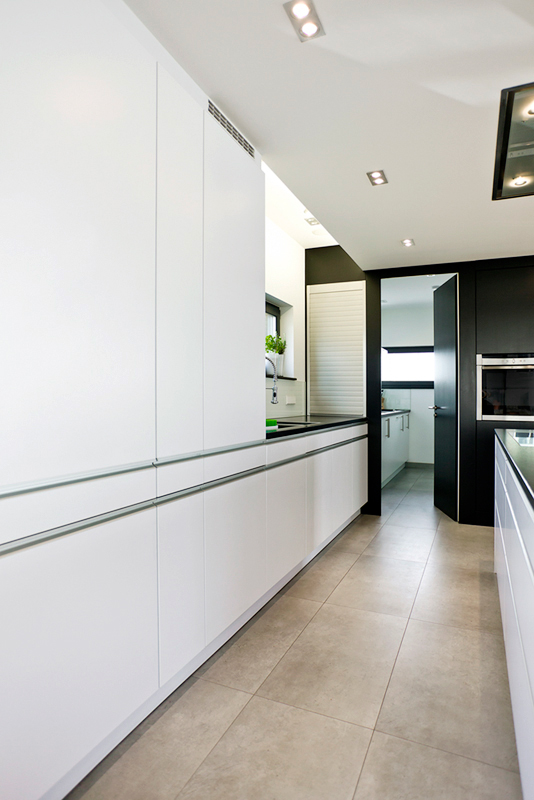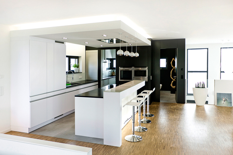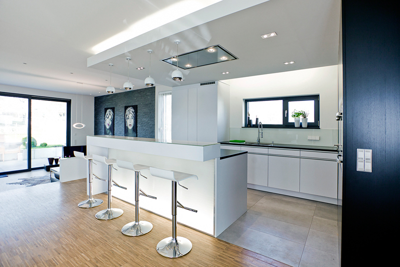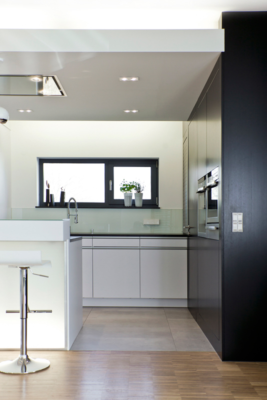 Grifflose Küche in Weiß, matt, mit eingelassenem Lüfter im Deckenkasten. L-förmige Theke mit Glasdeckplatte. Die Rückwand der Theke ist aus satiniertem Glas mit hintergründiger Beleuchtung. Die Wandverkleidung ist schwarz, die zwei integrierten Türen sind flächenbündigen und nach innen zu öffnen.