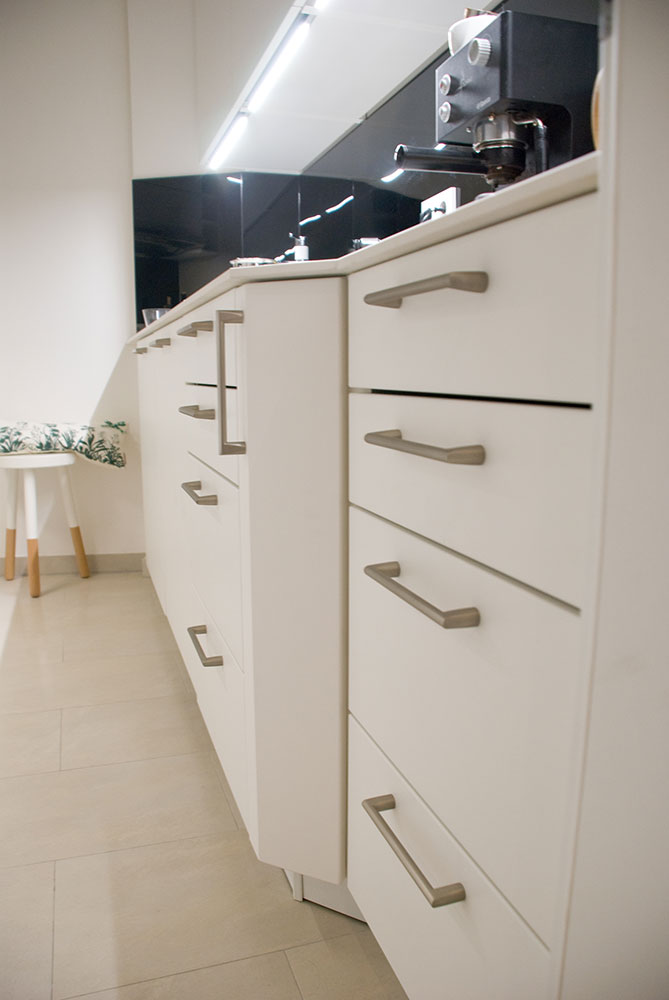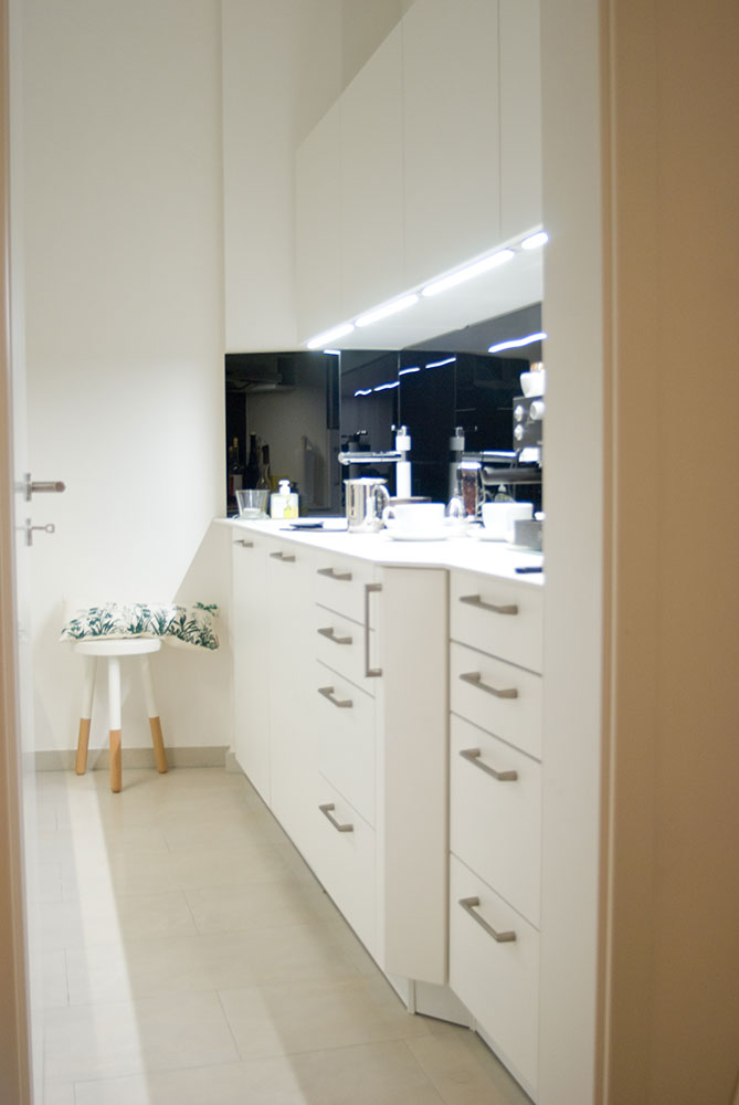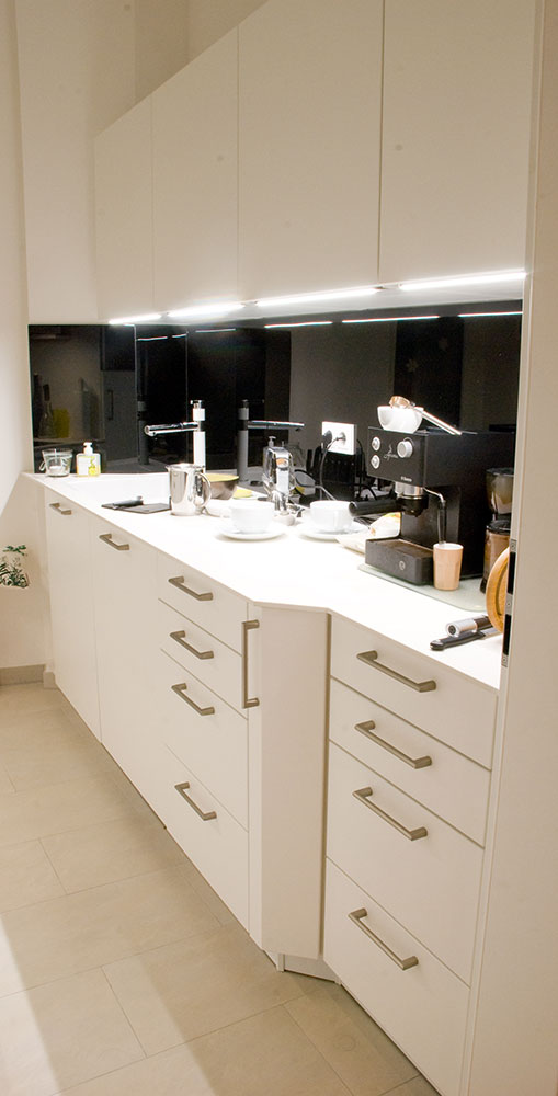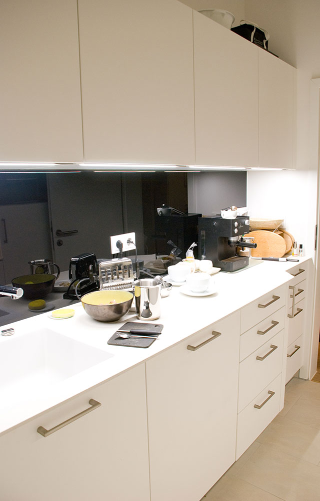Zwei Wandzeilen in renoviertem Altbau, Opberfläche weiß-matt lackiert, Glasrückwände schwarz lackiert, Spüle in weiß mit passendem Hahn, optimale Raumausnutzung auf engstem Raum.