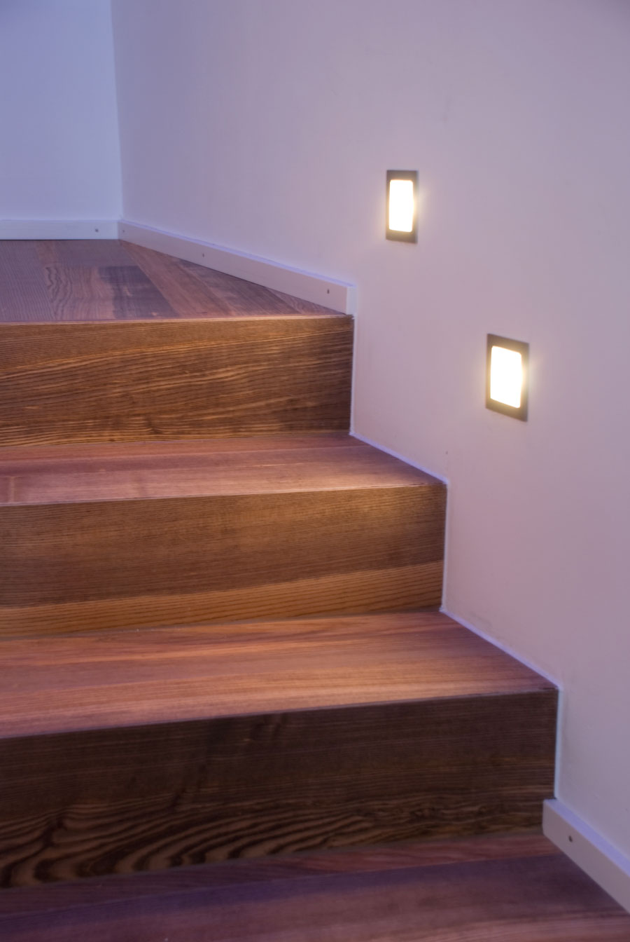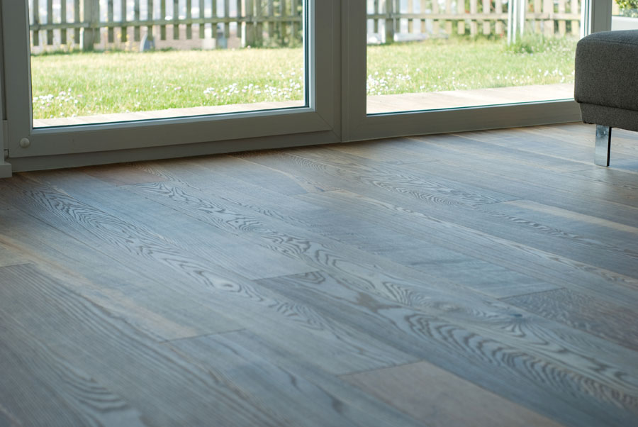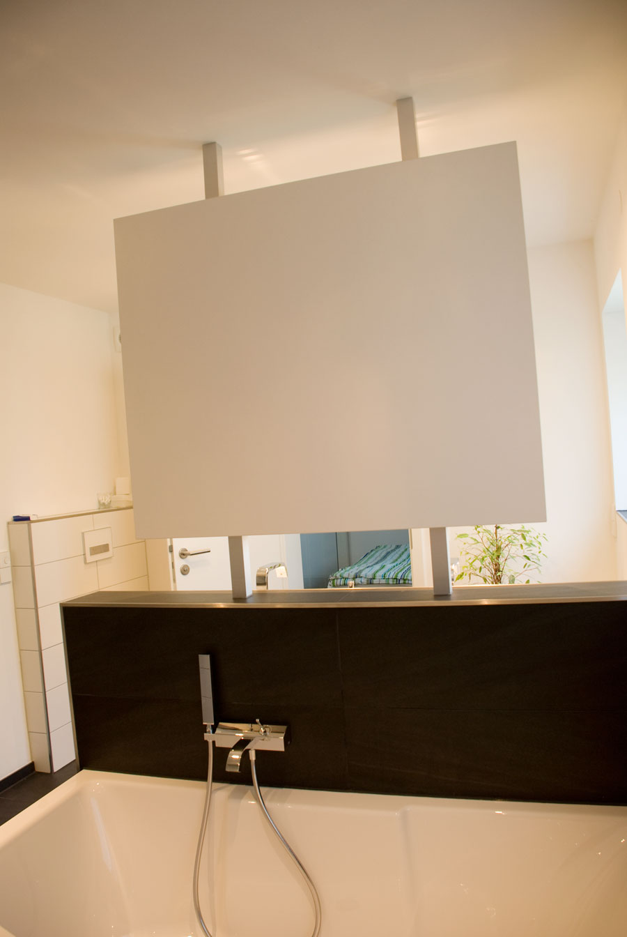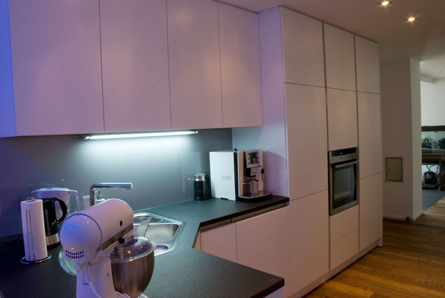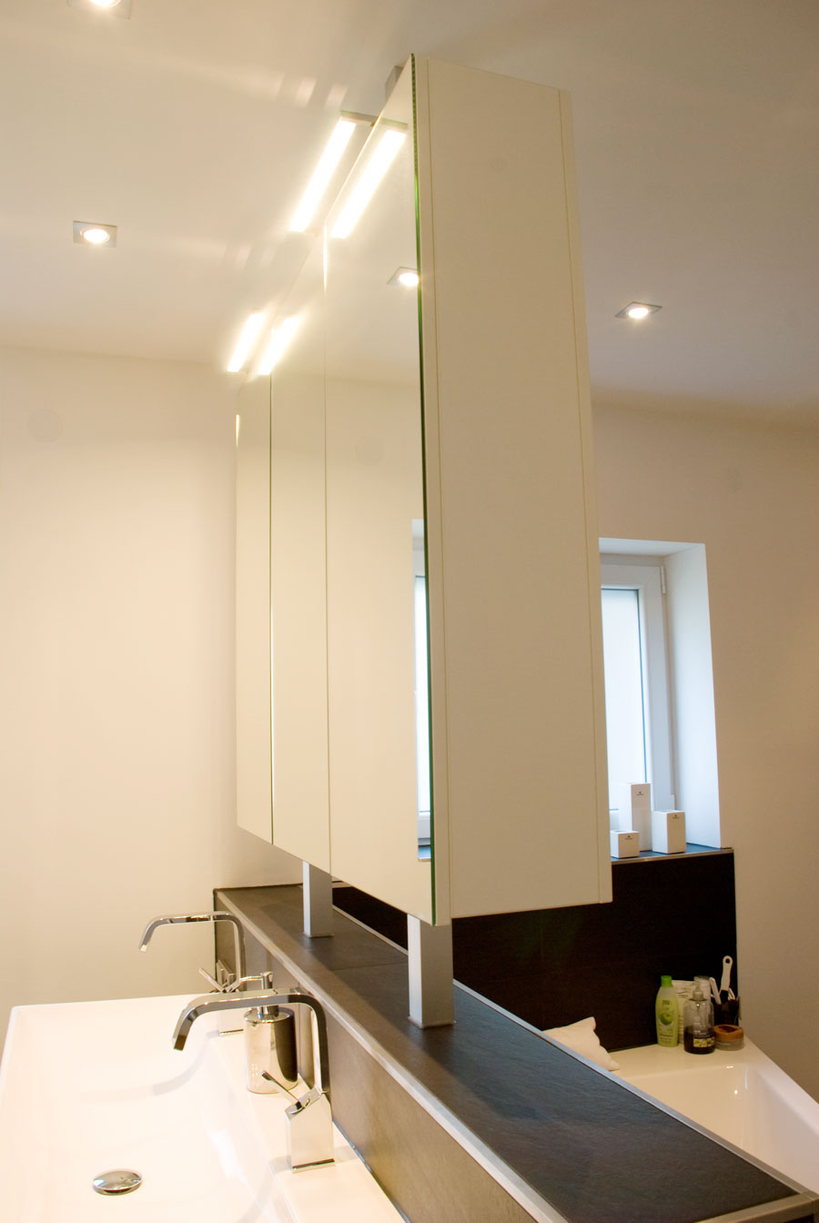 Parkett Eiche Barrique rustikal mit V-Fuge, Oberfläche geölt. Ein Einbauschrank mit Arbeitsplatz links. Der Badspiegelschrank wurde auf dioe Vormauerung gestellt . LED Beleuchtung darüber und von unten eingelassen. Grifflose Küche mit Granit-Arbeitsplatte und weiß-matter Oberfläche. Die Dunstabzughaube wurde flächenbündig in die Deckenabhängung eingelassen.