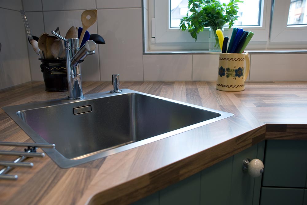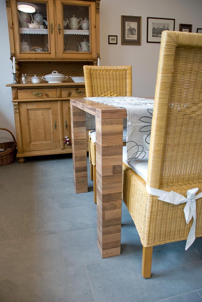 Hier wurde eine Küche im Vintage-Style in Zusammenarbeit mit unserer Schreinerei verbaut. Unterbauten sind aus massivem amerikanischem Nussbaum und offen gehalten. Der Esstisch wurde von unserer Schreinerei dem entsprechenden aus Dekormaterial angefertigt.