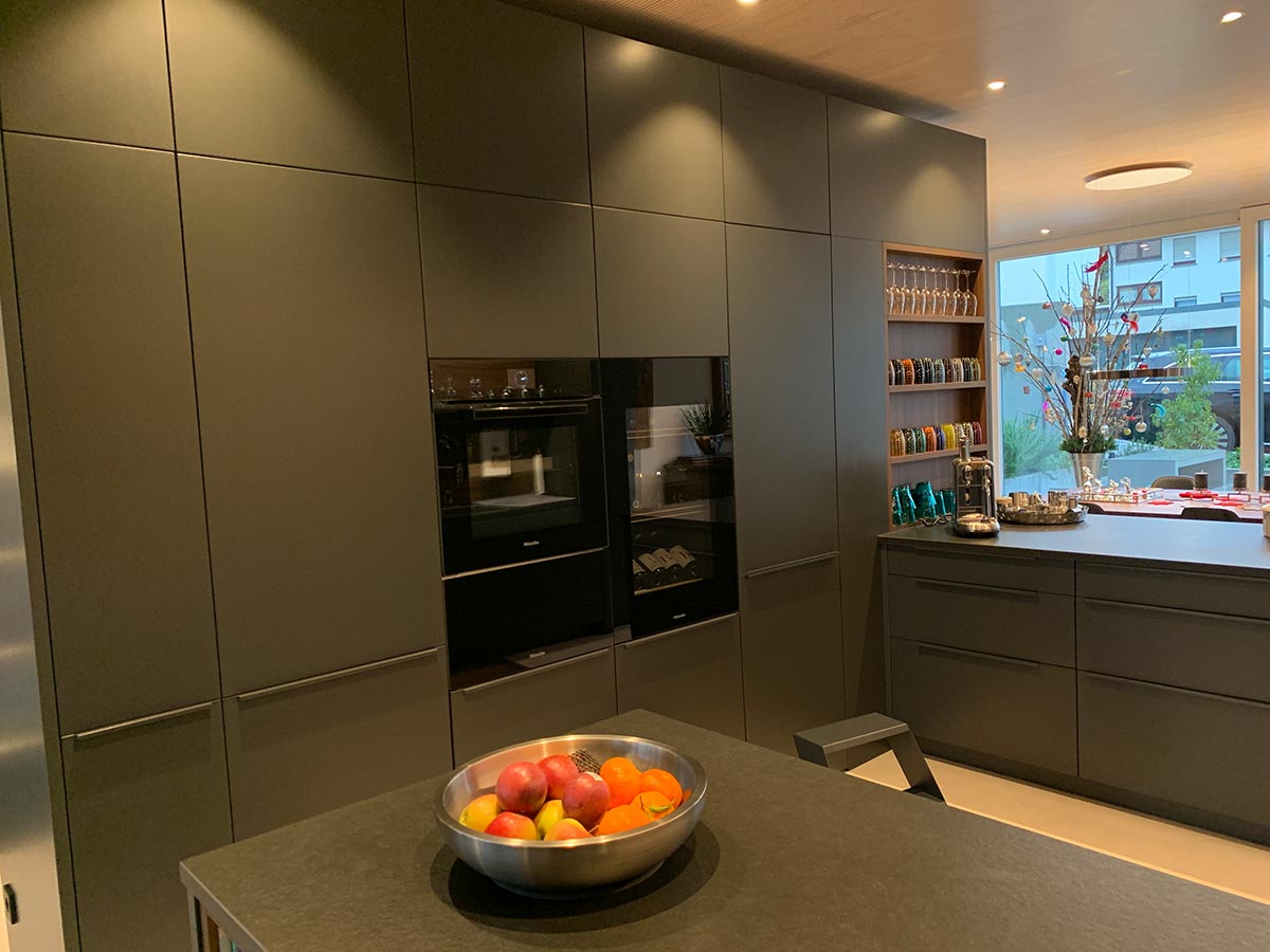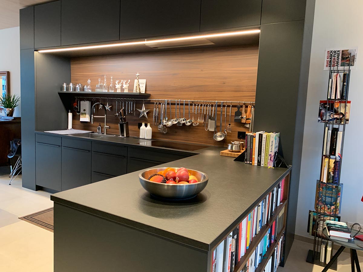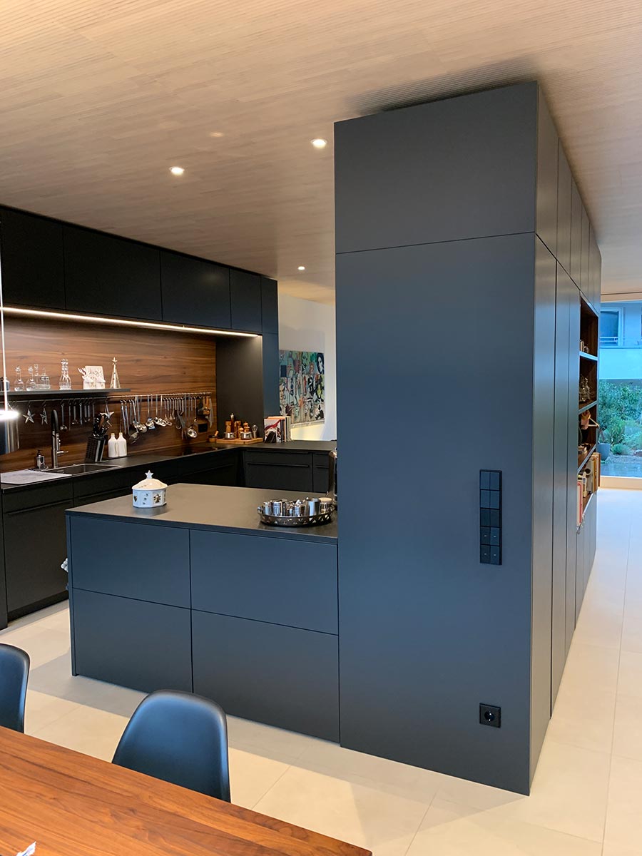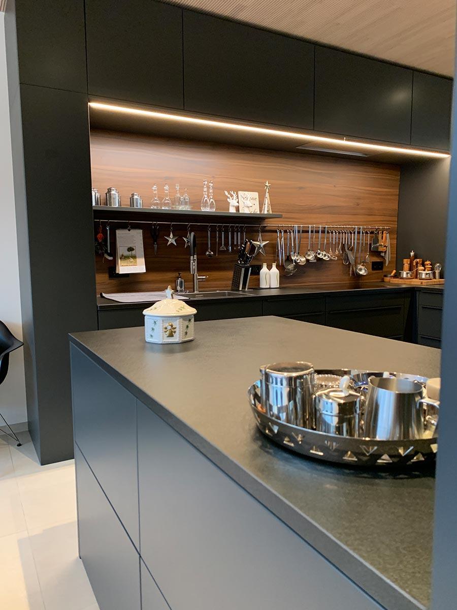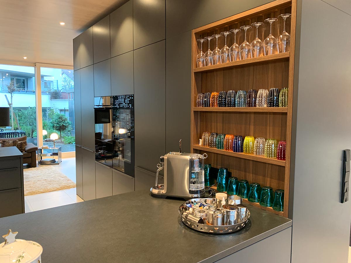 Die Küche von Leicht mit carbongrauen Fronten in Strukturlack matt integriert sich in den offenen Koch- und Essbereich. Die Regale und Rückwände in wurden in nussbaum ausgeführt und die Arbeitsplattein Neolith Keramik. Die rückseitig gelegene Garderobe wurde von unserer Schreinerei in der Küche integriert. Das offene Konzept wurde mit Einbaugeräten von Miele bestückt.