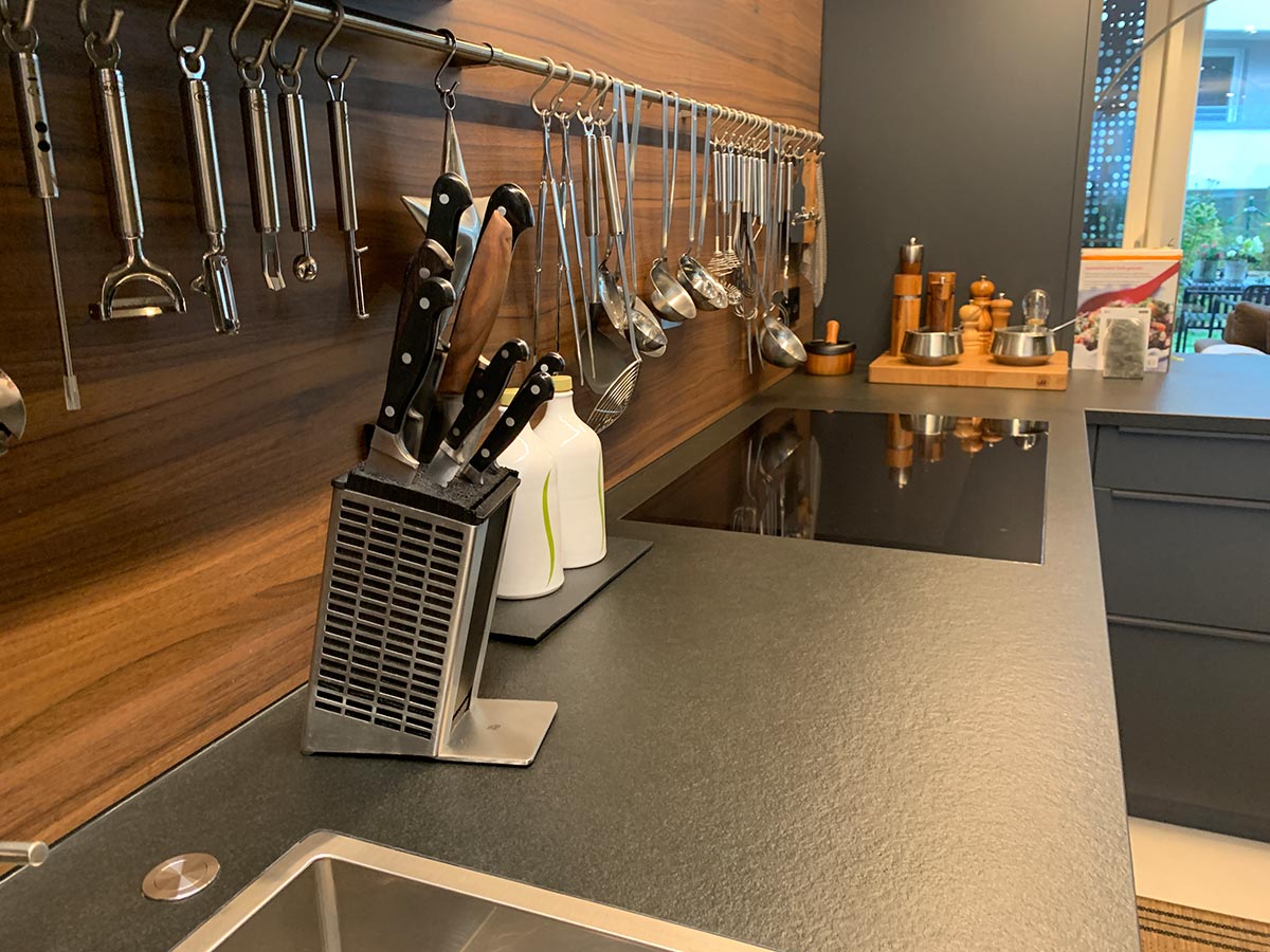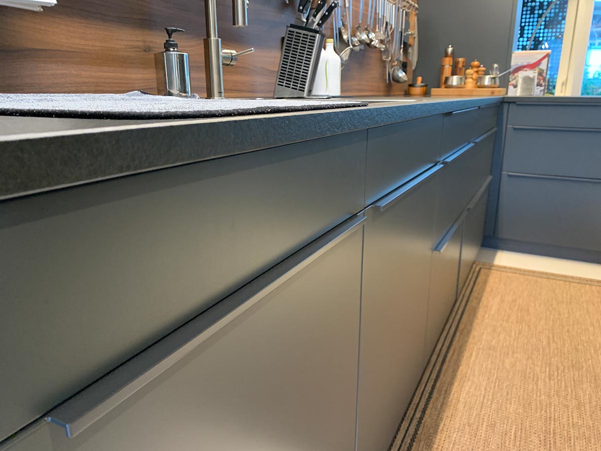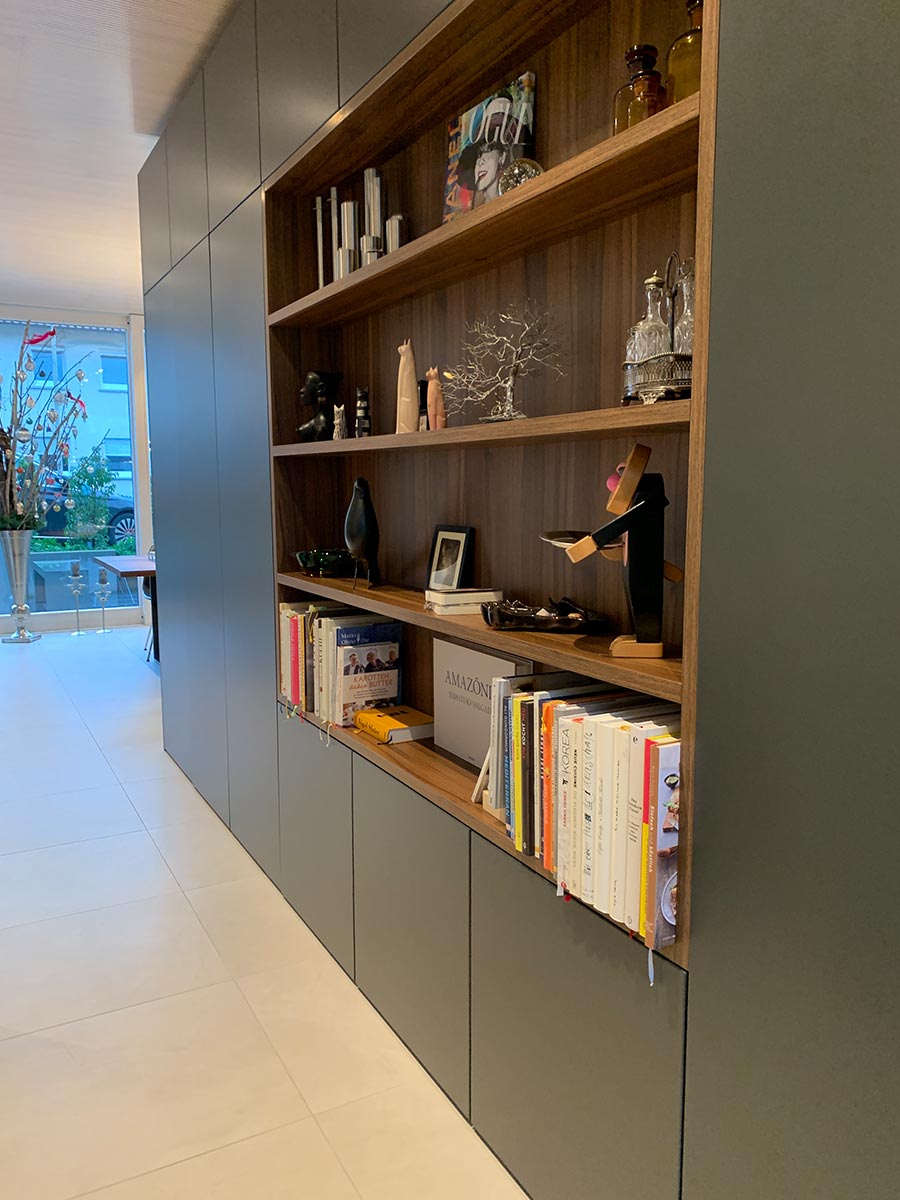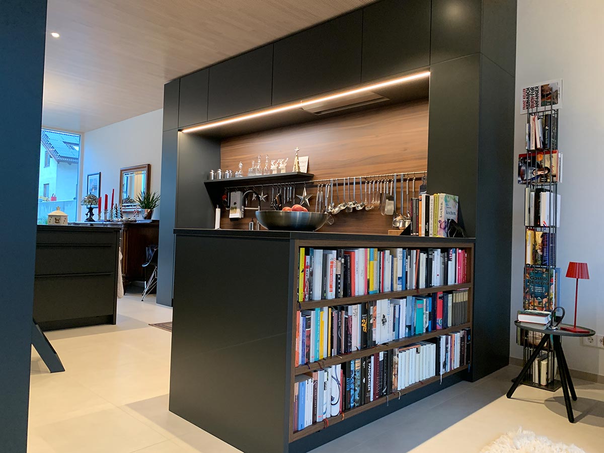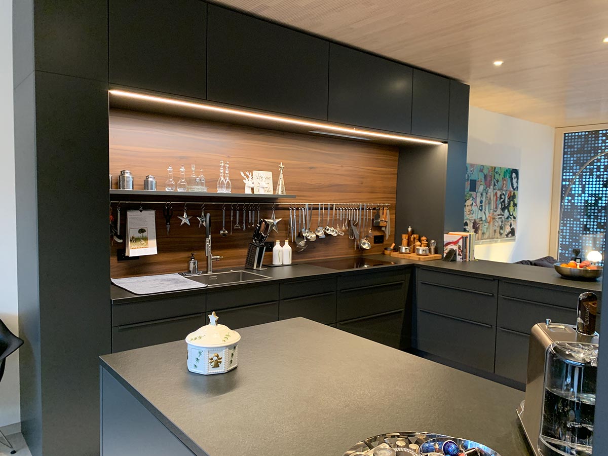 Die Küche von Leicht mit carbongrauen Fronten in Strukturlack matt integriert sich in den offenen Koch- und Essbereich. Die Regale und Rückwände in wurden in nussbaum ausgeführt und die Arbeitsplattein Neolith Keramik. Die rückseitig gelegene Garderobe wurde von unserer Schreinerei in der Küche integriert. Das offene Konzept wurde mit Einbaugeräten von Miele bestückt.