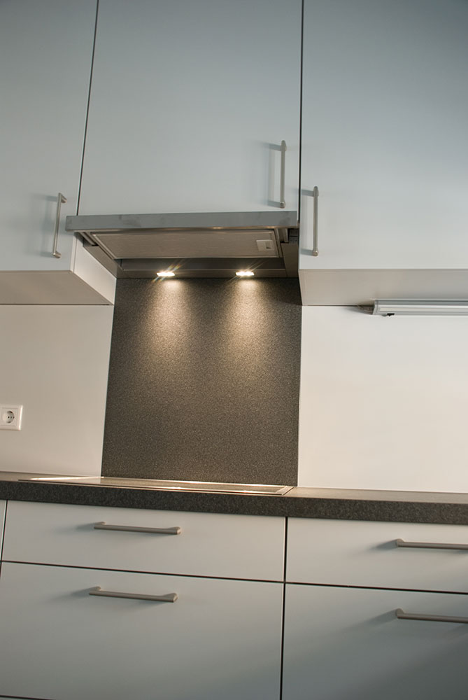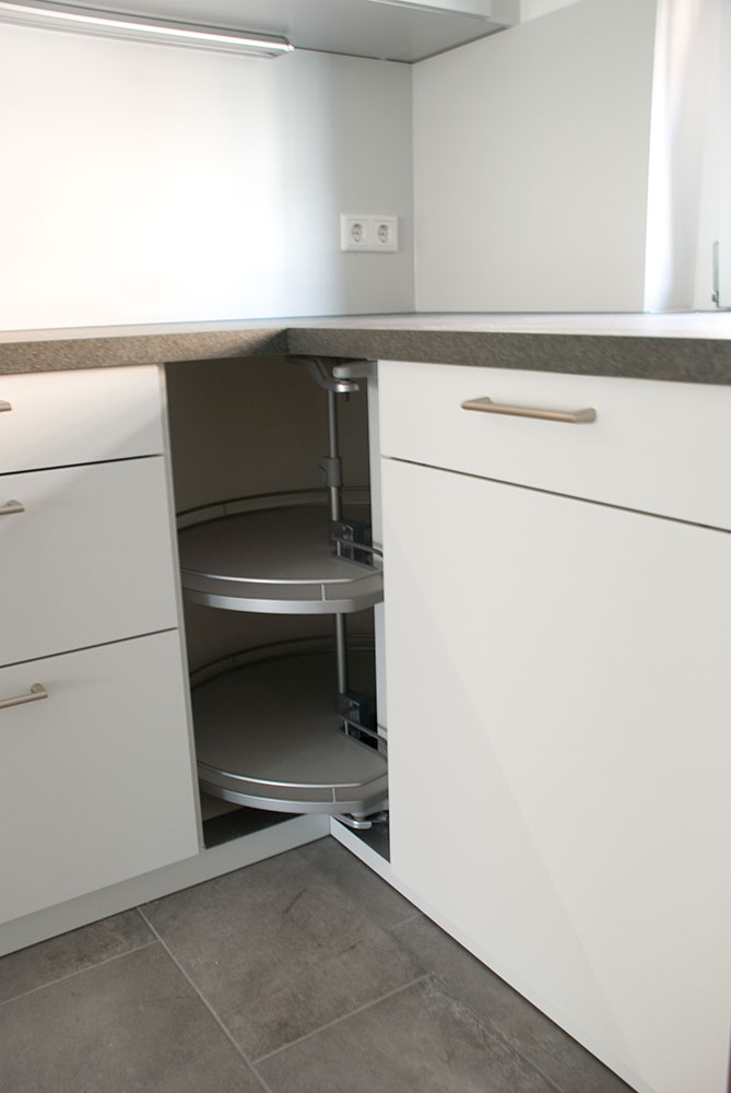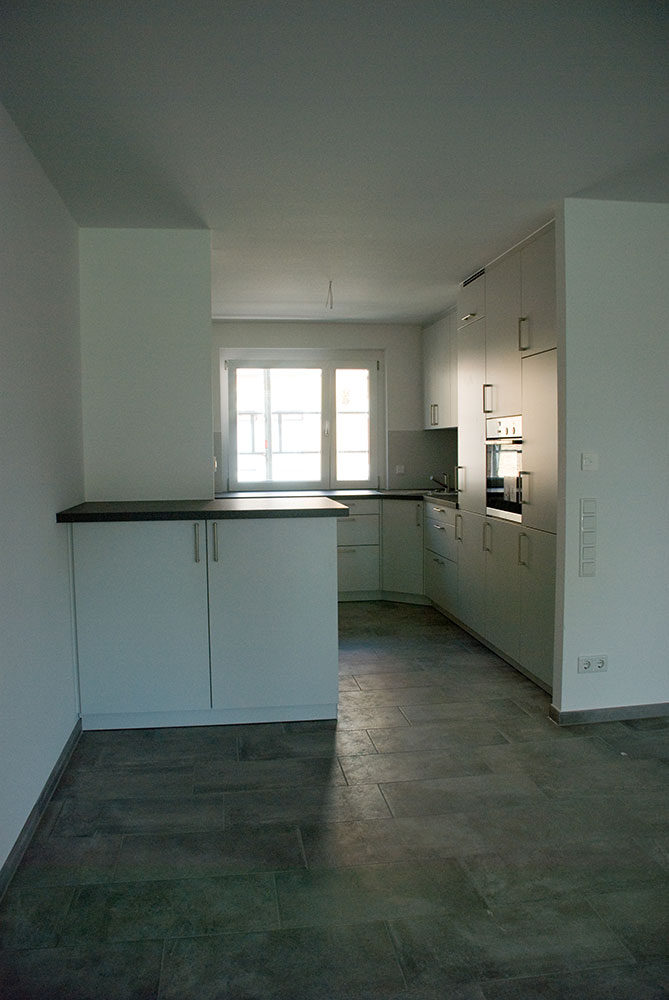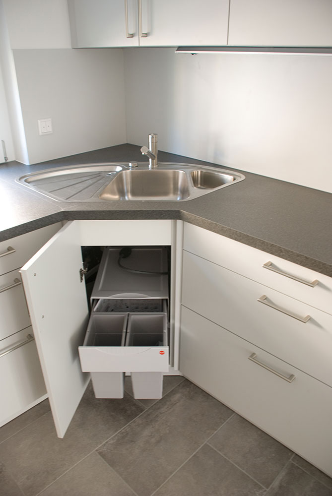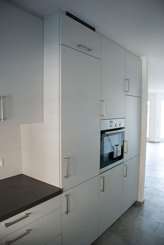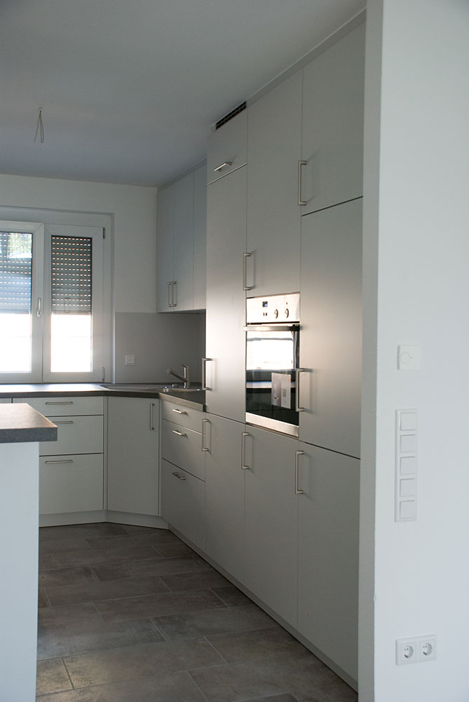 Hier wurde eine Küche in Kunstoff weiß installiert. Die Arbeitsplatte wurde in Steinoptik ausgeführt. Die Spüle ist über Eck eingebaut und der Backofen wurde auf Arbeitshöhe untergebracht.