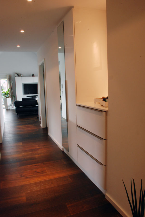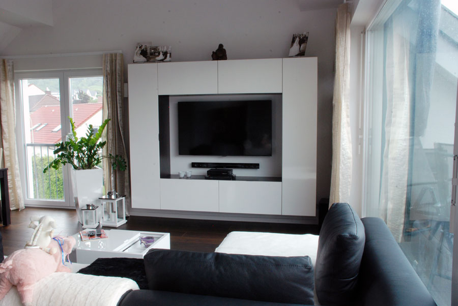 Arbeitsplatte in Schwarz, das Kochfeld wurde bündig eingelassen. Der Backofen befindet sich in angenehmer Arbeitshöhe.
