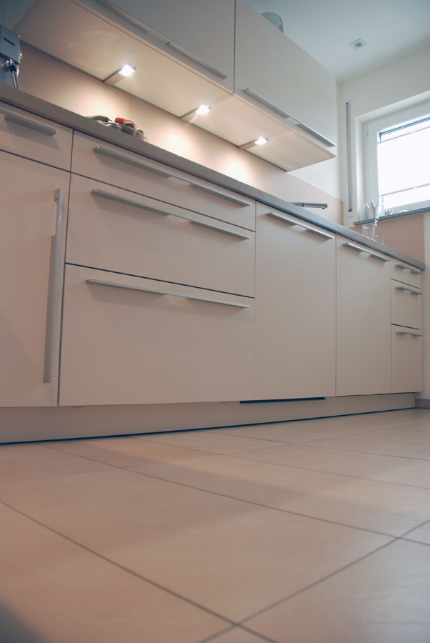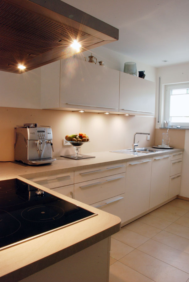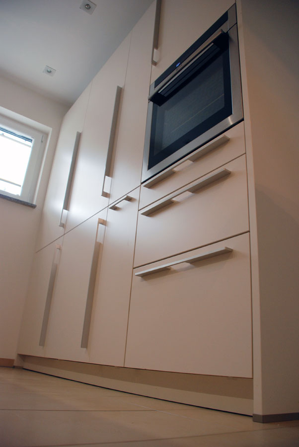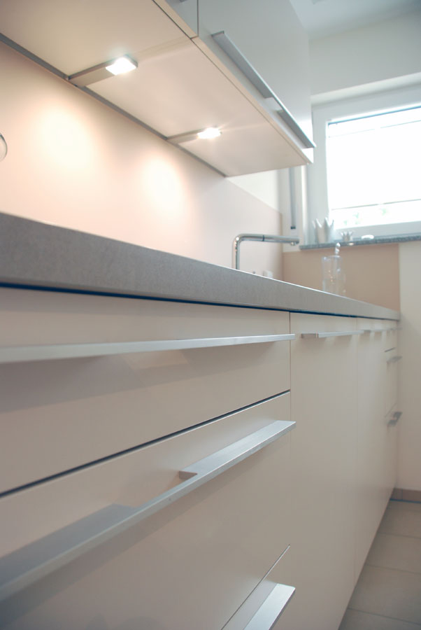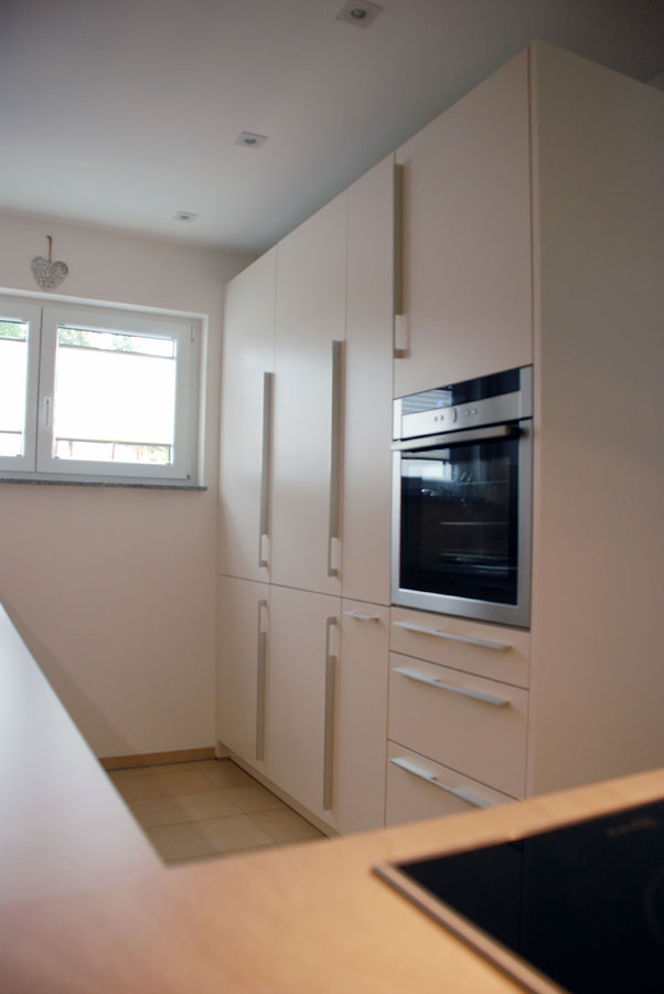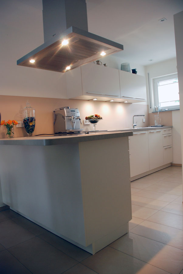 Küche in Weiß, matt, mit Edelstahlgriffen