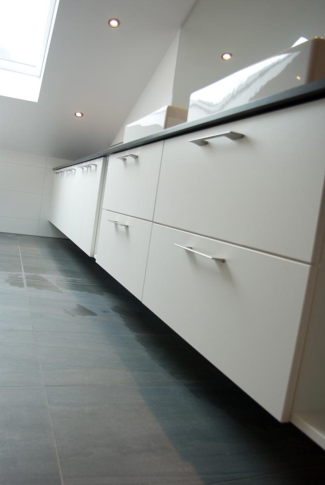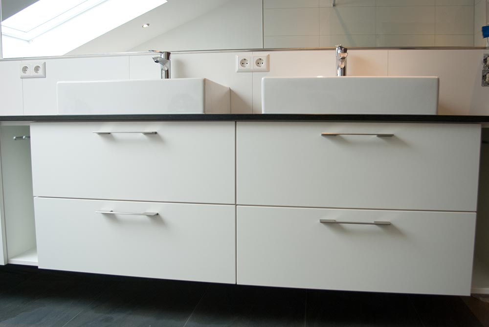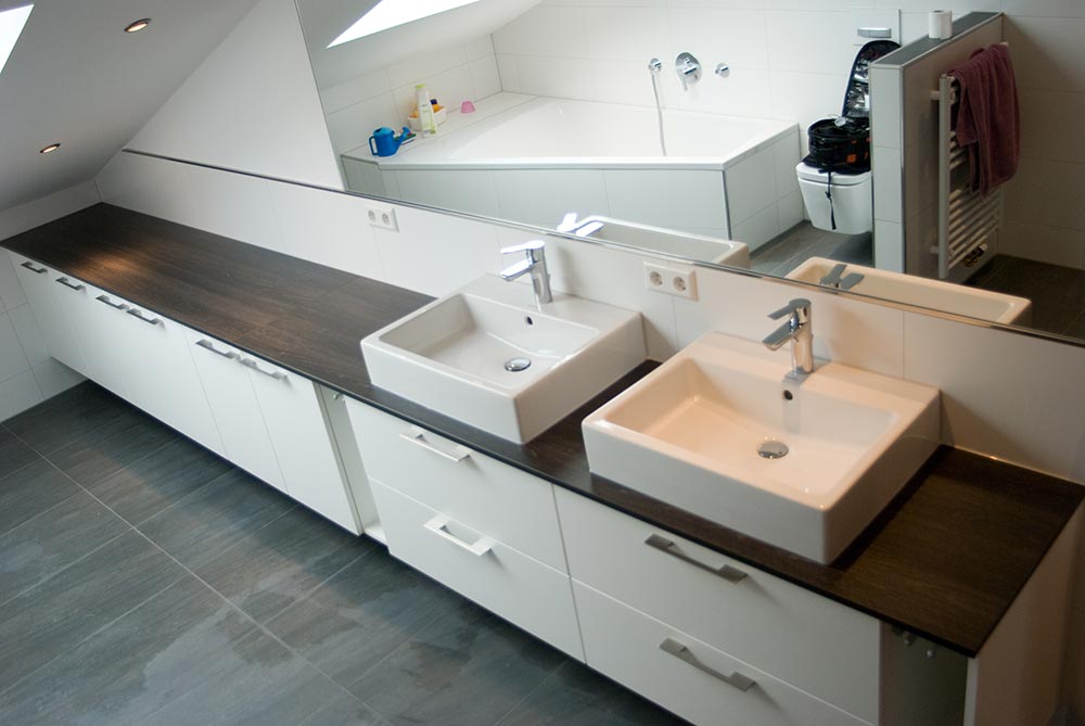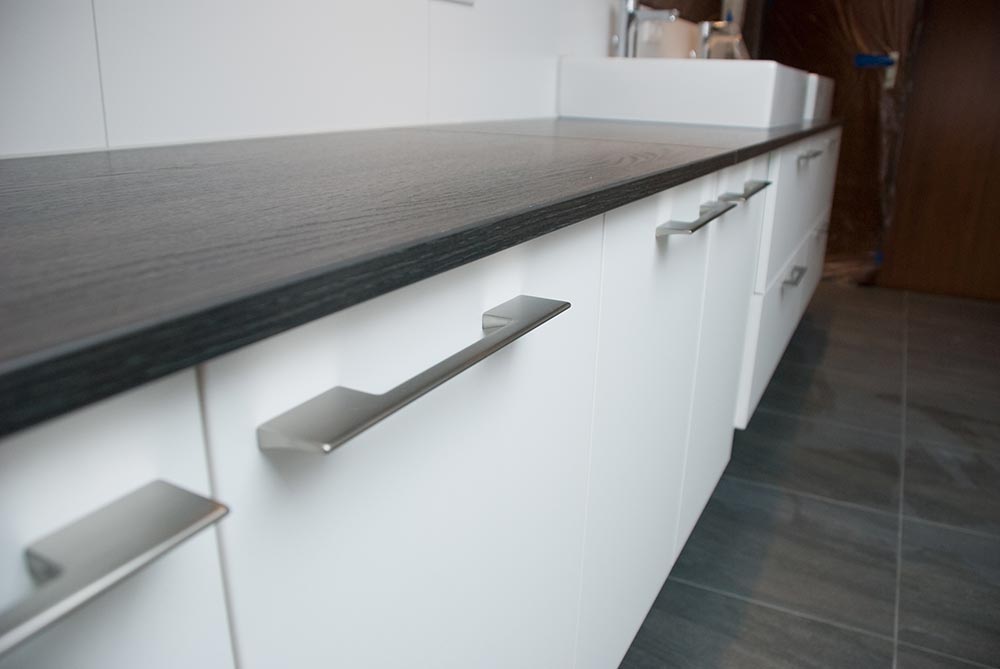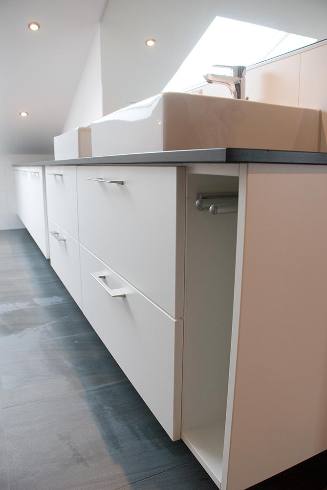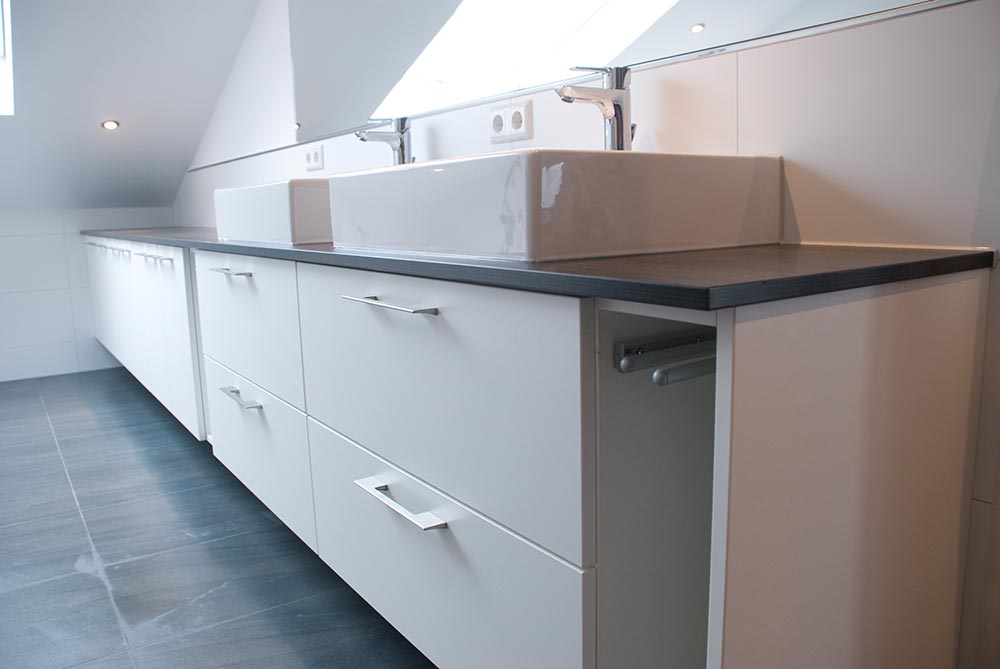 Das Kochfeld und Spülbecken wurden in die Arbeitsplatte eingelassen, der Abtropfbereich mit eingefrästen Rillen versehen. Im Badbereich wurde ein Badunterbau in Kunststoff / weiß über gesamte Wandbreite mit Schubkästen, Drehtüren und zwei offenen Bereichen mit Handtuchhalter installiert. Die Deckplatte in dunklem Holzdekor wurde hier bewusst kontrastreich verwendet.