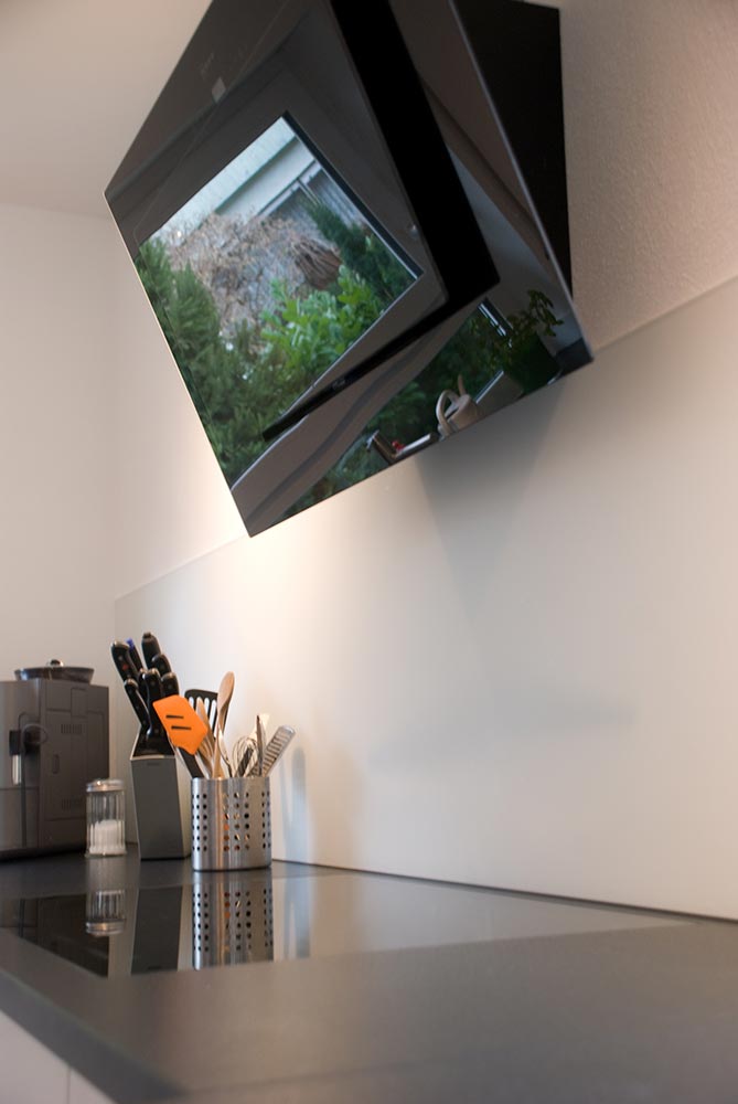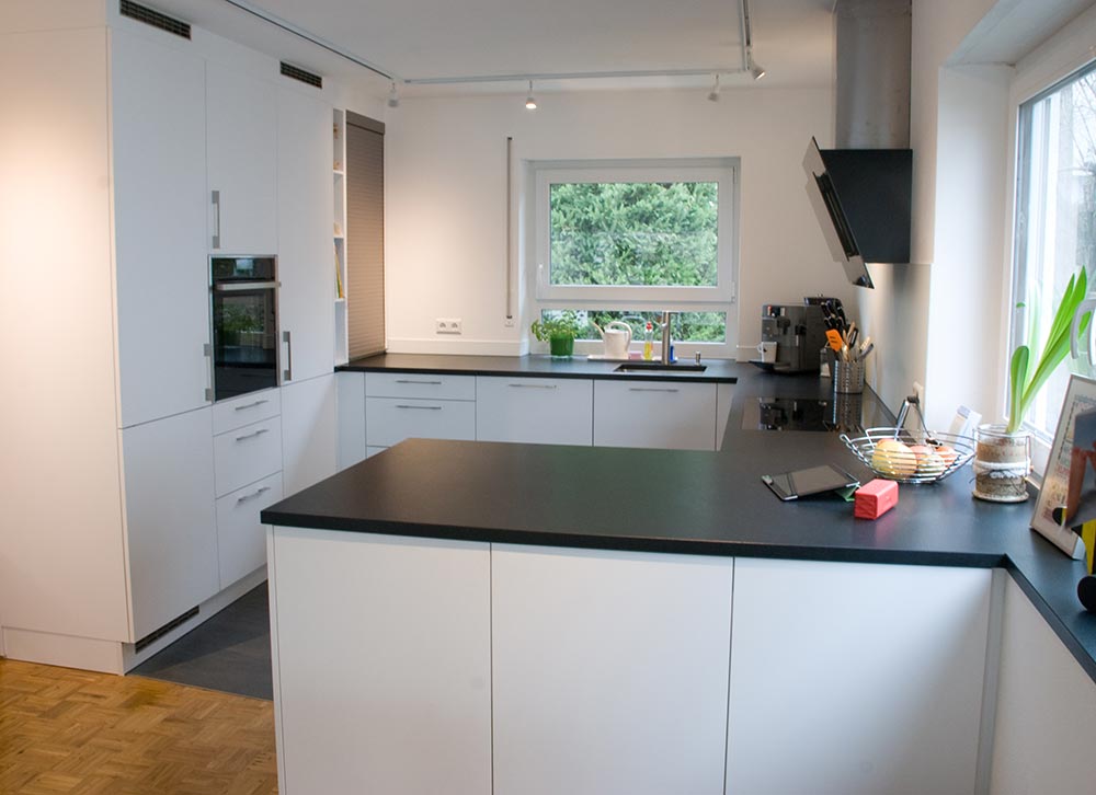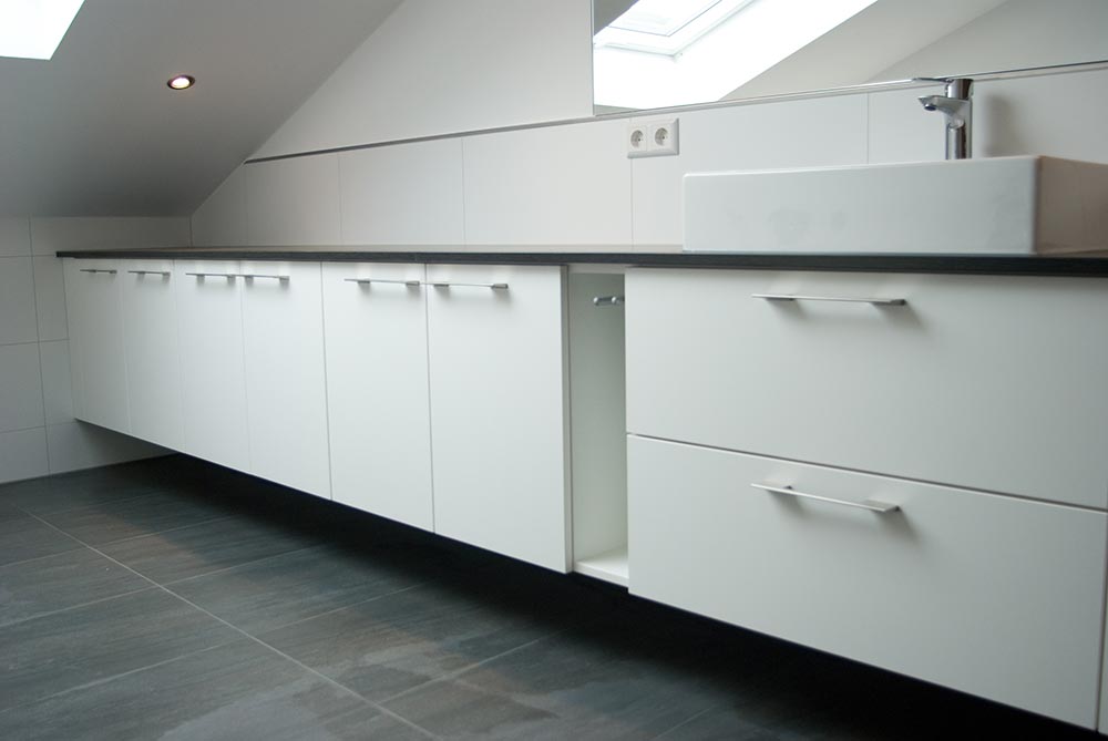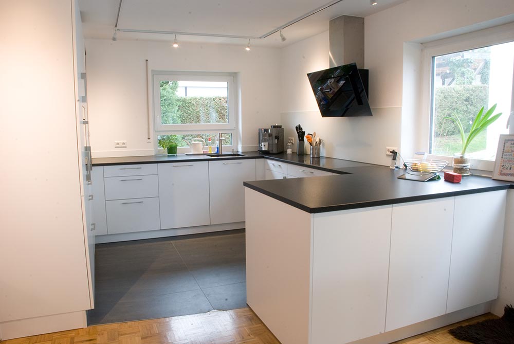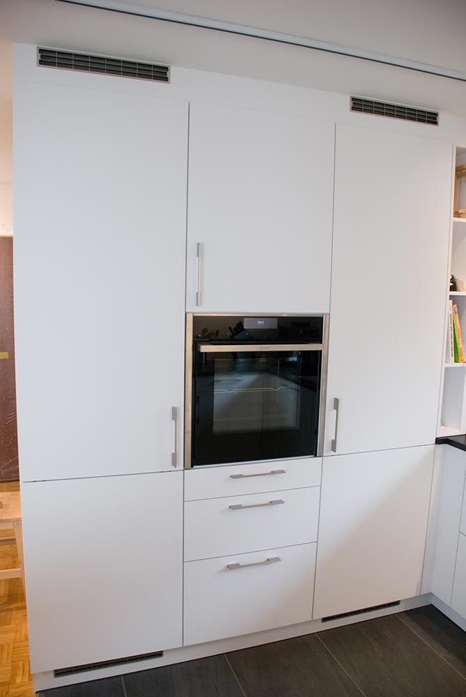 Das Kochfeld und Spülbecken wurden in die Arbeitsplatte eingelassen, der Abtropfbereich mit eingefrästen Rillen versehen. Im Badbereich wurde ein Badunterbau in Kunststoff / weiß über gesamte Wandbreite mit Schubkästen, Drehtüren und zwei offenen Bereichen mit Handtuchhalter installiert. Die Deckplatte in dunklem Holzdekor wurde hier bewusst kontrastreich verwendet.