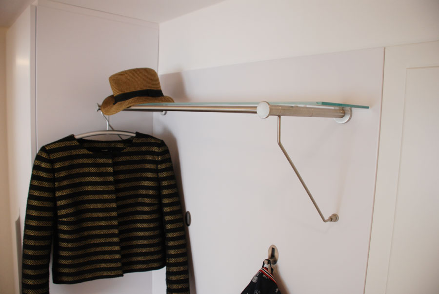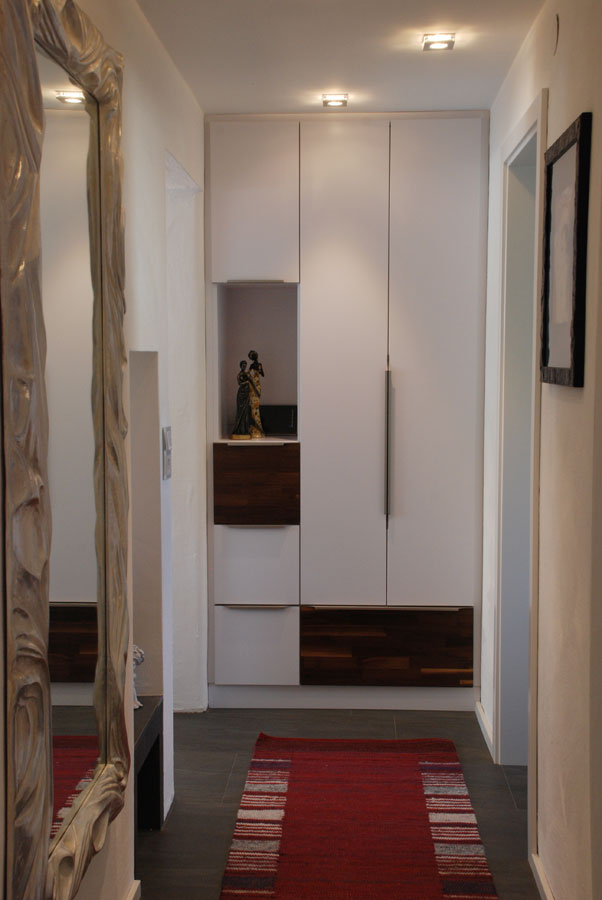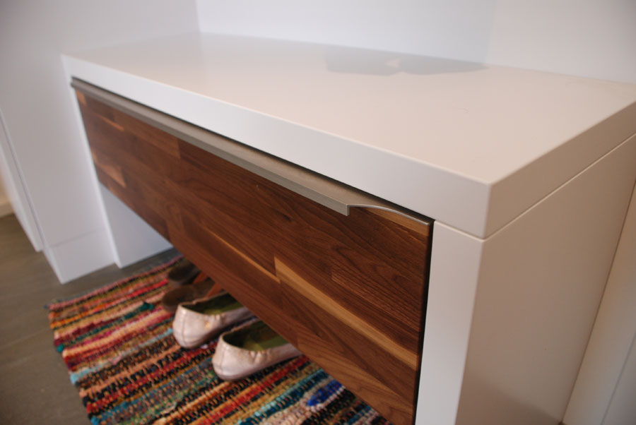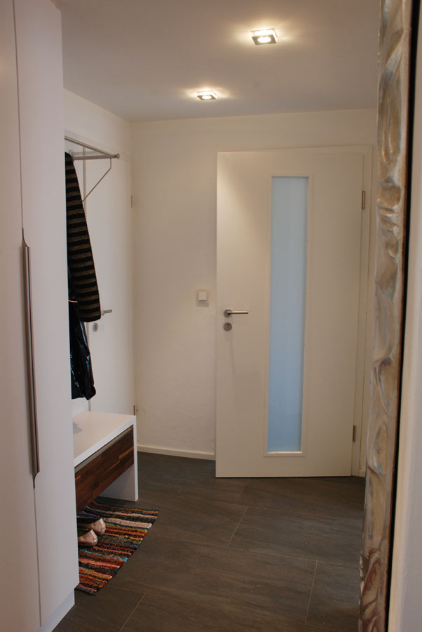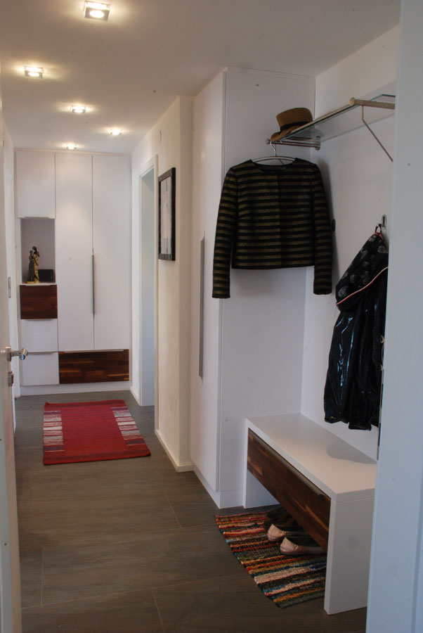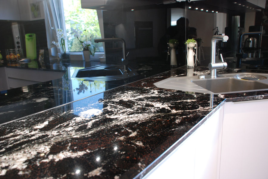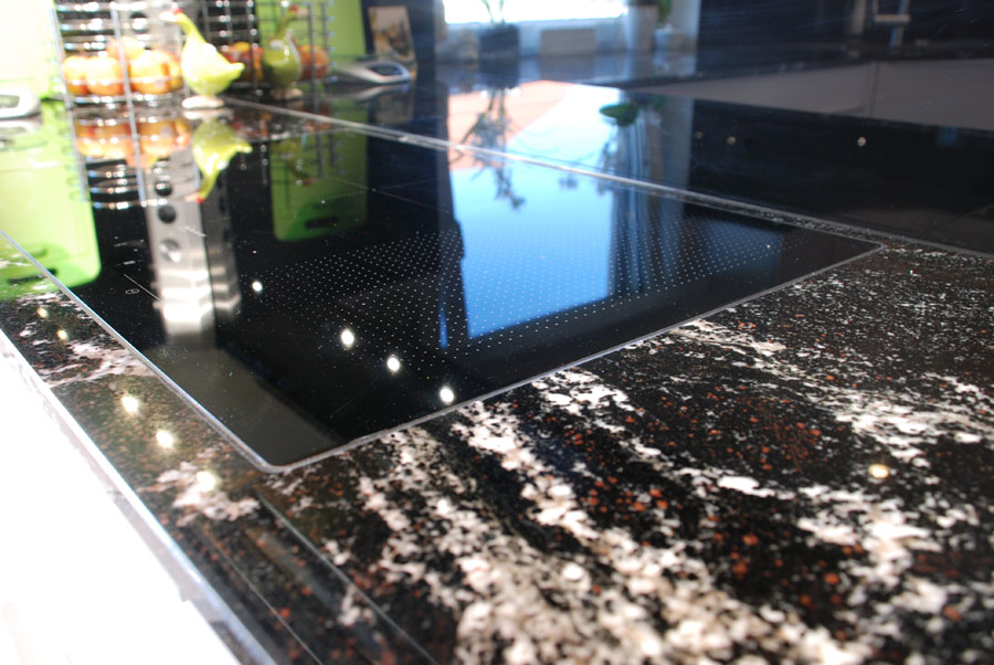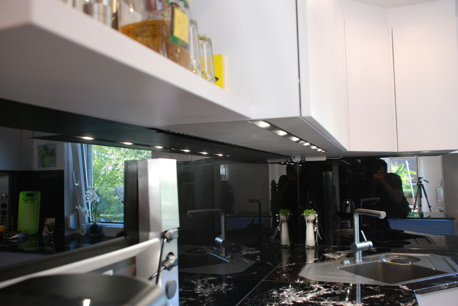 Das Kochfeld und die Spüle sind flächenbündig eingelassen, die Spritzrückwand besteht aus schwarz lackiertem Glas.