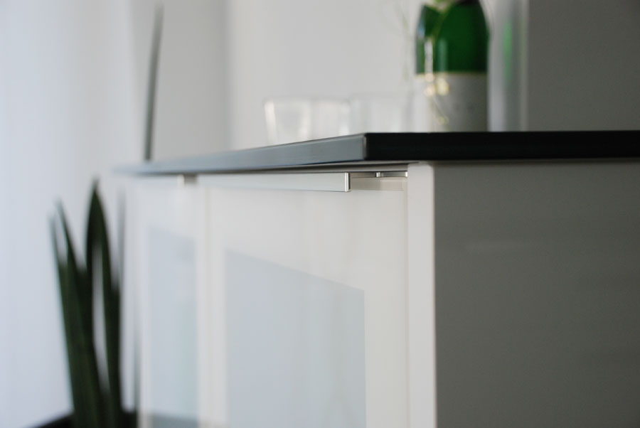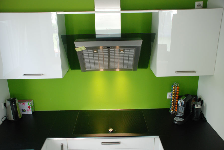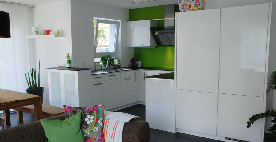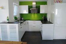 Front in Hochglanz Weiß, dünne schwarze Steinplatte, die Spritzrückwand besteht aus grün lackiertem Glas, Spülbecken und Kochfeld wurden flächenbündig eingelassen, zusätzliches Sideboard links zum Esszimmer, rechts zwei Hochschränke mit Kühlschrank.
