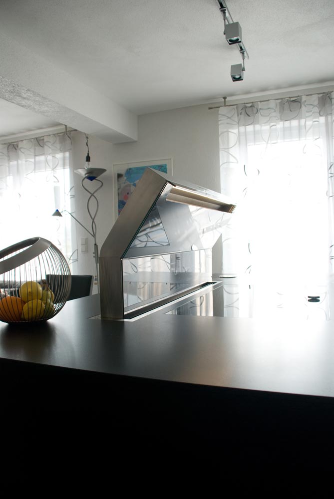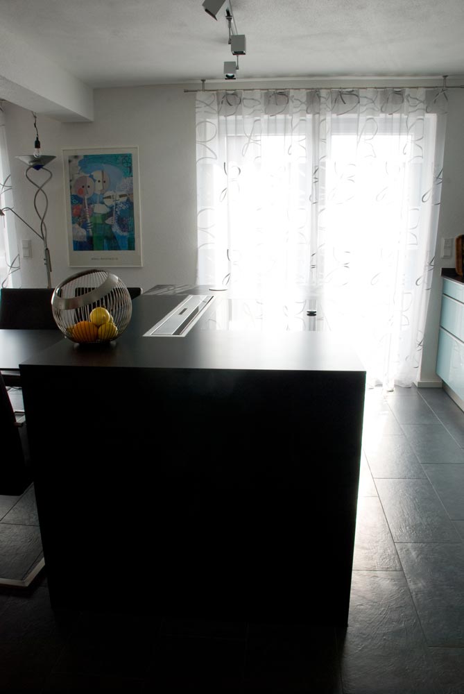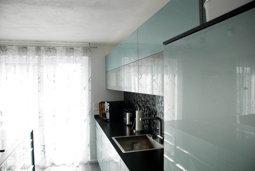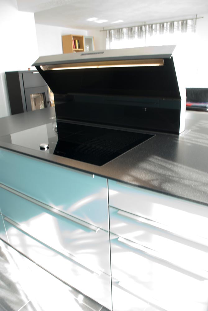 Küche mit Hochglanz Acryl-Fronten. Die Deckplatte besteht aus 12mm starkem Quarzstein. Der Mittelblock, in dem sich der Herd befindet, wurde mit einer Berbel-Tischlifthaube ausgestattet. Die Glasrückwände sind mit einem dezenten Blumen-Muster versehen.