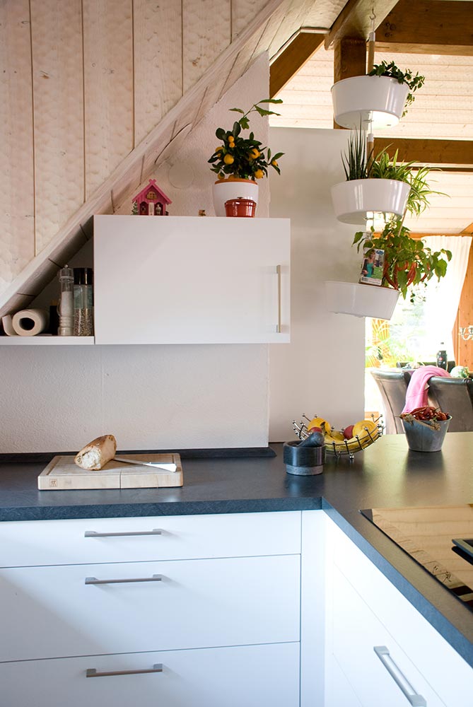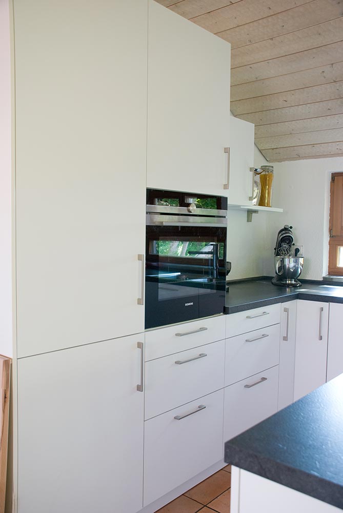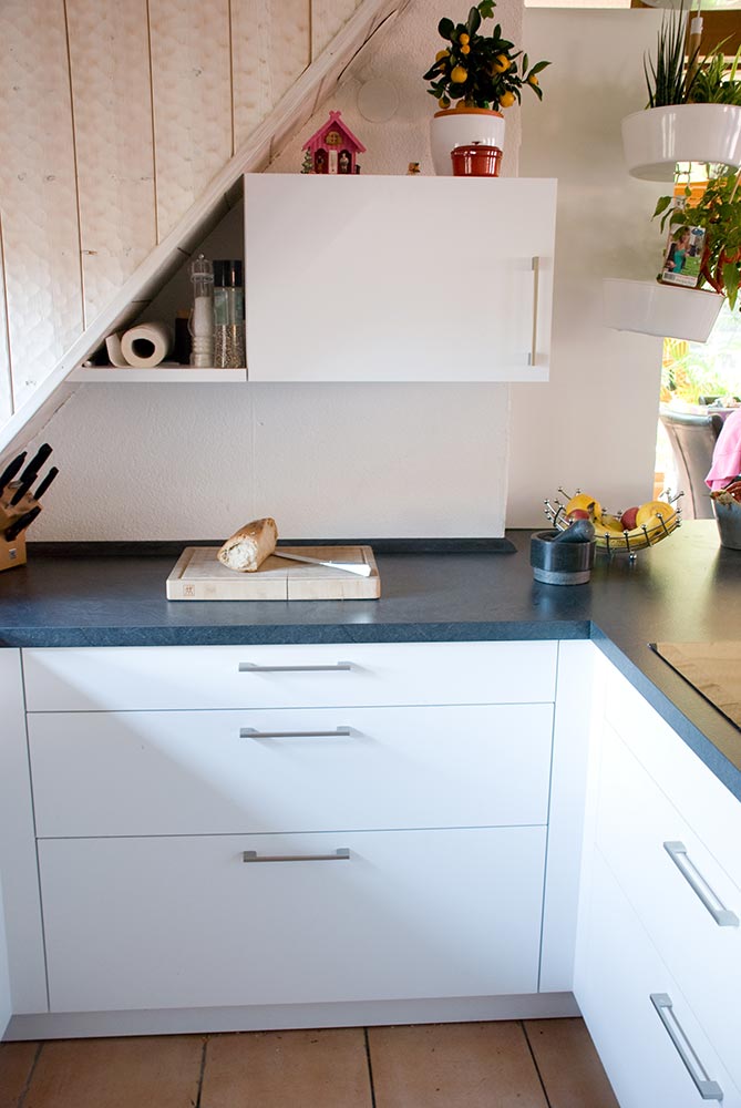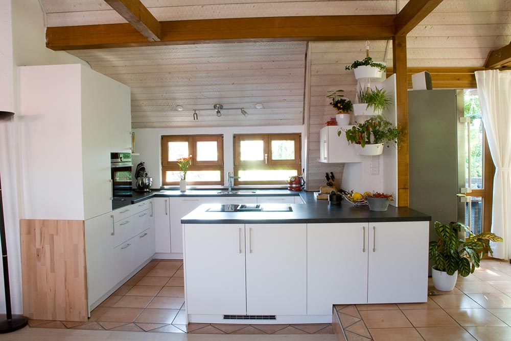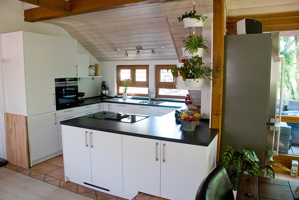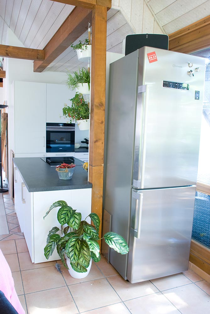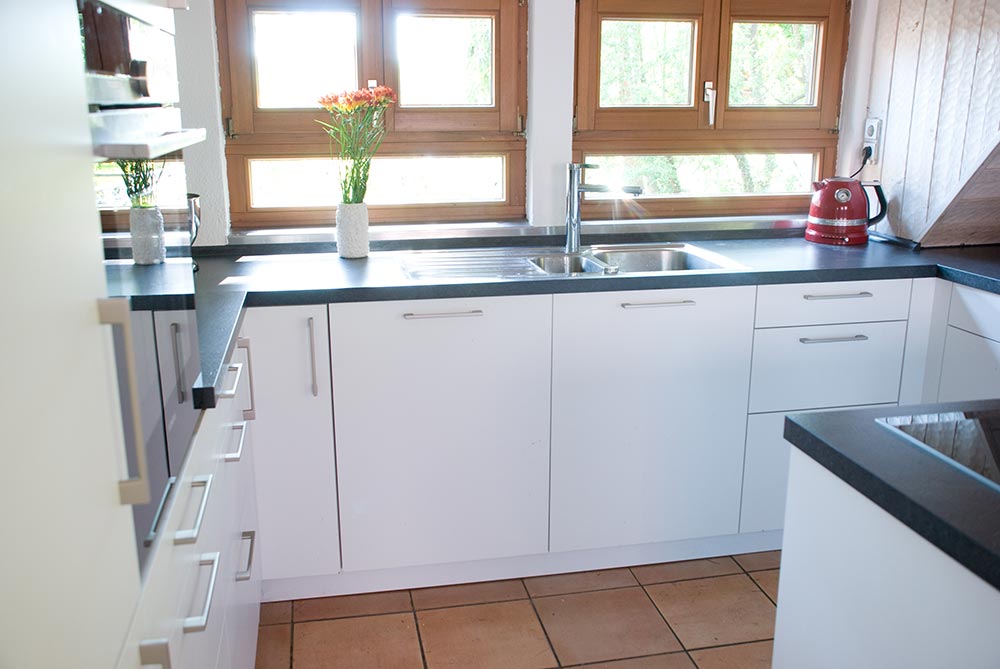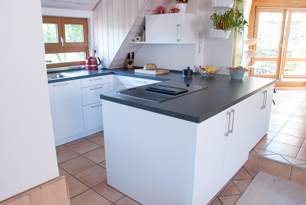 Die Küche wurde mit einer dunklen Steinplatte ausgeführt. Der Standkühlschrank wurde hinter einer Trennwand positioniert.