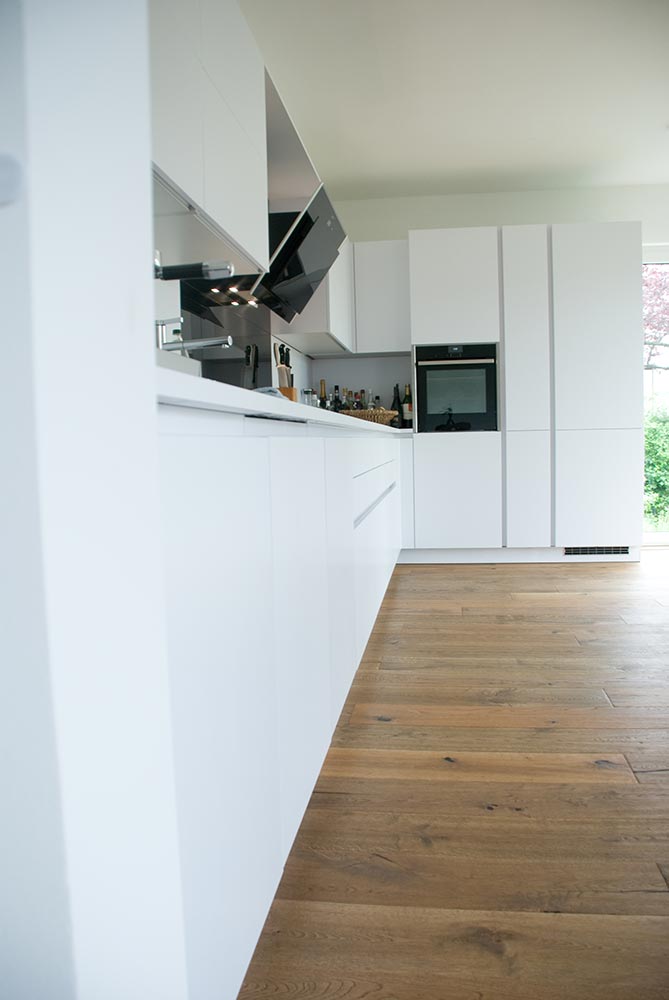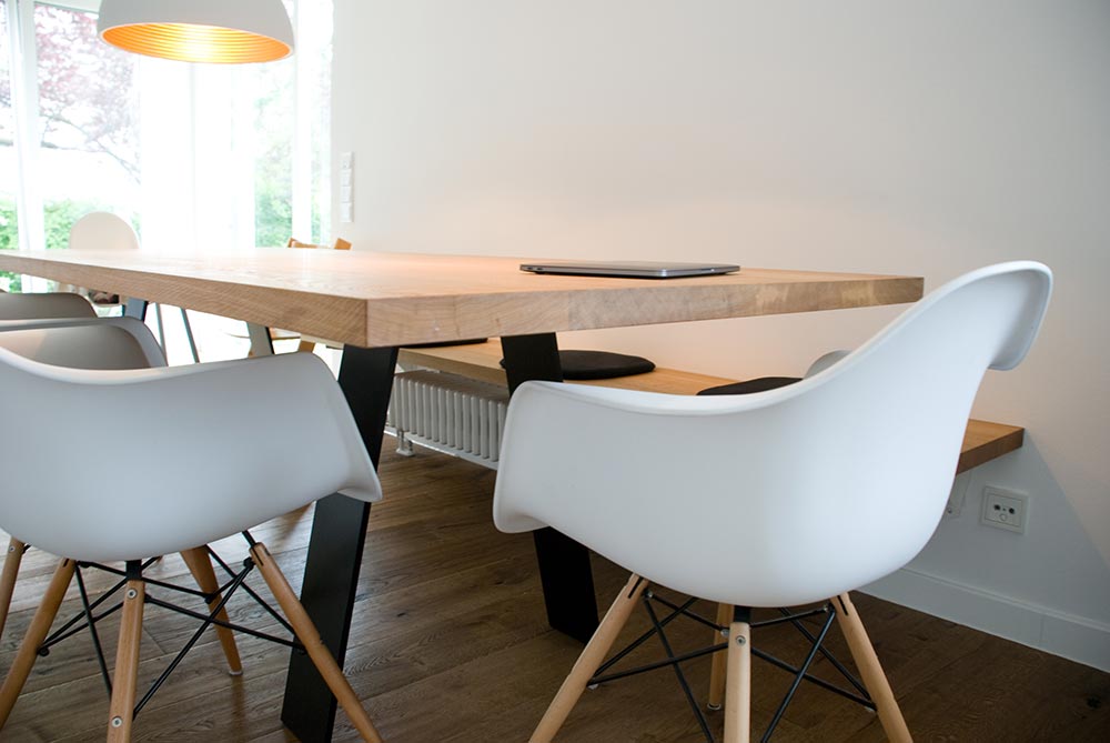 Der Esstisch und die dazugehörige Sitzbank wurden in Eiche ausgeführt. Das Material wurde gebürstet und geölt. Die Sitzbank wurde auf einem Winkel an der Wand befestigt.