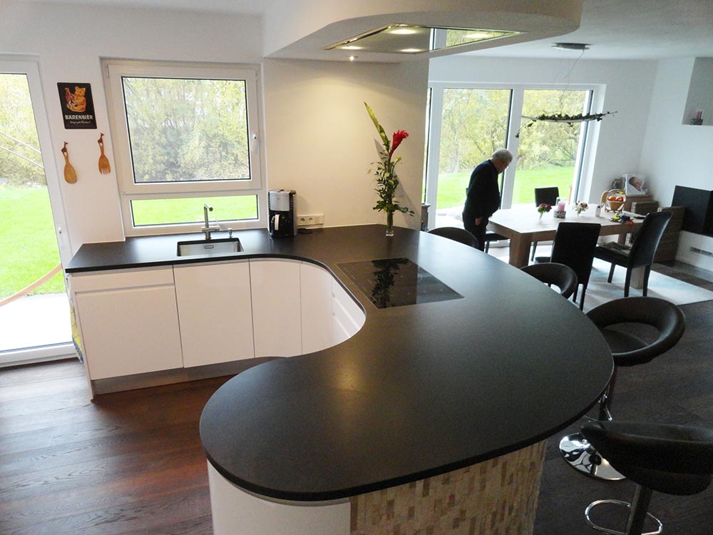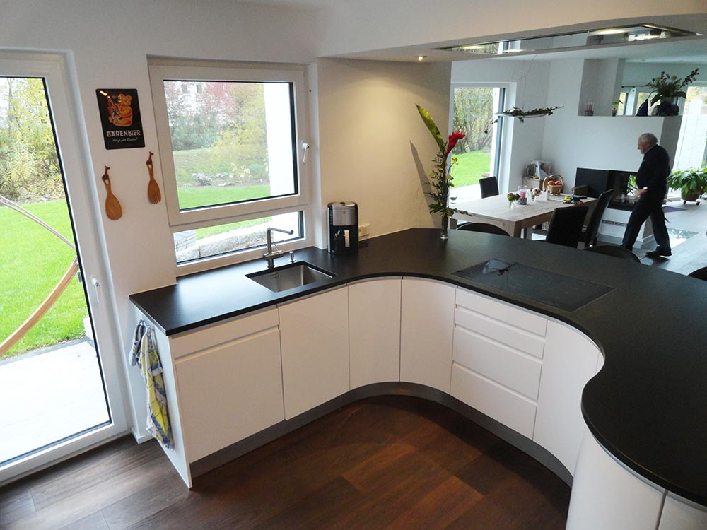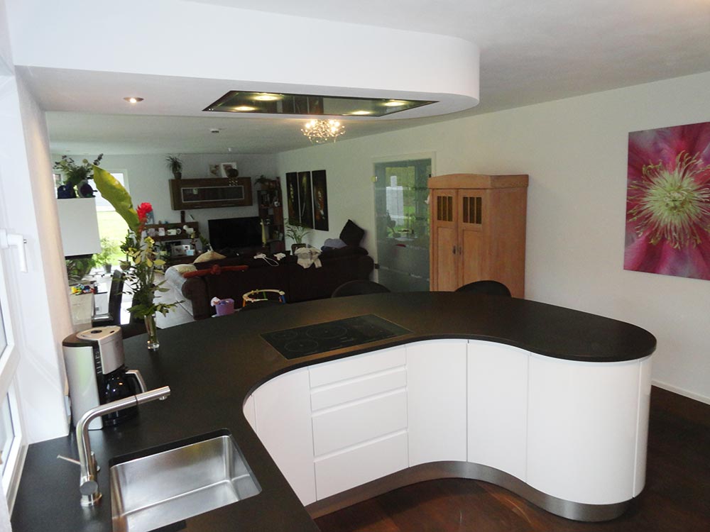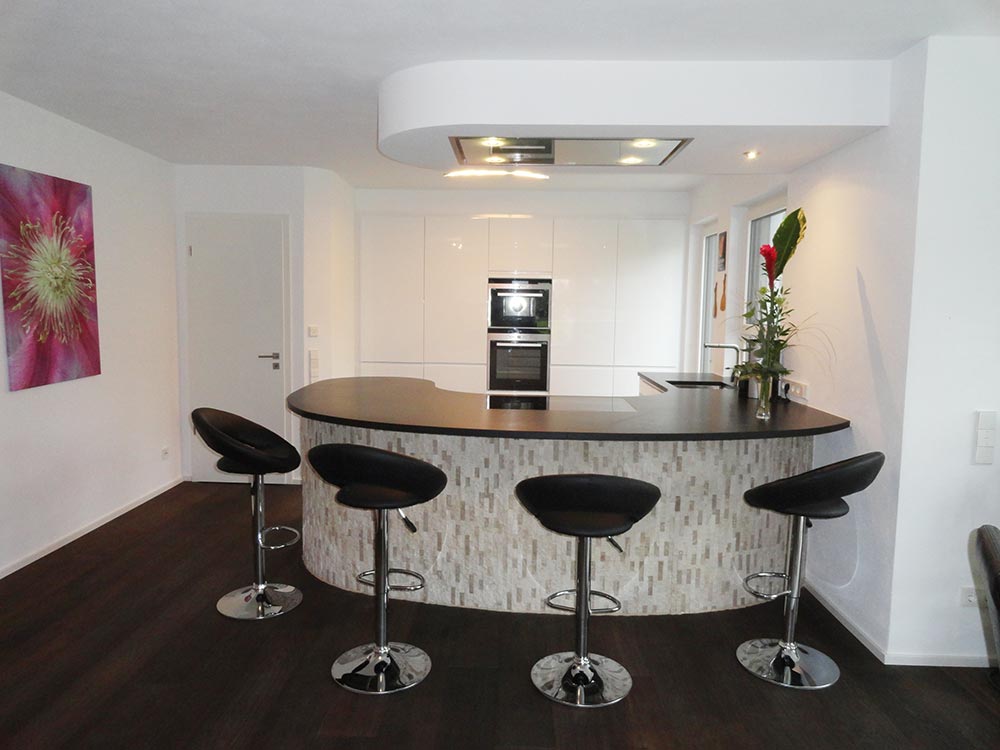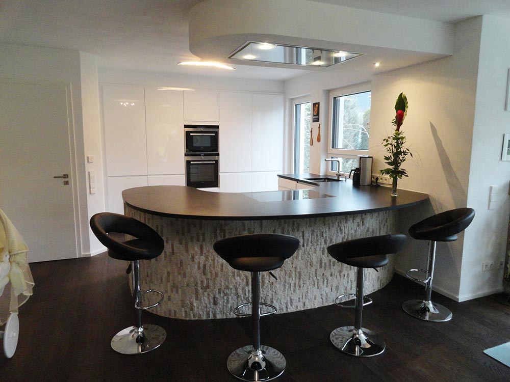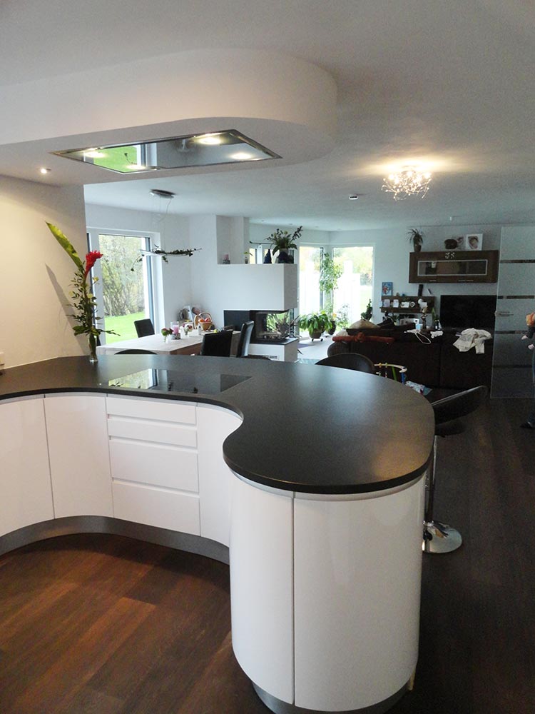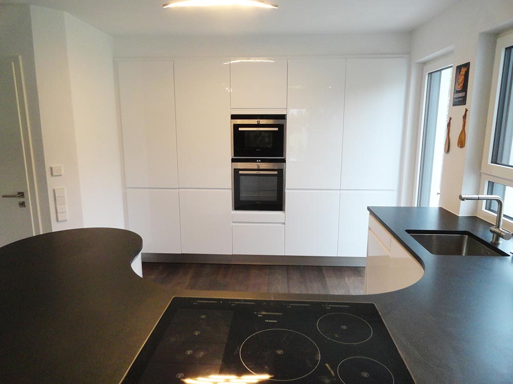 Küche in Hochglanz Lack mit integriertem Griff in der Front. Besonderheit dieser Küche sind die Rundungen der Schränke und Arbeitsplatte. Die Arbeitsplatte besteht aus 30 mm starkem Naturstein. Im Deckenkasten wurde eine Gutmann Deckenhaube verbaut.