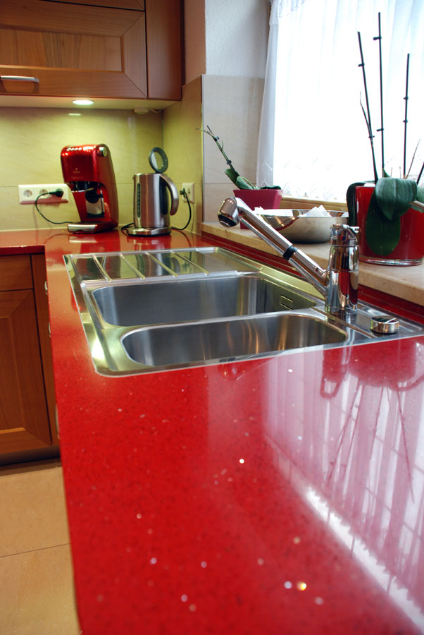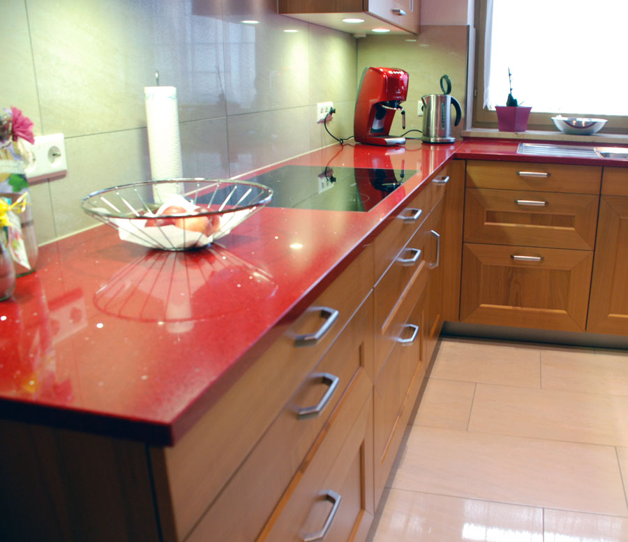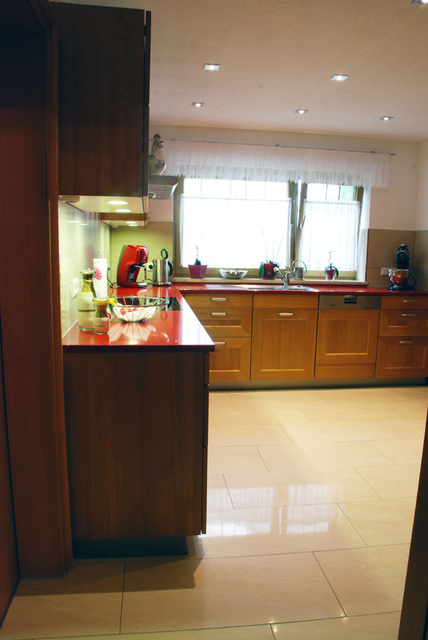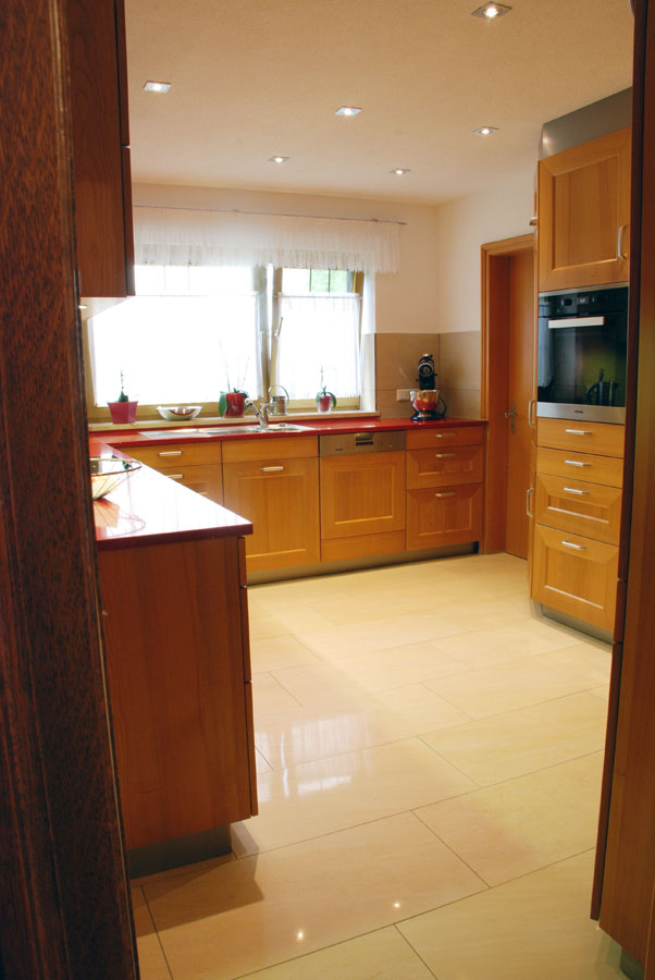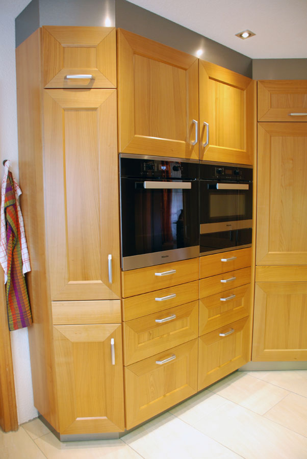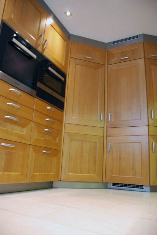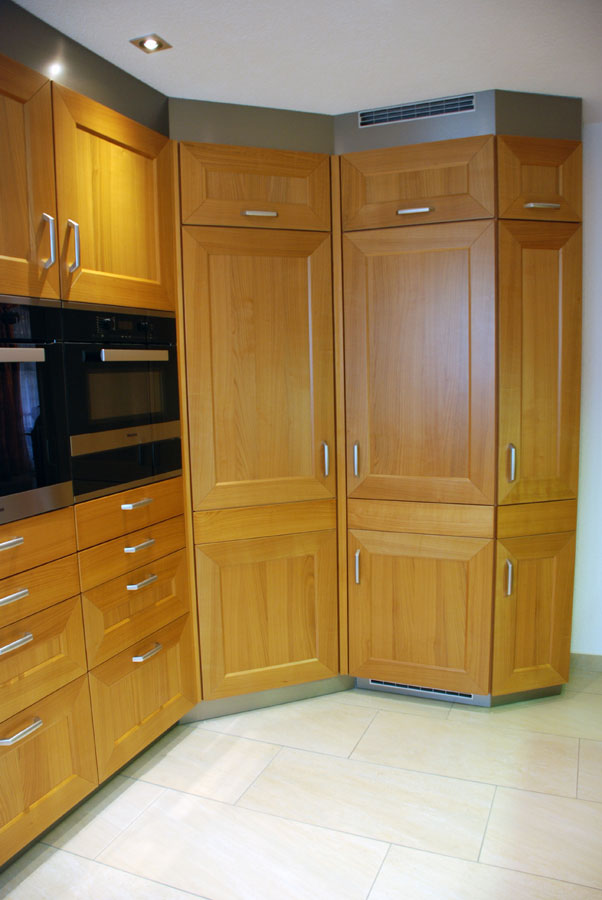 Rahmenfronten aus amerikanischem Kirschbaum natur, lackiert, der Sockel und die Deckenblenden sind mit edelstahl belegt.