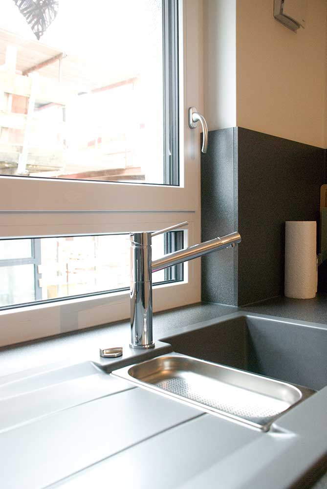 Die Fronten der Küche sind in Steinoptik und weiß gehalten. Außerdem wurde sie mit einer Steinplatte und Rückwänden aus Stein bis in die Fensterlaibung ausgestattet. Zusätzlich wurden im Eingangsbereich Einbauschränke, ein Sideboard und eine Garderobe integriert.