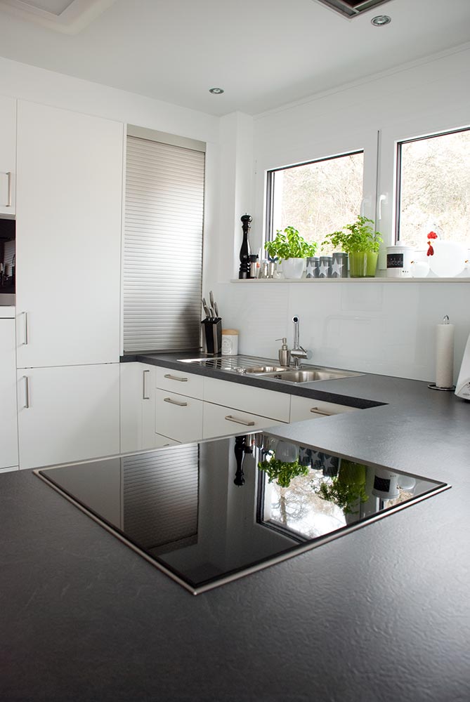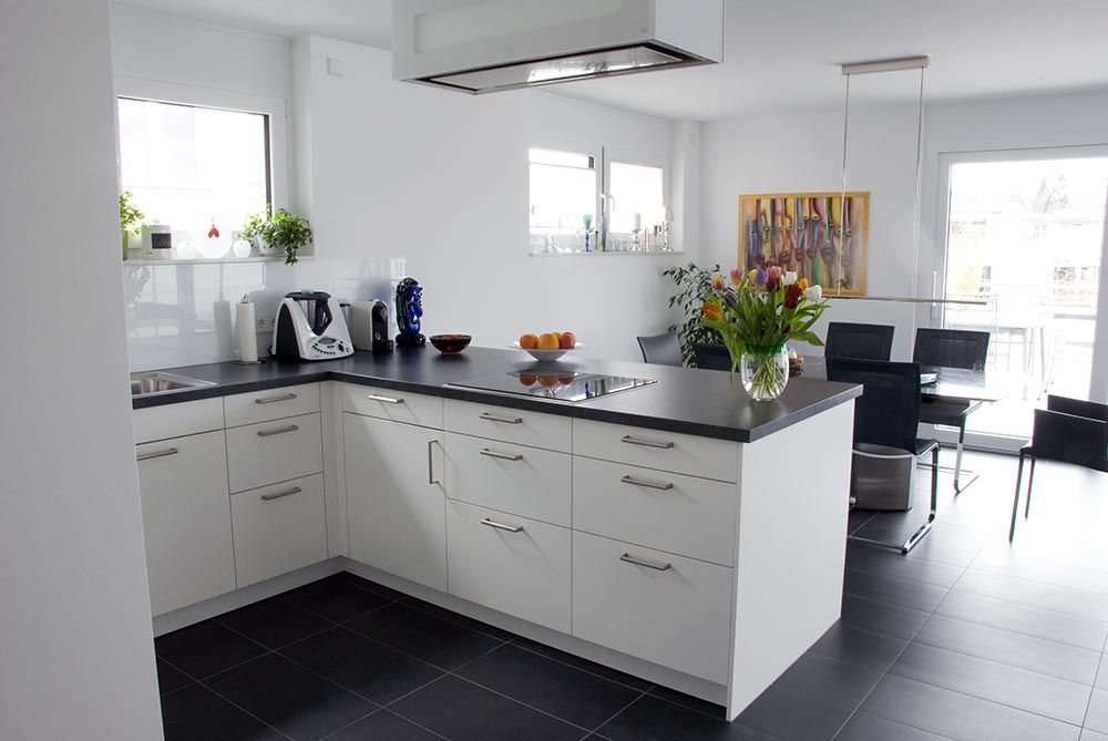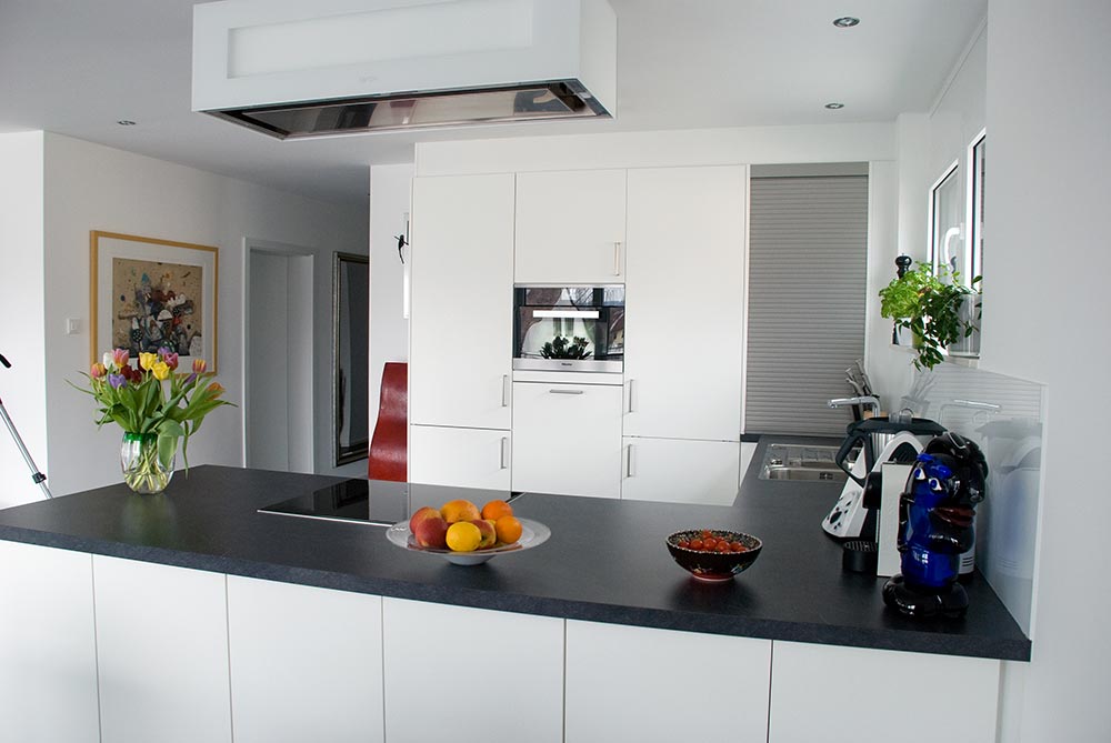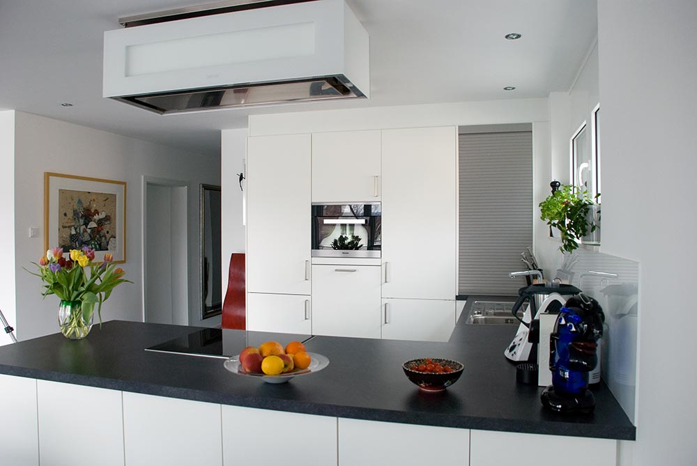 Die Oberflächen der Küche sind weiß matt lackiert, die Arbeitsplatte besteht aus Stein. Der Dunstabzug ist von der Decke absenkbar. Es wurde ein Rollladenschrank verbaut, um die Ecknische besser nutzen zu können.