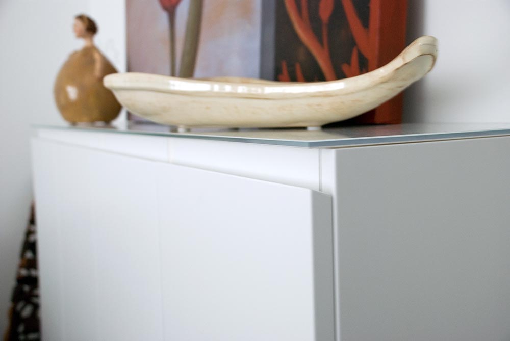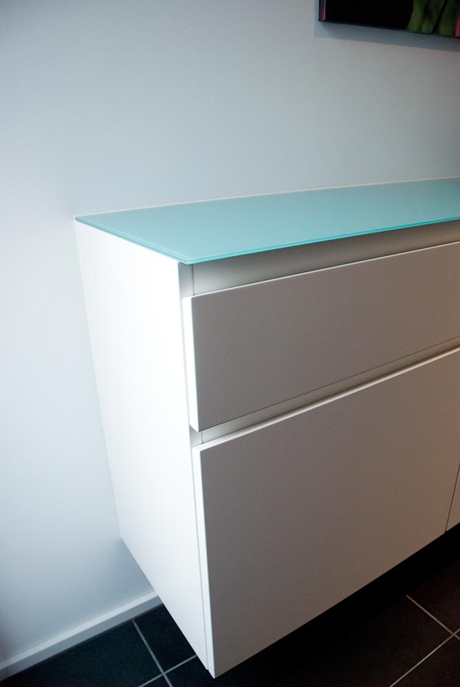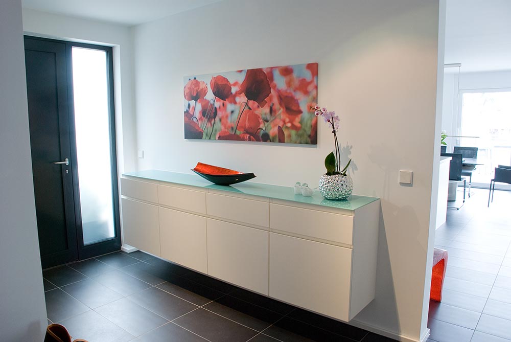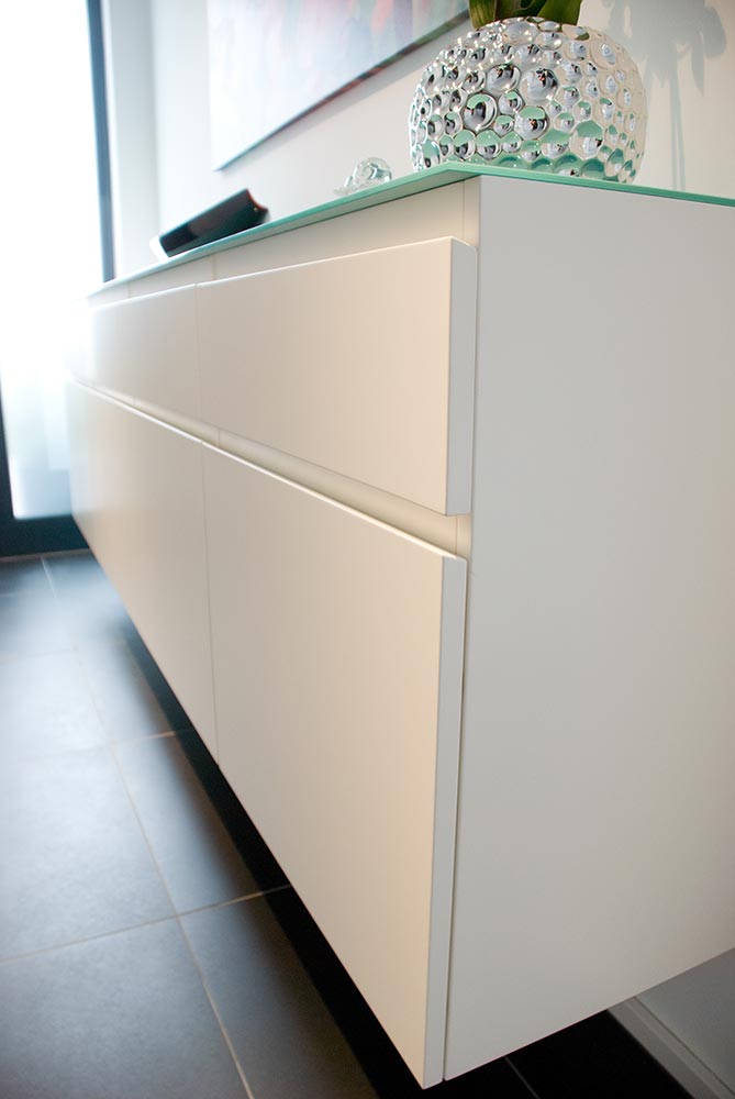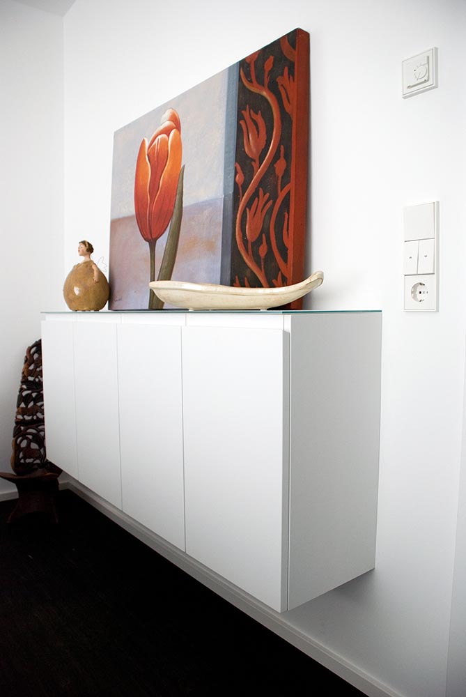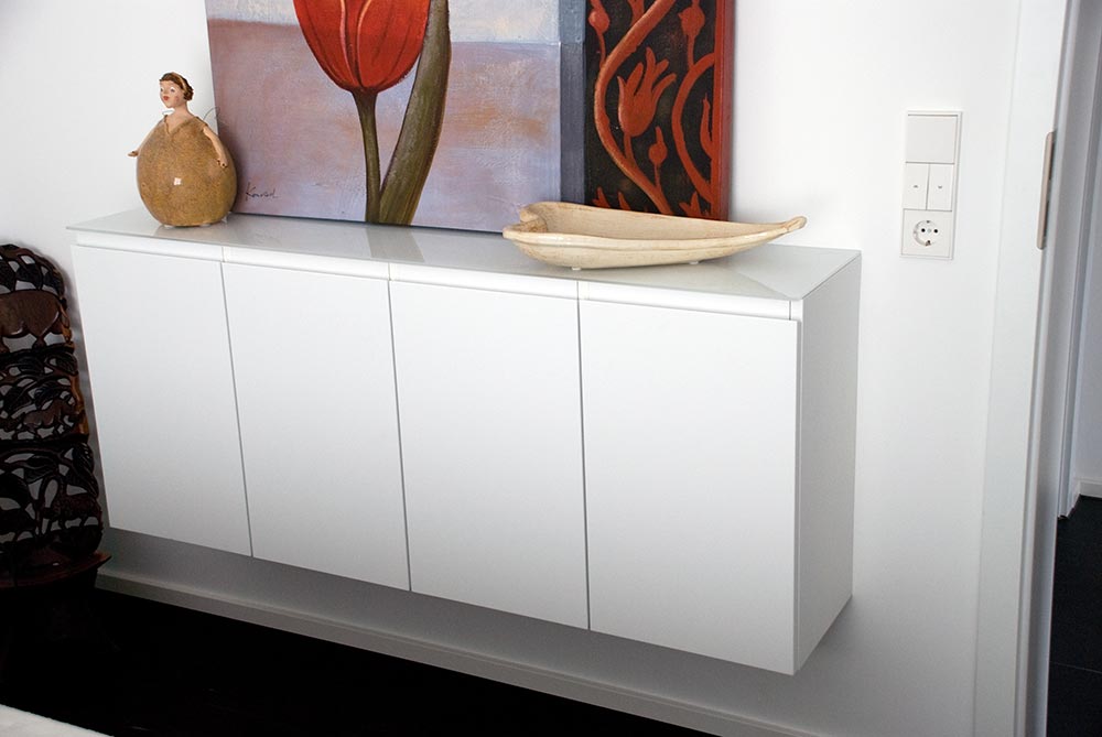 Im Schlafzimmer wurde ein frei hängendes Sideboard integriert. Im Flur wurde ebenfalls ein frei hängendes Sideboard angebracht, die Deckplatte wurde hier mit einer rückseitig grün lackiertem Glasplatte versehen. Bei beiden Sideboards wurden die Oberflächen weiß matt lackiert. Die Schubkästen sind über Griffschrägen oben zu öffnen.
