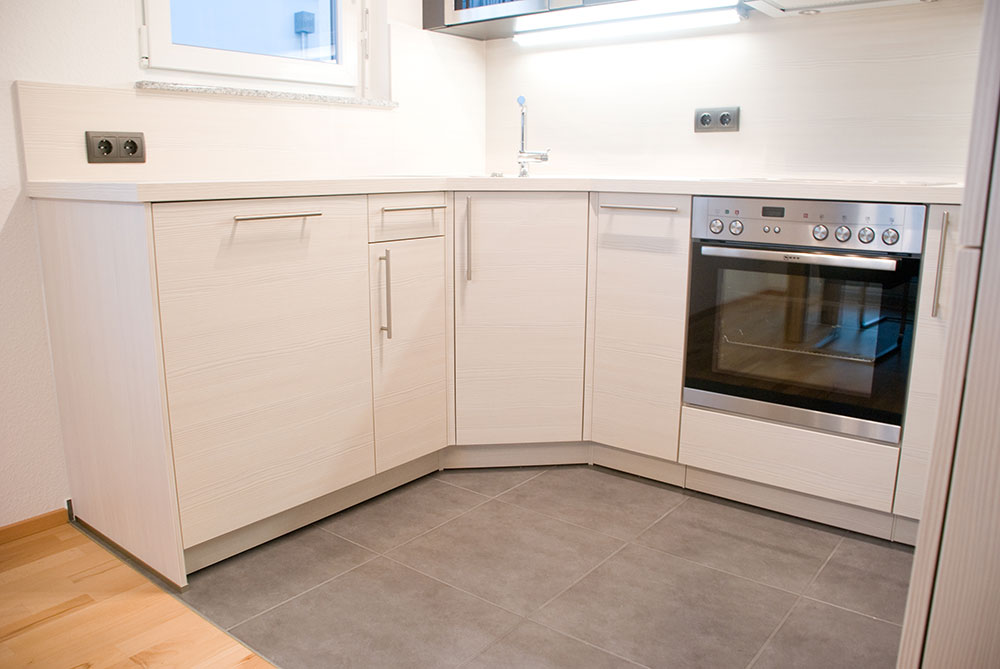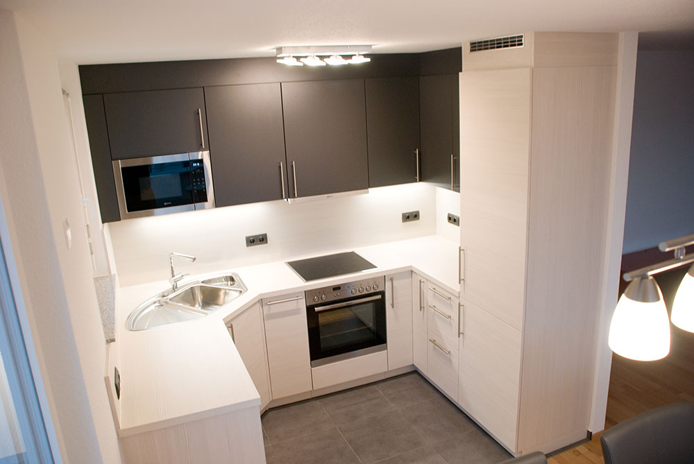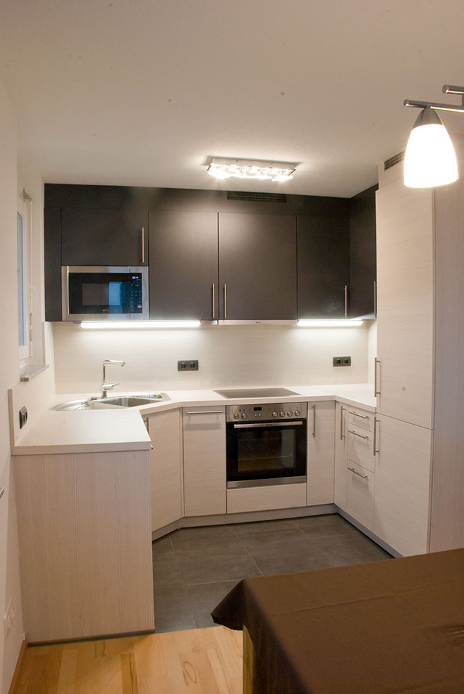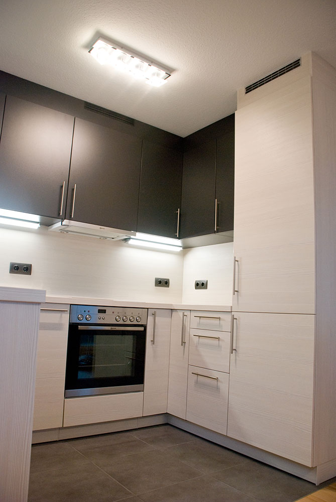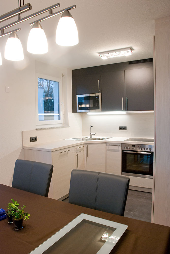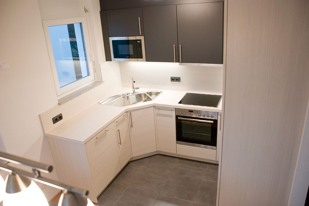 Küchenniesche in Dunkelgrau und Holznachbildung